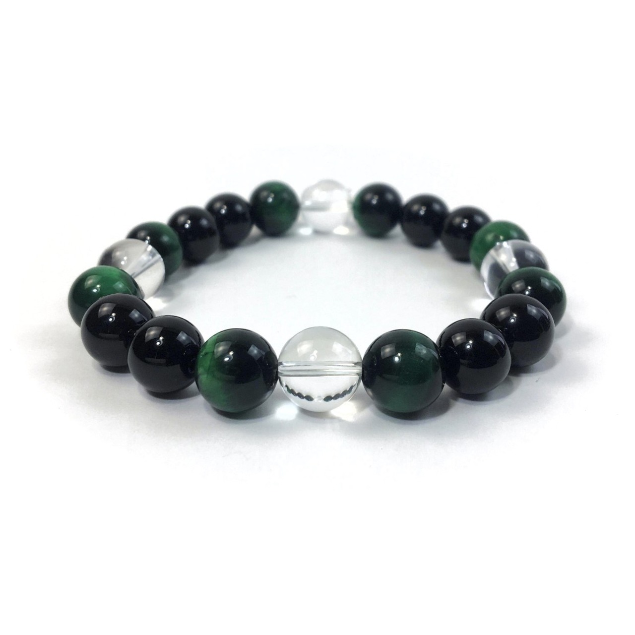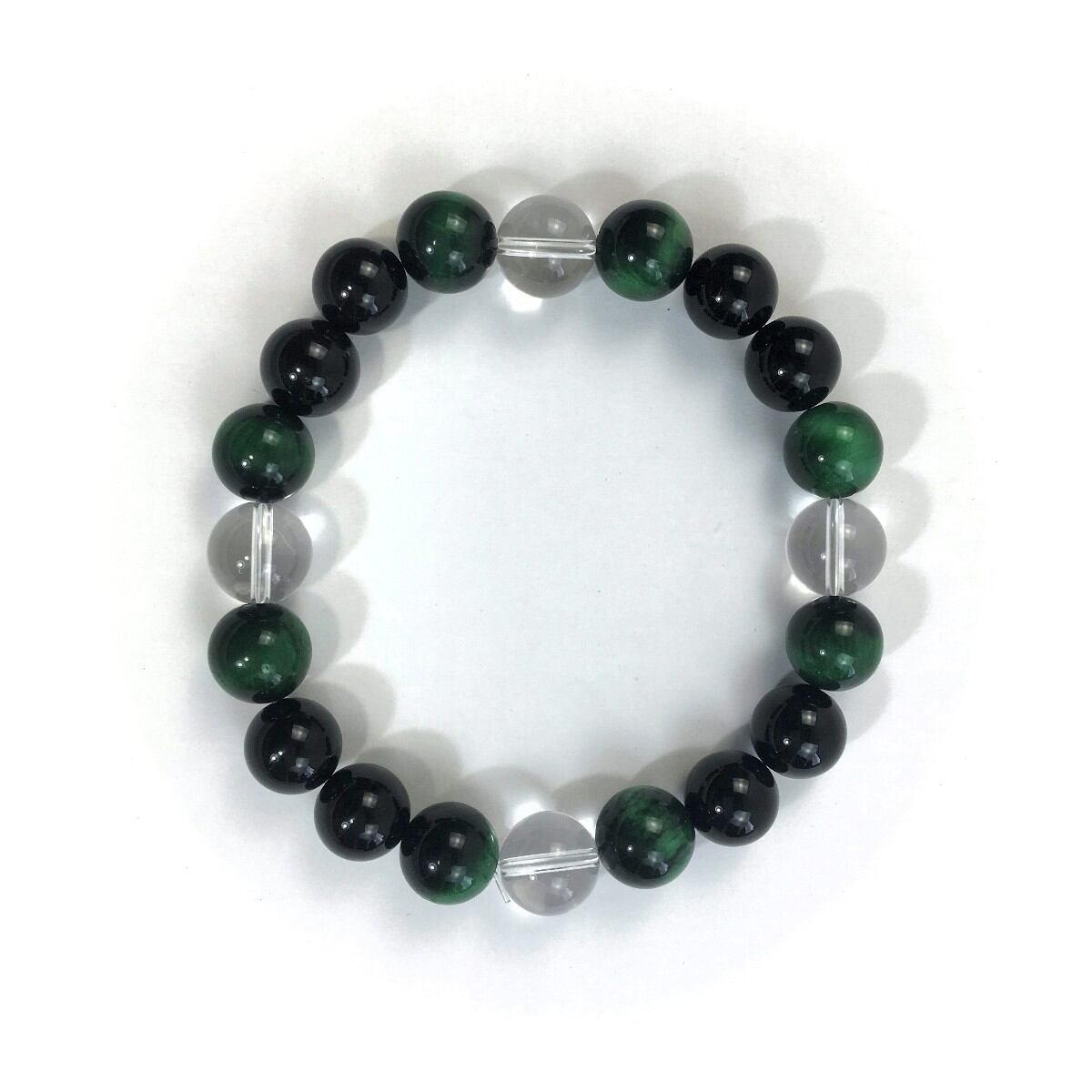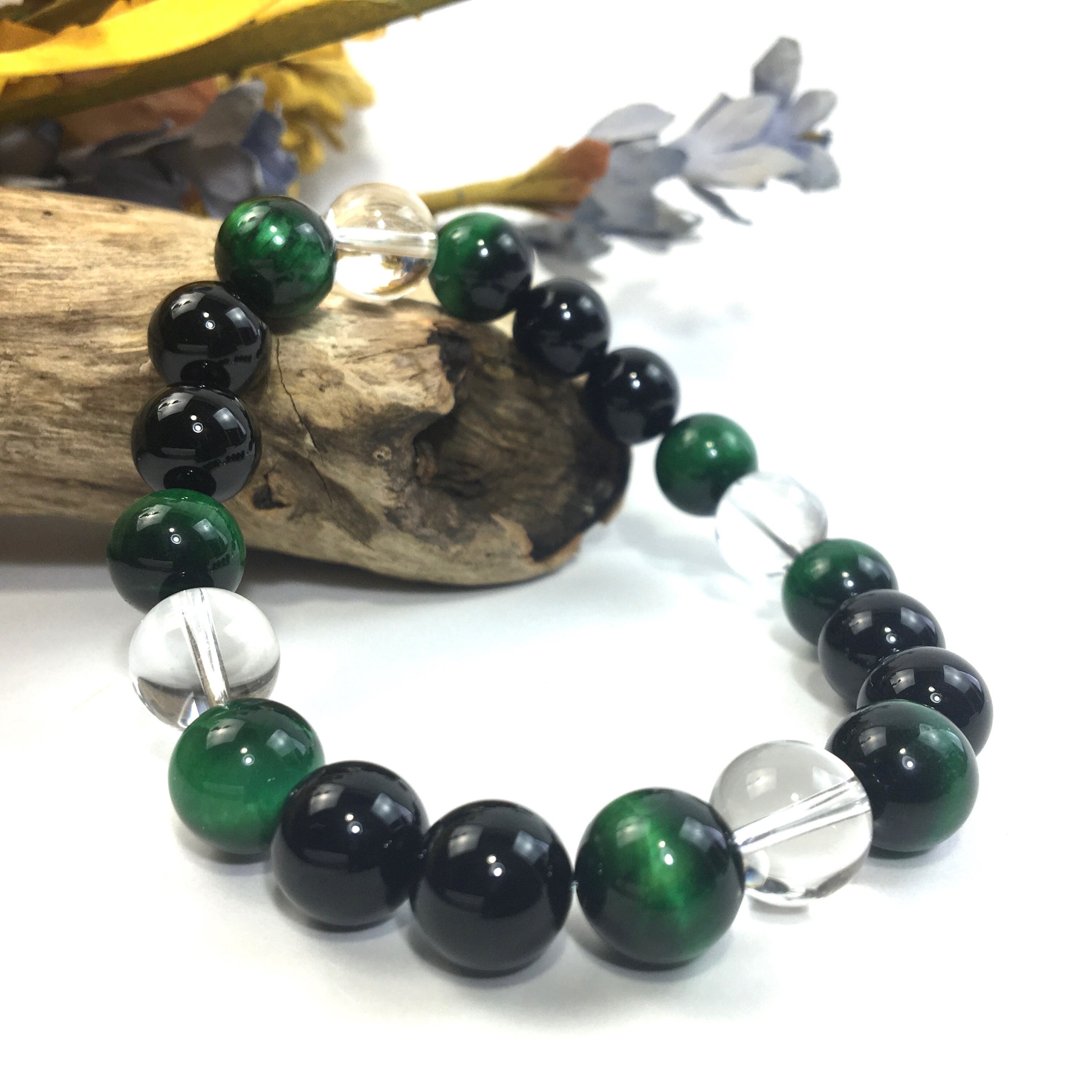 こちらは、水晶とグリーンタイガーアイとオニキス使用したパワーストーンブレスレットです。今回はパーツは使わずシンプルに石のみでデザインしてあります。パーツを使っていないので金属アレルギーの方などにもオススメできるブレスレットです。石の大きさは全て10mm玉を使用して内径約17cmです。数に限りがございますので気になる方はお早めにどうぞ。