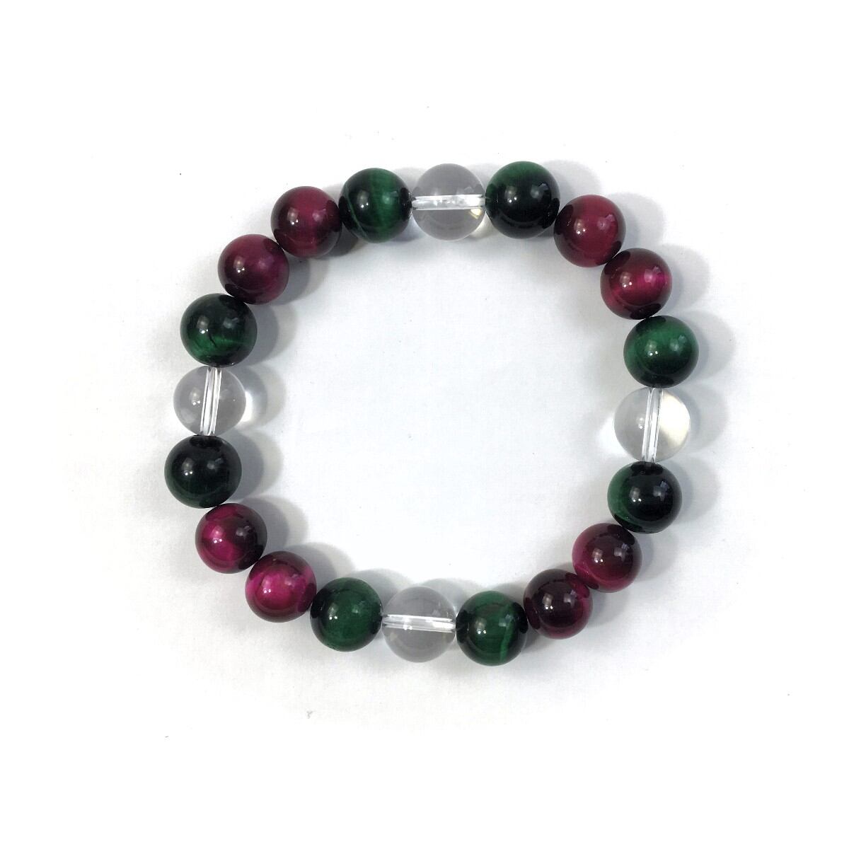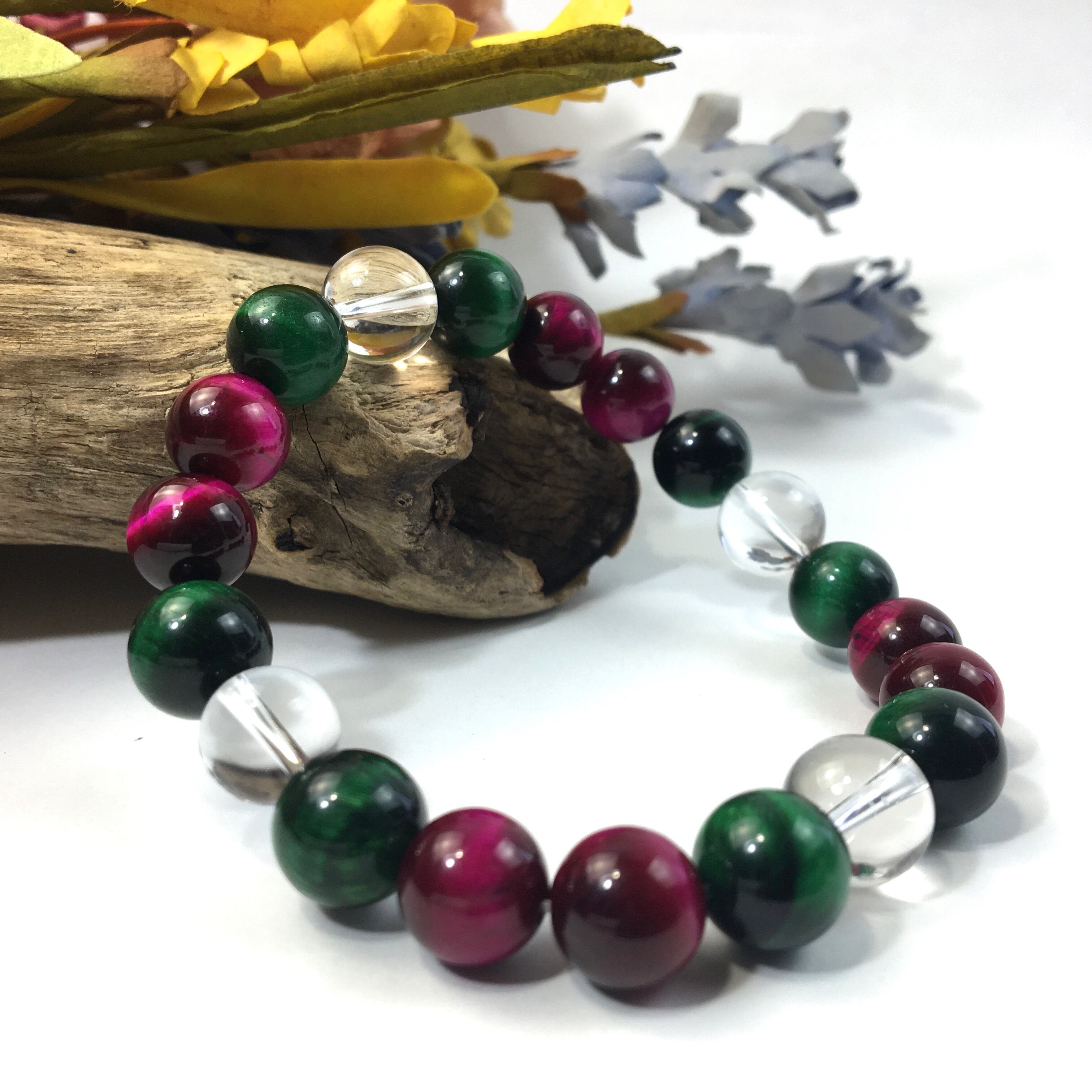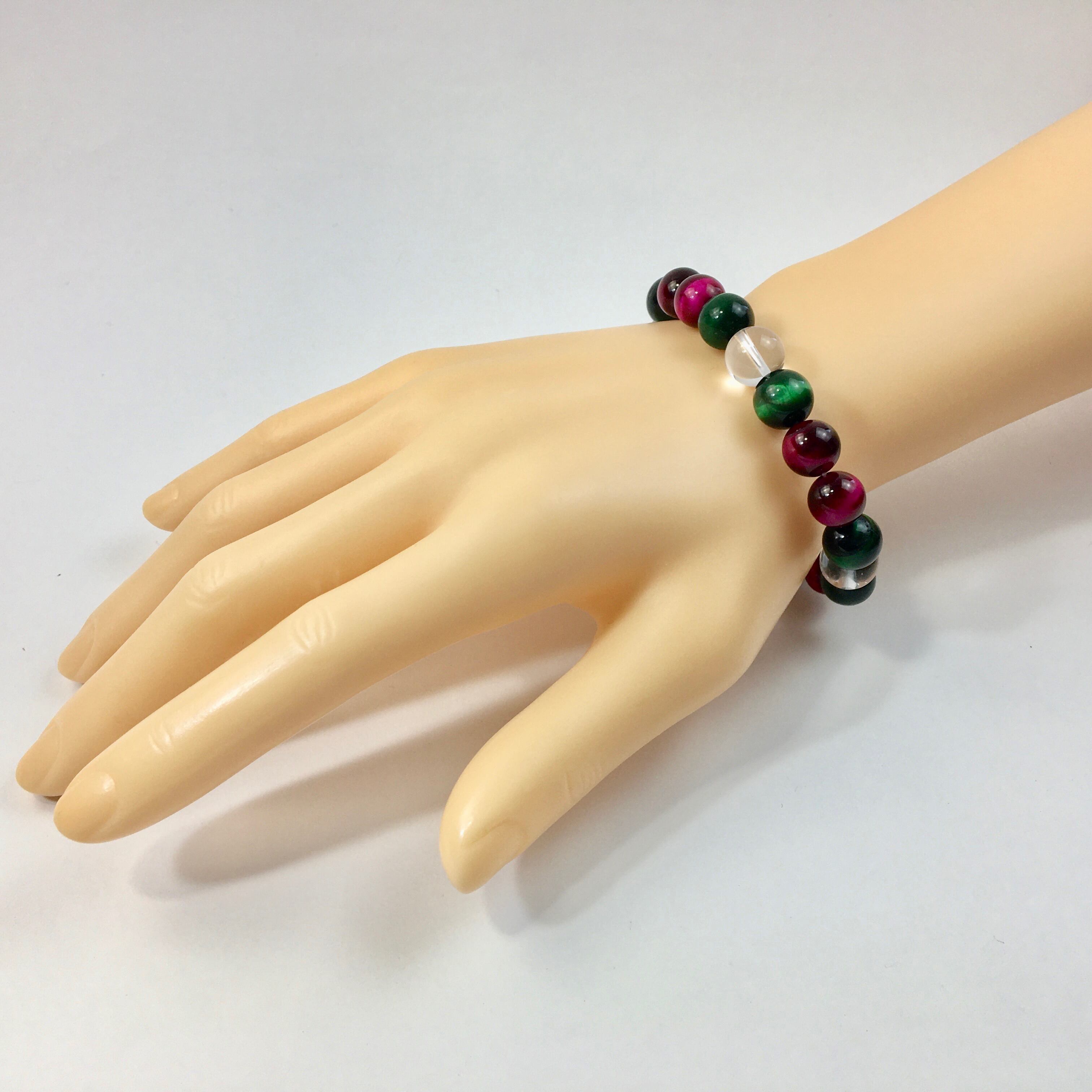 こちらは、水晶とグリーンタイガーアイとピンクタイガーアイを使用したパワーストーンブレスレットです。今回はパーツは使わずシンプルに石のみでデザインしてあります。パーツを使っていないので金属アレルギーの方などにもオススメできるブレスレットです。石の大きさは全て10mm玉を使用して内径約17cmです。数に限りがございますので気になる方はお早めにどうぞ。