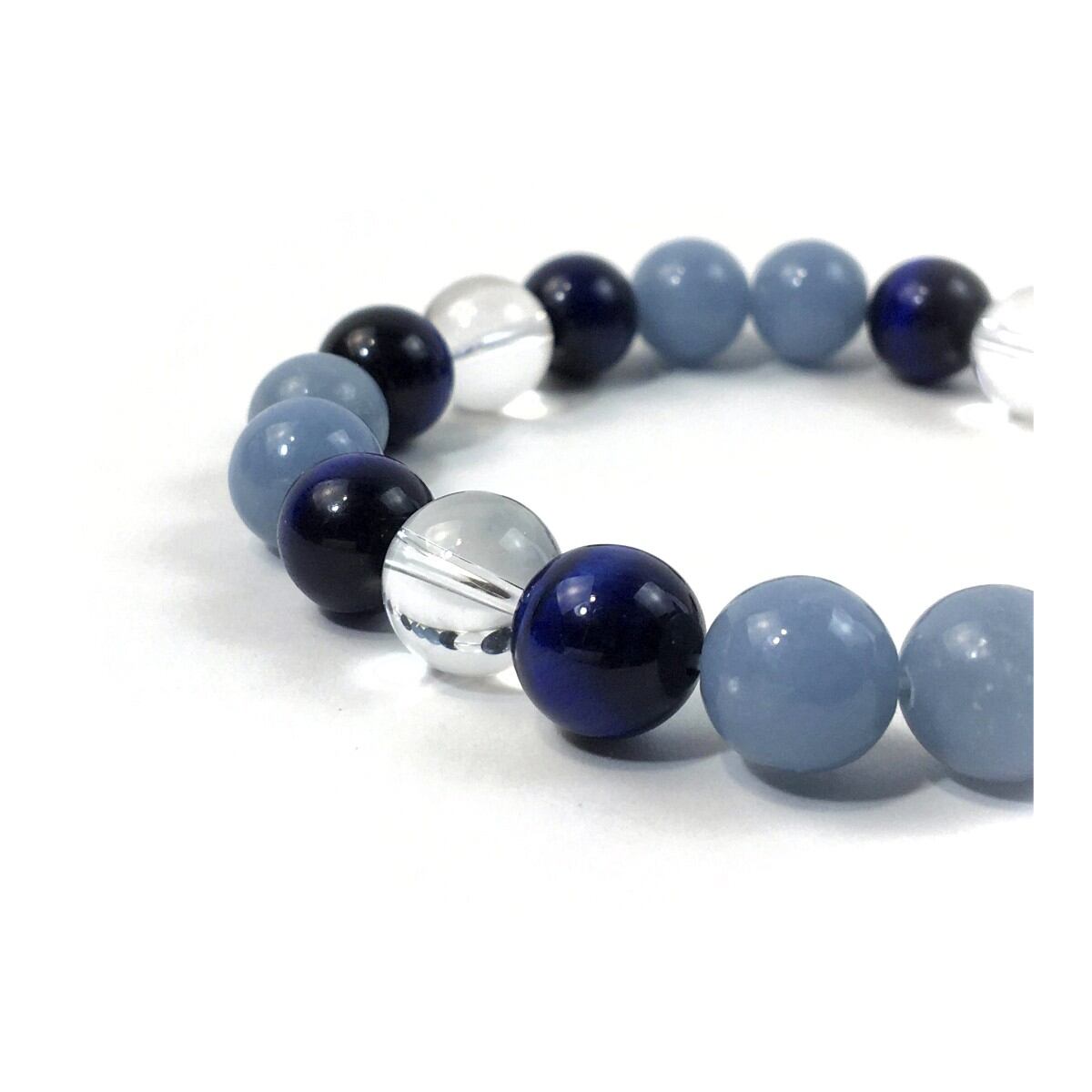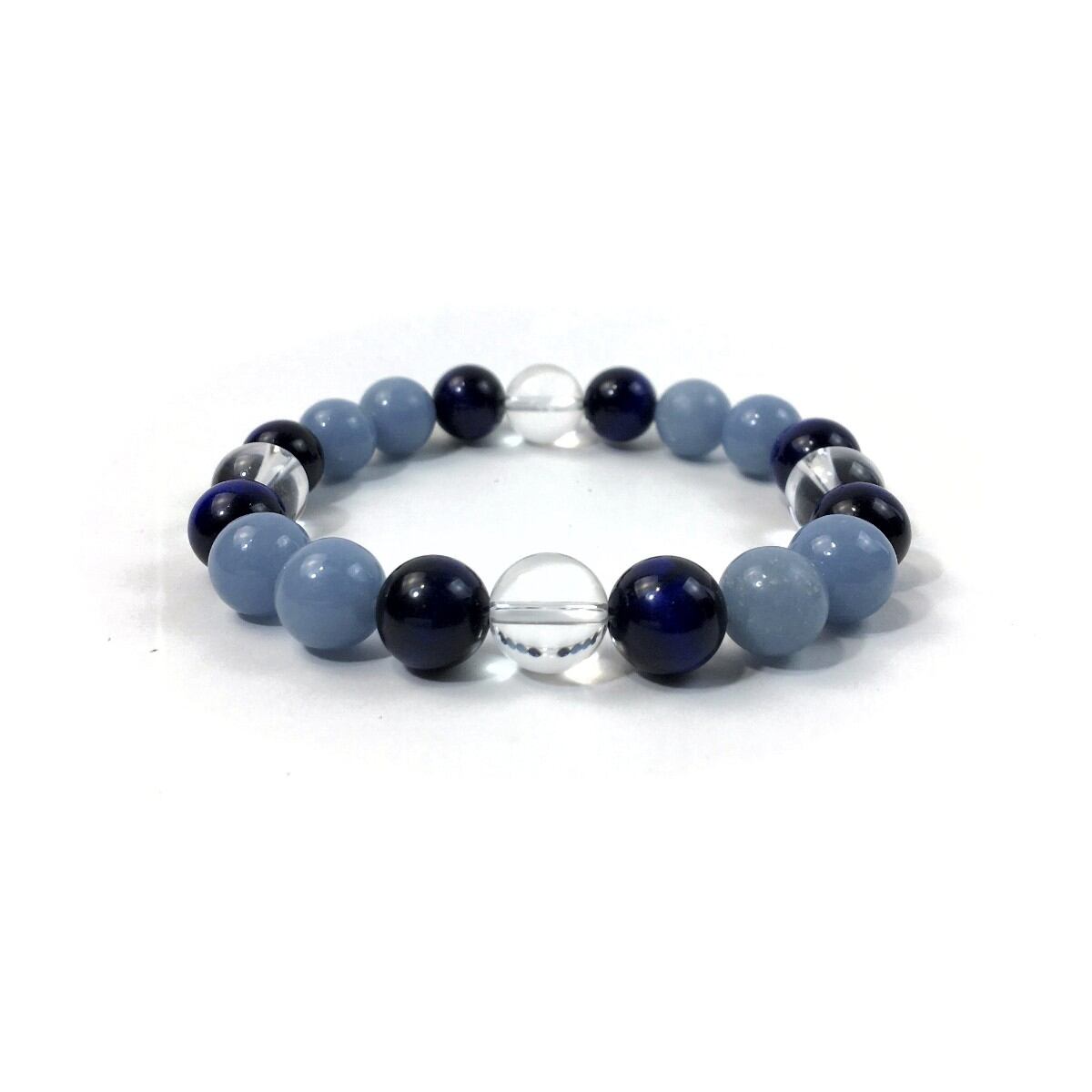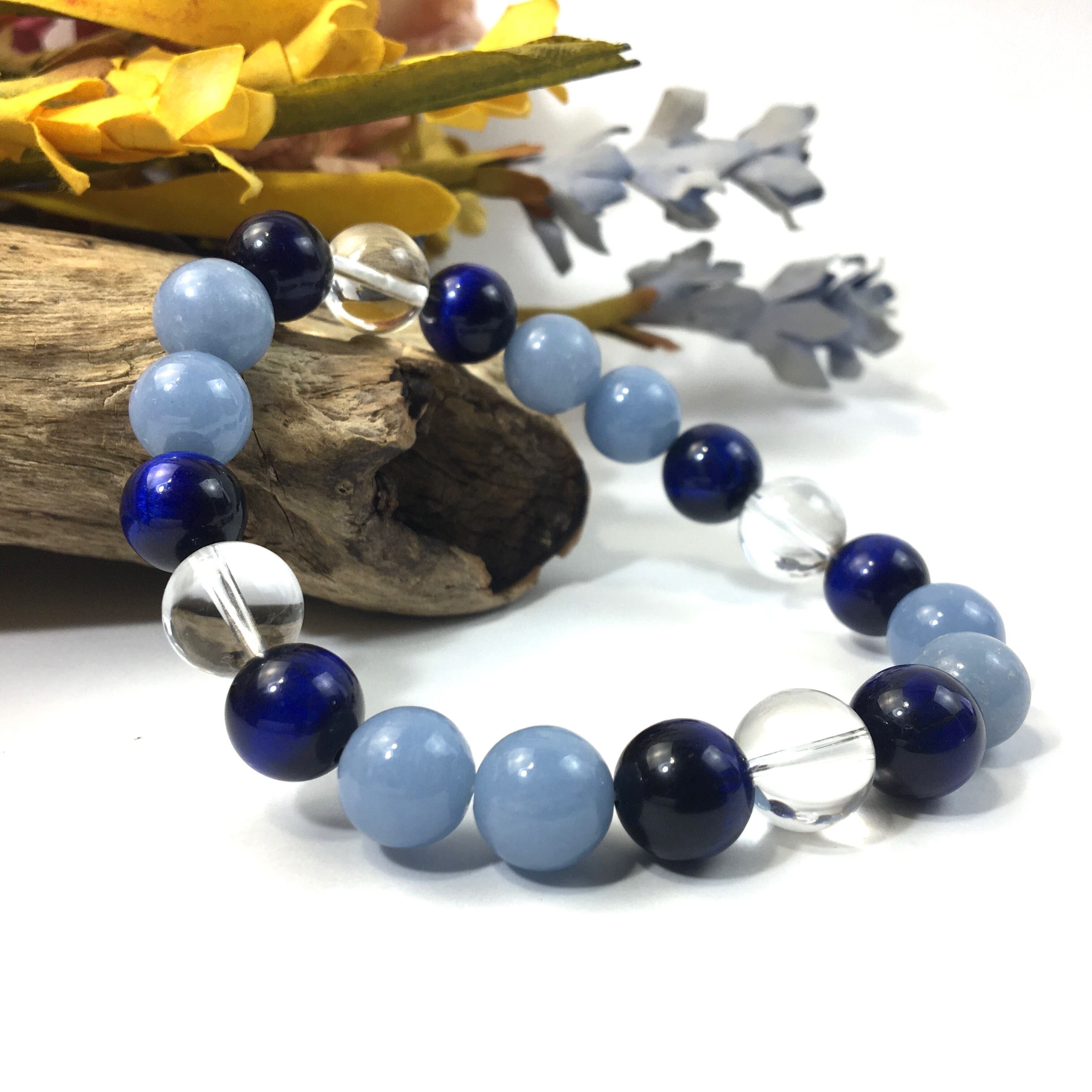 こちらは、水晶とブルータイガーアイとエンジェライトを使用したパワーストーンブレスレットです。今回はパーツは使わずシンプルに石のみでデザインしてあります。パーツを使っていないので金属アレルギーの方などにもオススメできるブレスレットです。石の大きさは全て10mm玉を使用して内径約17cmです。数に限りがございますので気になる方はお早めにどうぞ。