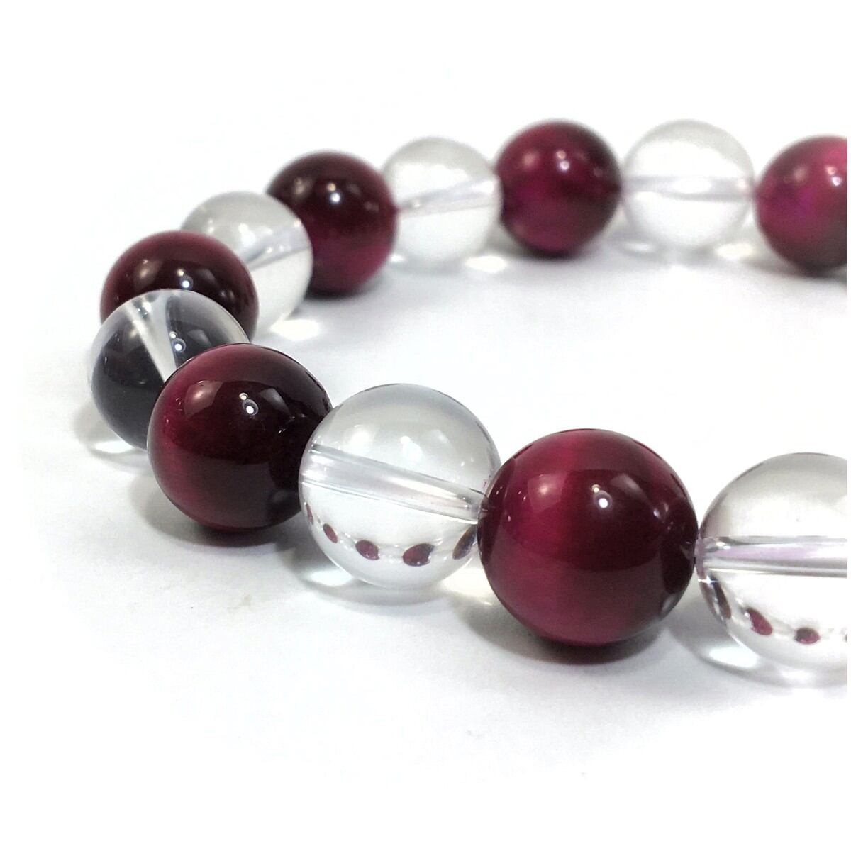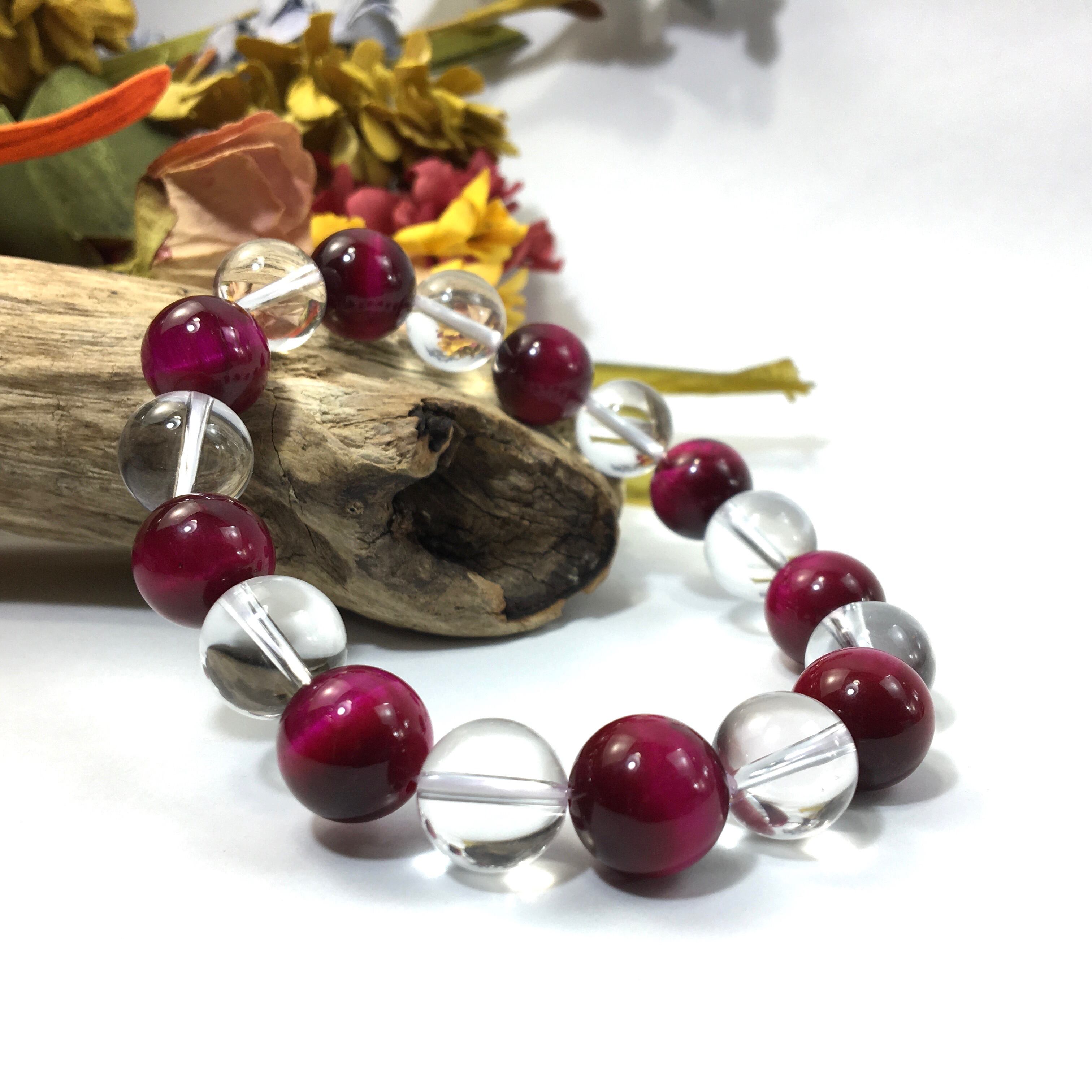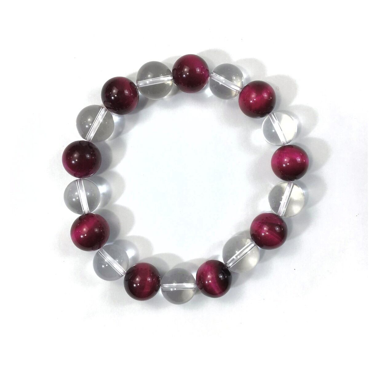 こちらは、水晶とピンクタイガーアイを交互に組み合わせたパワーストーンブレスレットです。シンプルなデザインですのでどんなコーディネートとも合わせ易いブレスレットです。程よくインパクトがある12mm玉を使用して内周約18cmです。数に限りがございますので気になる方はお早めにどうぞ。
