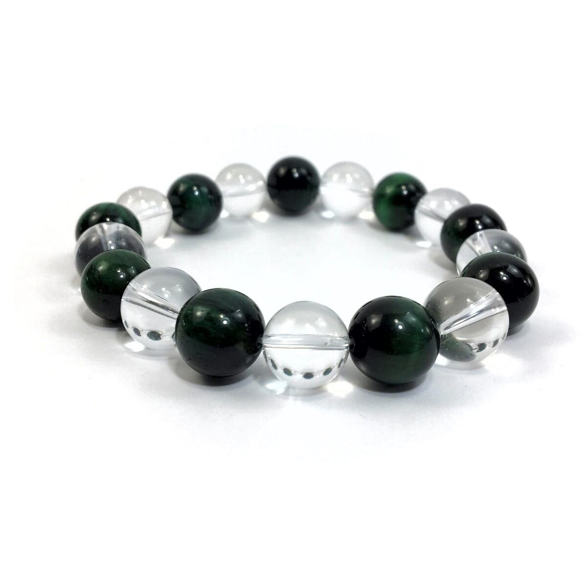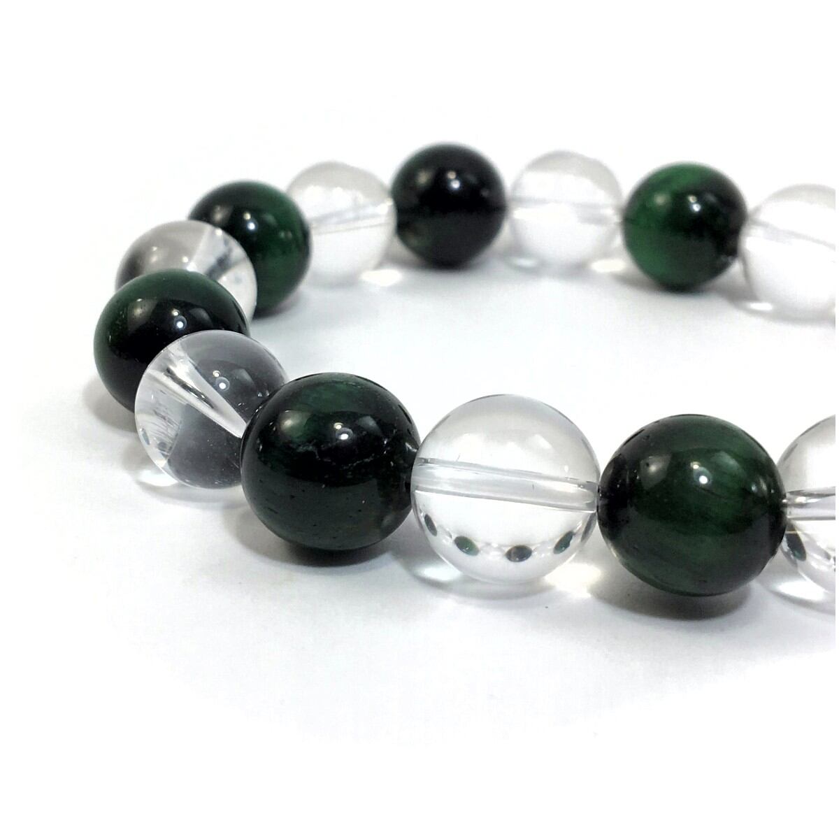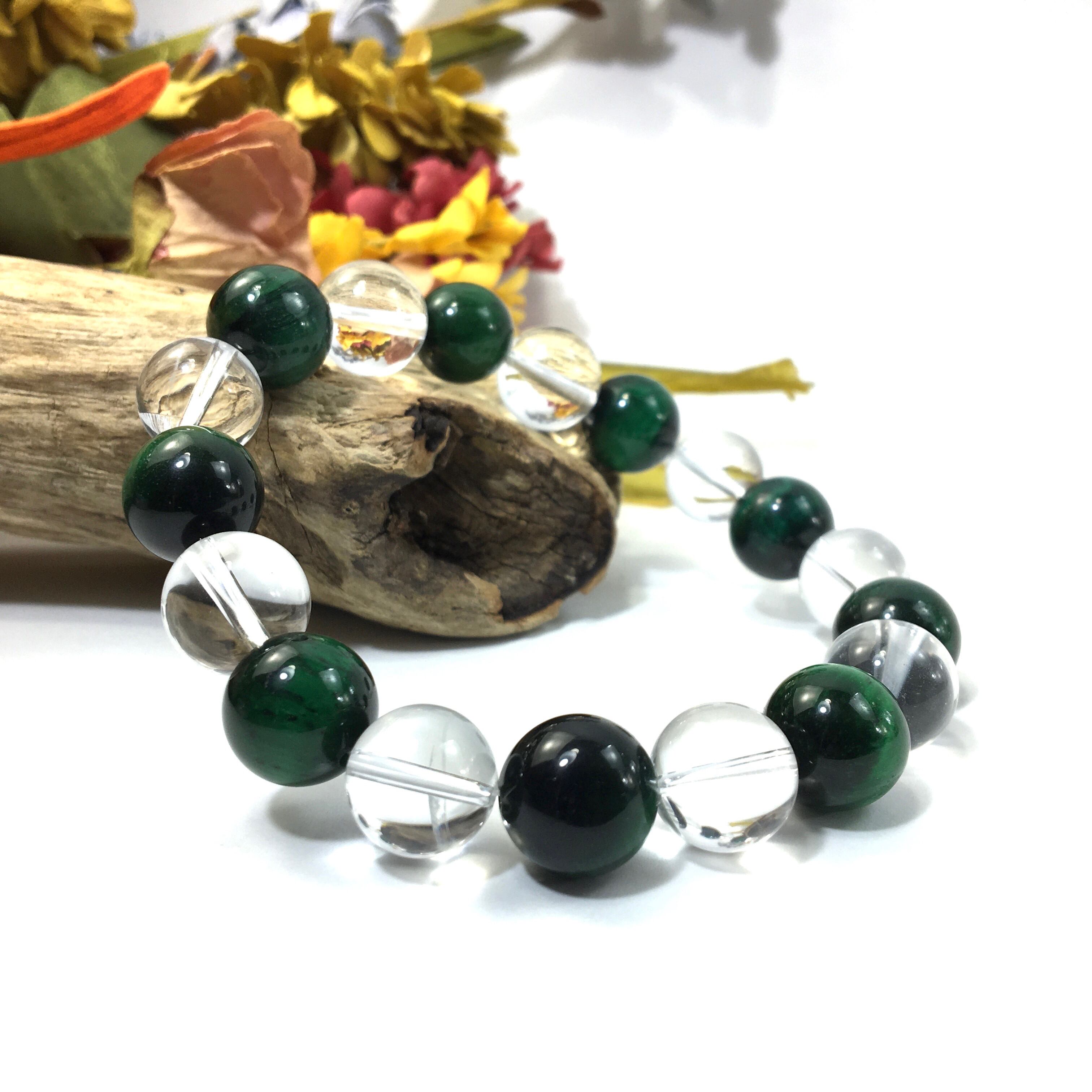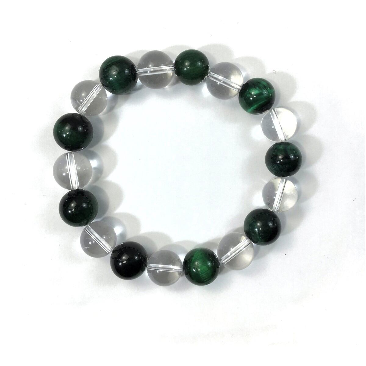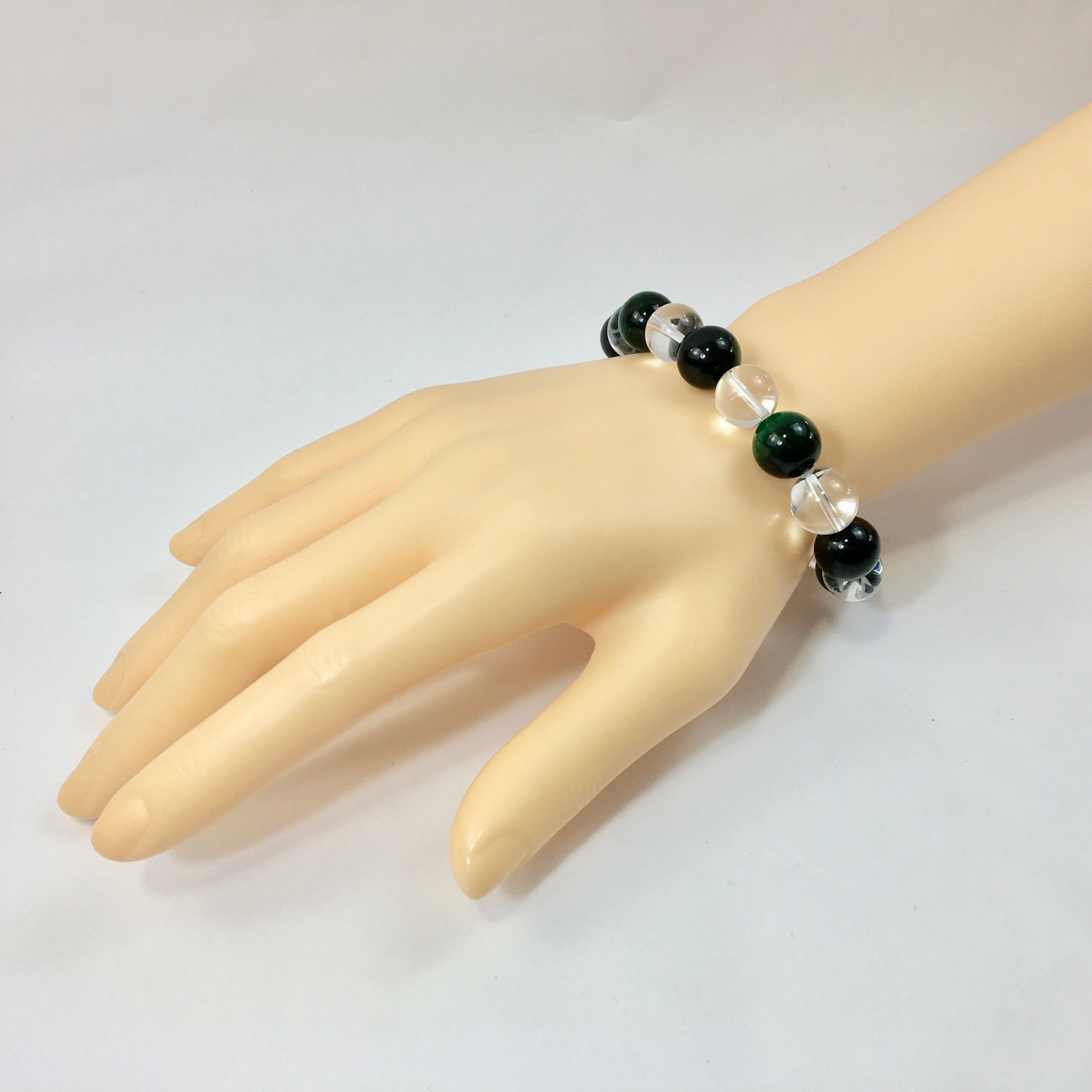 こちらは、水晶とグリーンタイガーアイを交互に組み合わせたパワーストーンブレスレットです。シンプルなデザインですのでどんなコーディネートとも合わせ易いブレスレットです。程よくインパクトがある12mm玉を使用して内周約18cmです。数に限りがございますので気になる方はお早めにどうぞ。