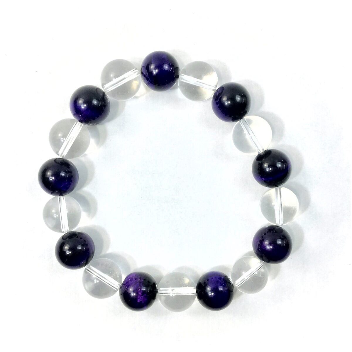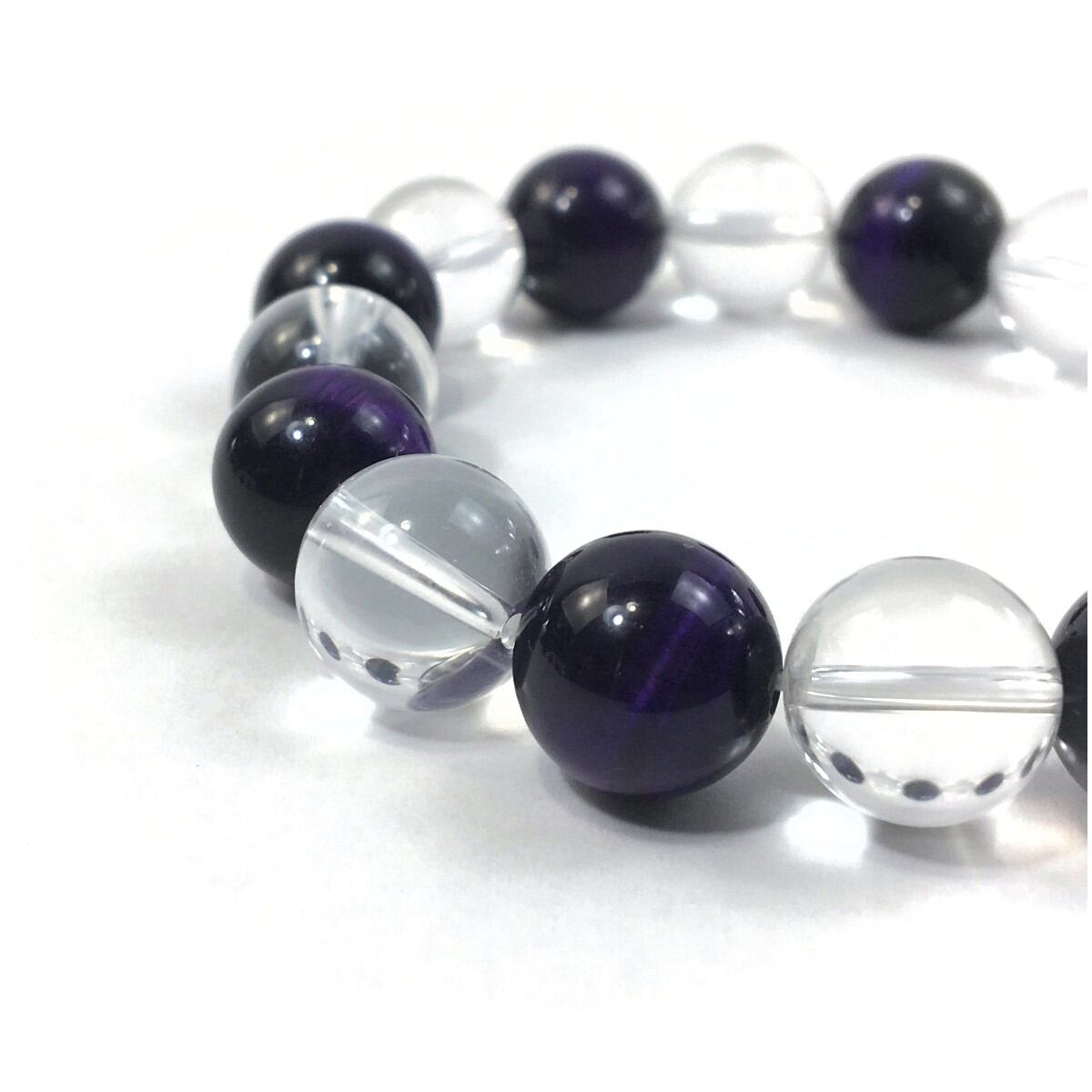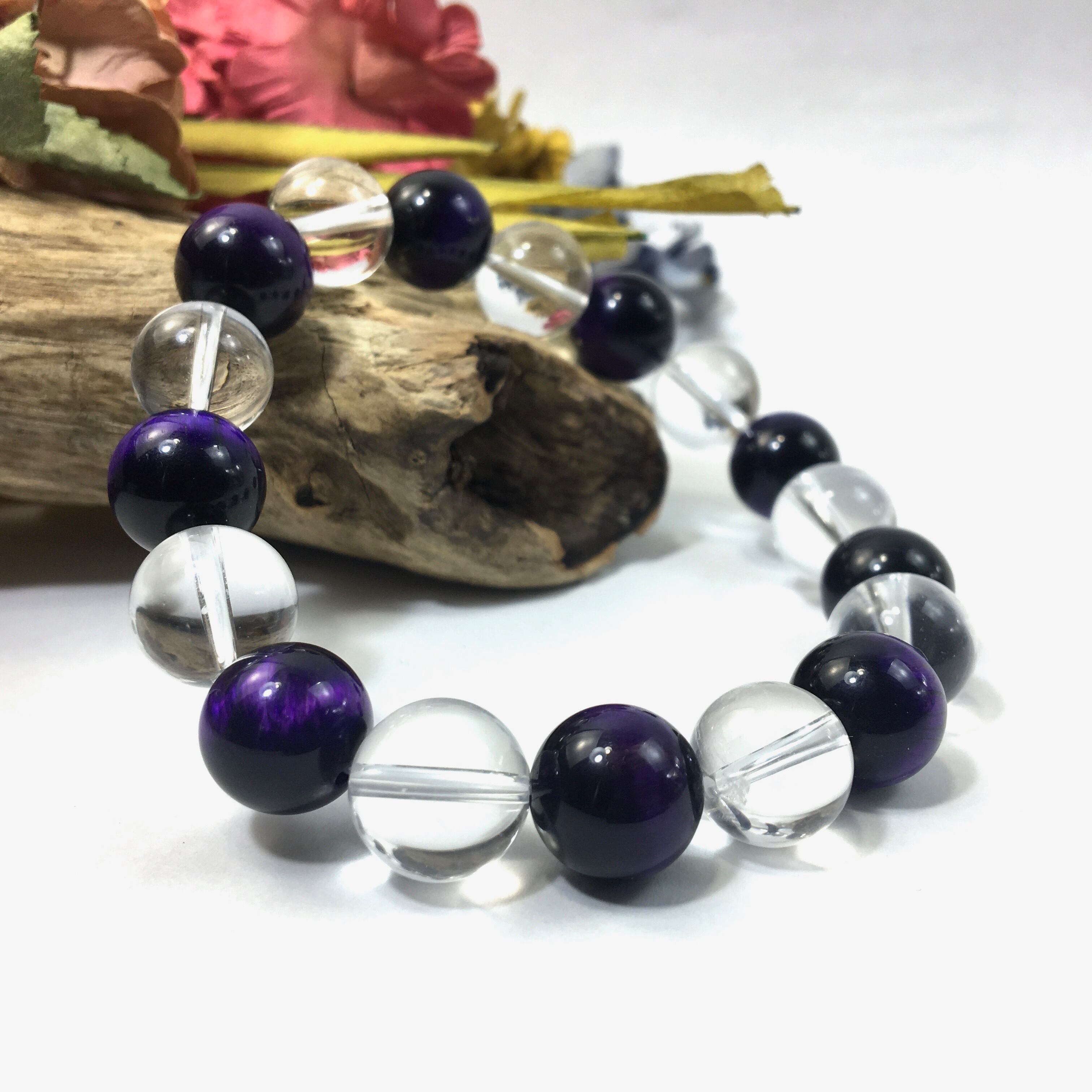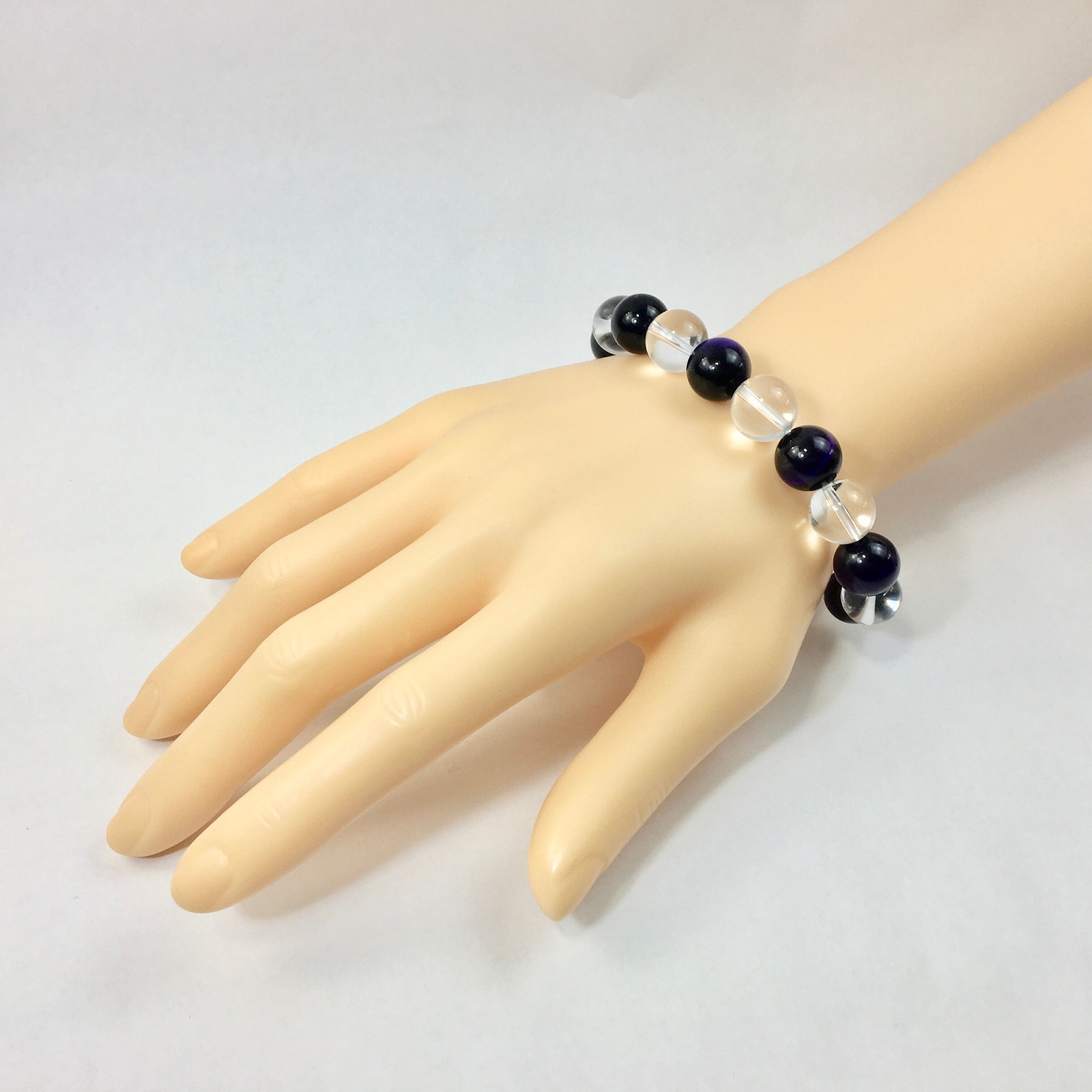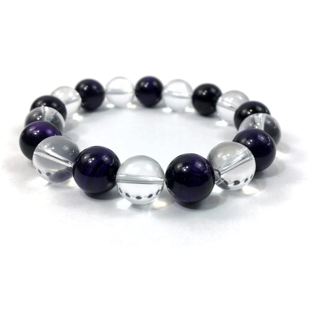 こちらは、水晶とパープルタイガーアイを交互に組み合わせたパワーストーンブレスレットです。シンプルなデザインですのでどんなコーディネートとも合わせ易いブレスレットです。程よくインパクトがある12mm玉を使用して内周約18cmです。数に限りがございますので気になる方はお早めにどうぞ。