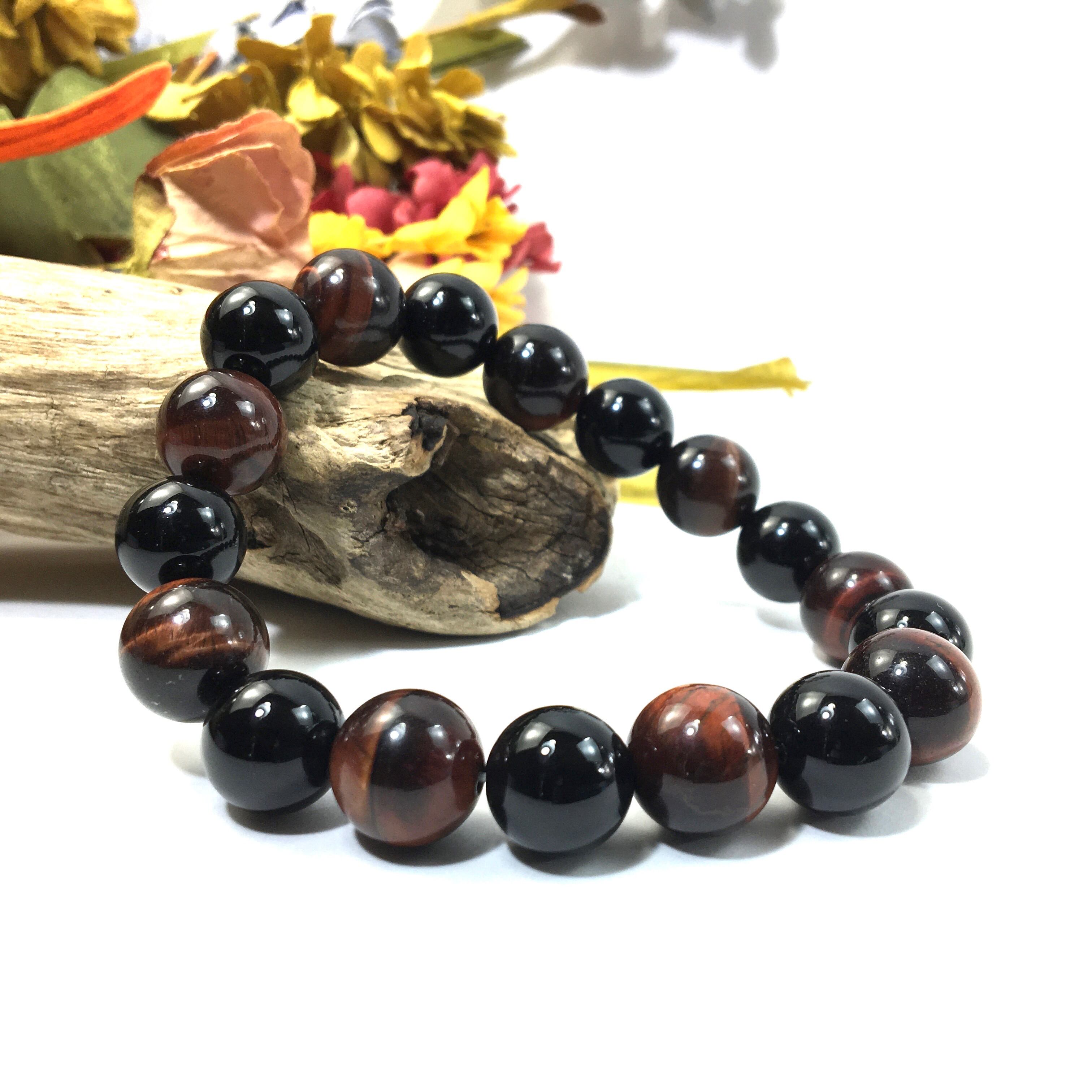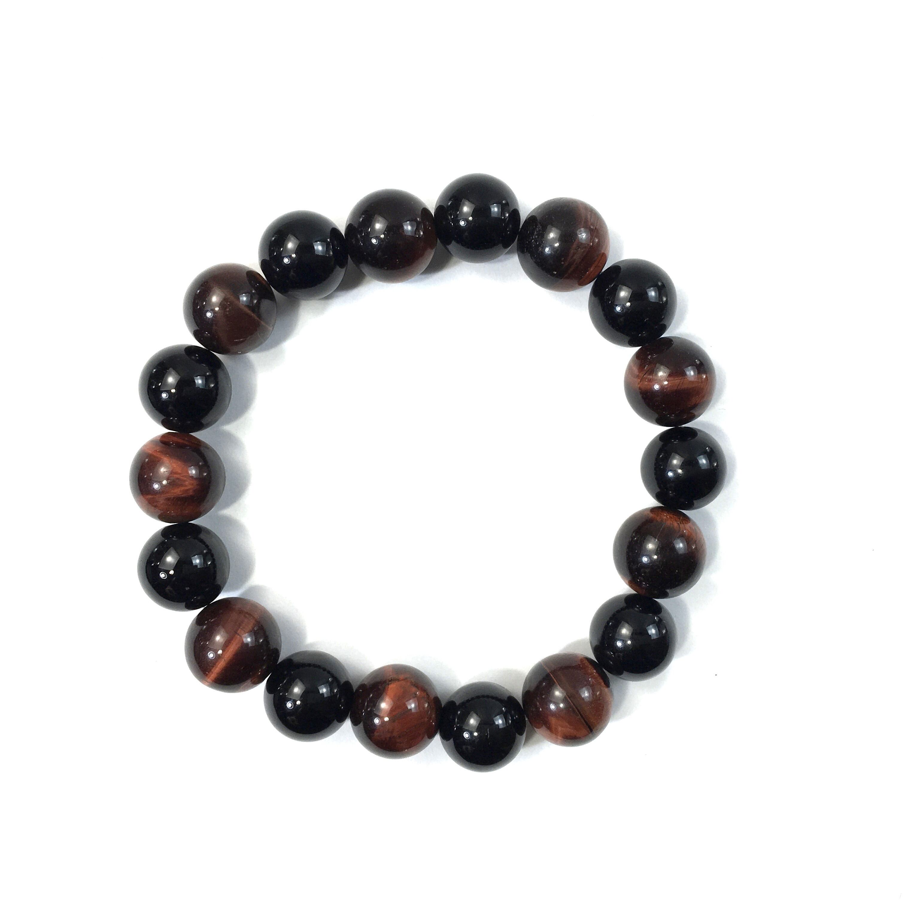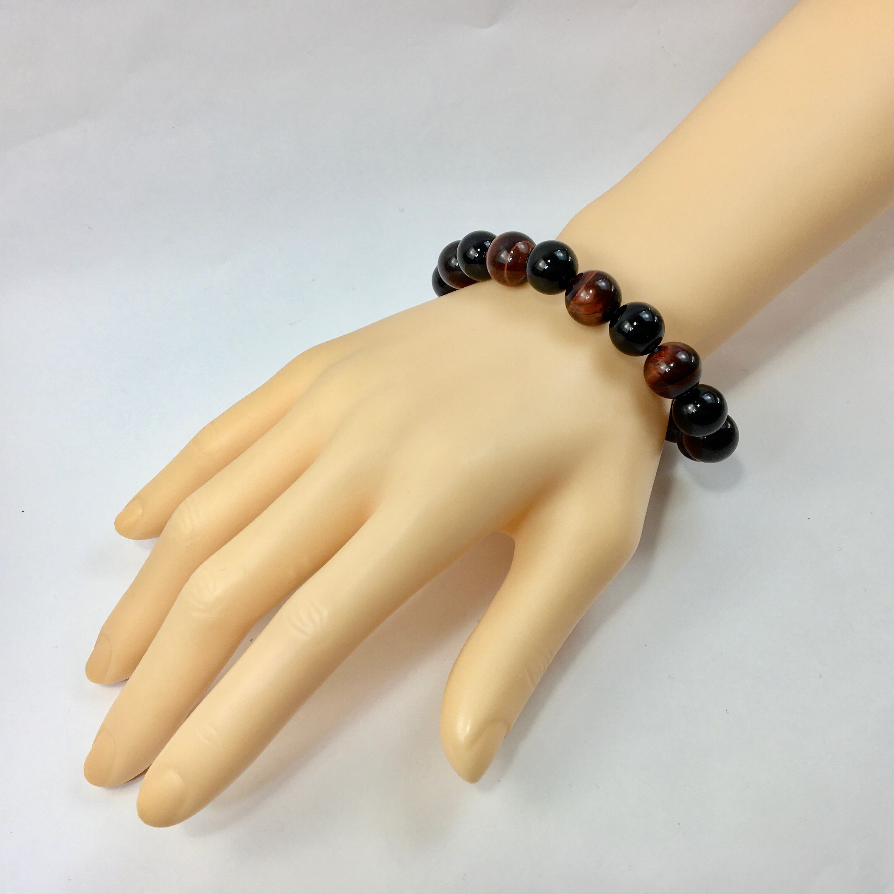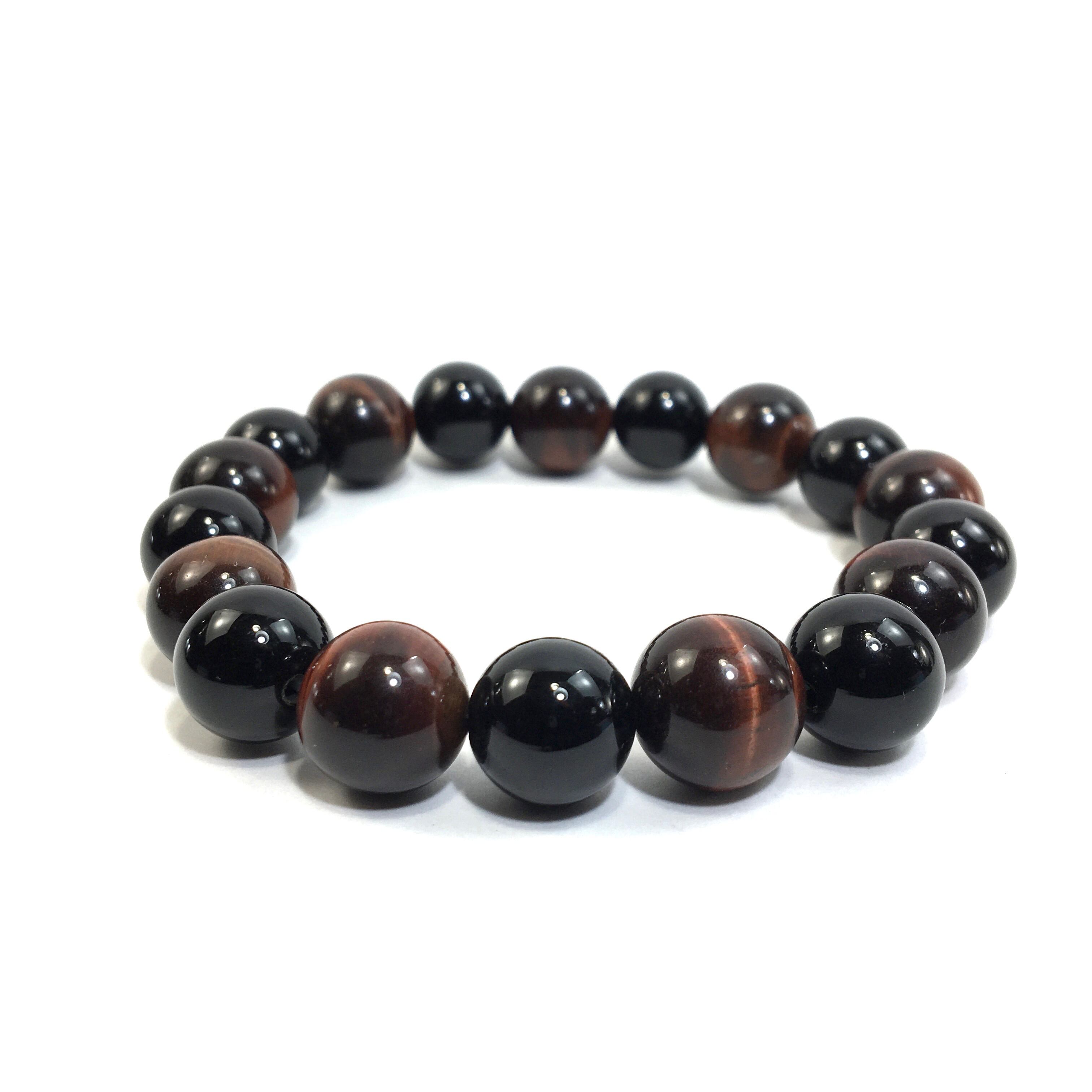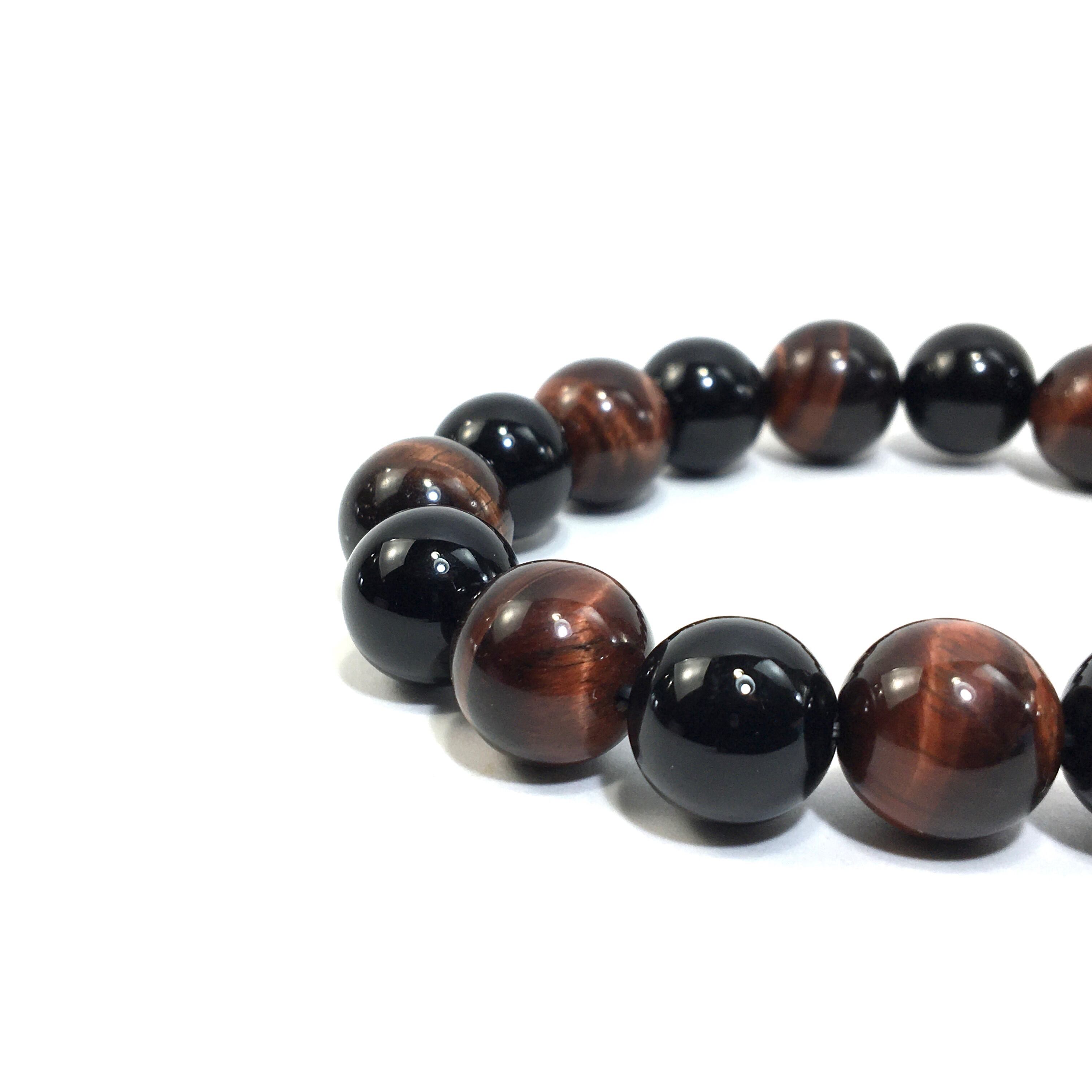 こちらは、オニキスとレッドタイガーアイを交互に組み合わせたパワーストーンブレスレットです。シンプルなデザインですのでどんなコーディネートとも合わせ易いブレスレットです。程よくインパクトがある12mm玉を使用して内周約18cmです。数に限りがございますので気になる方はお早めにどうぞ。