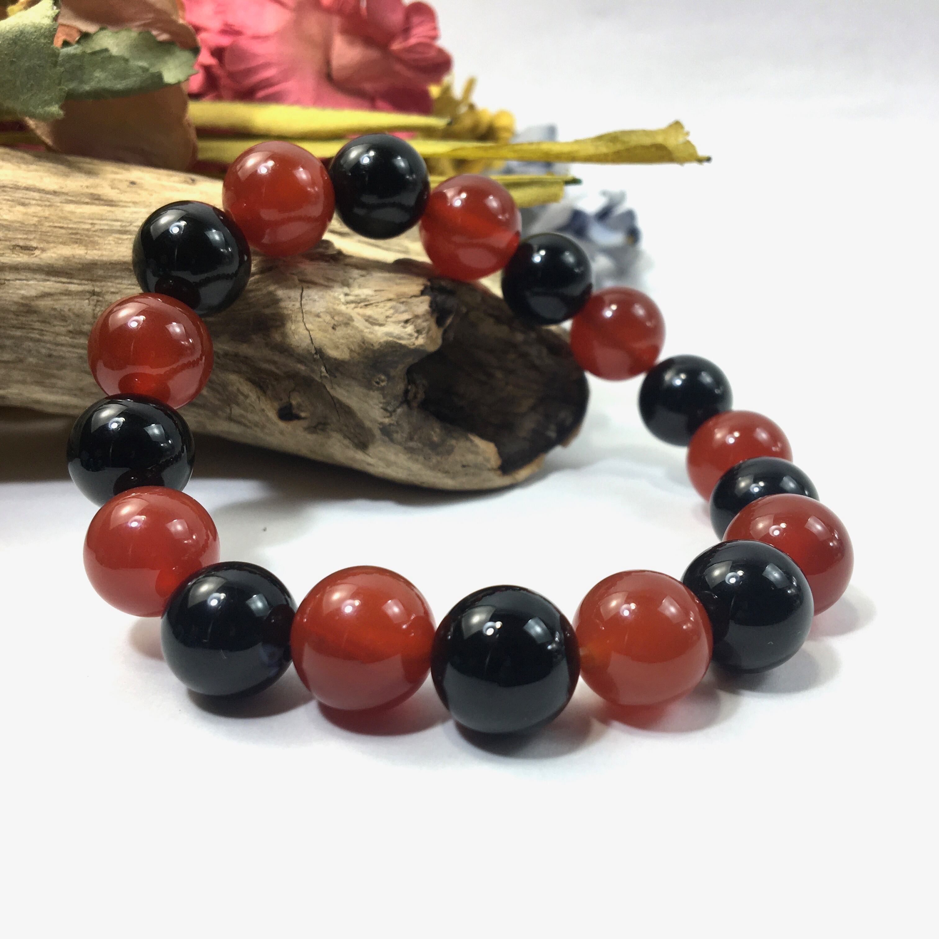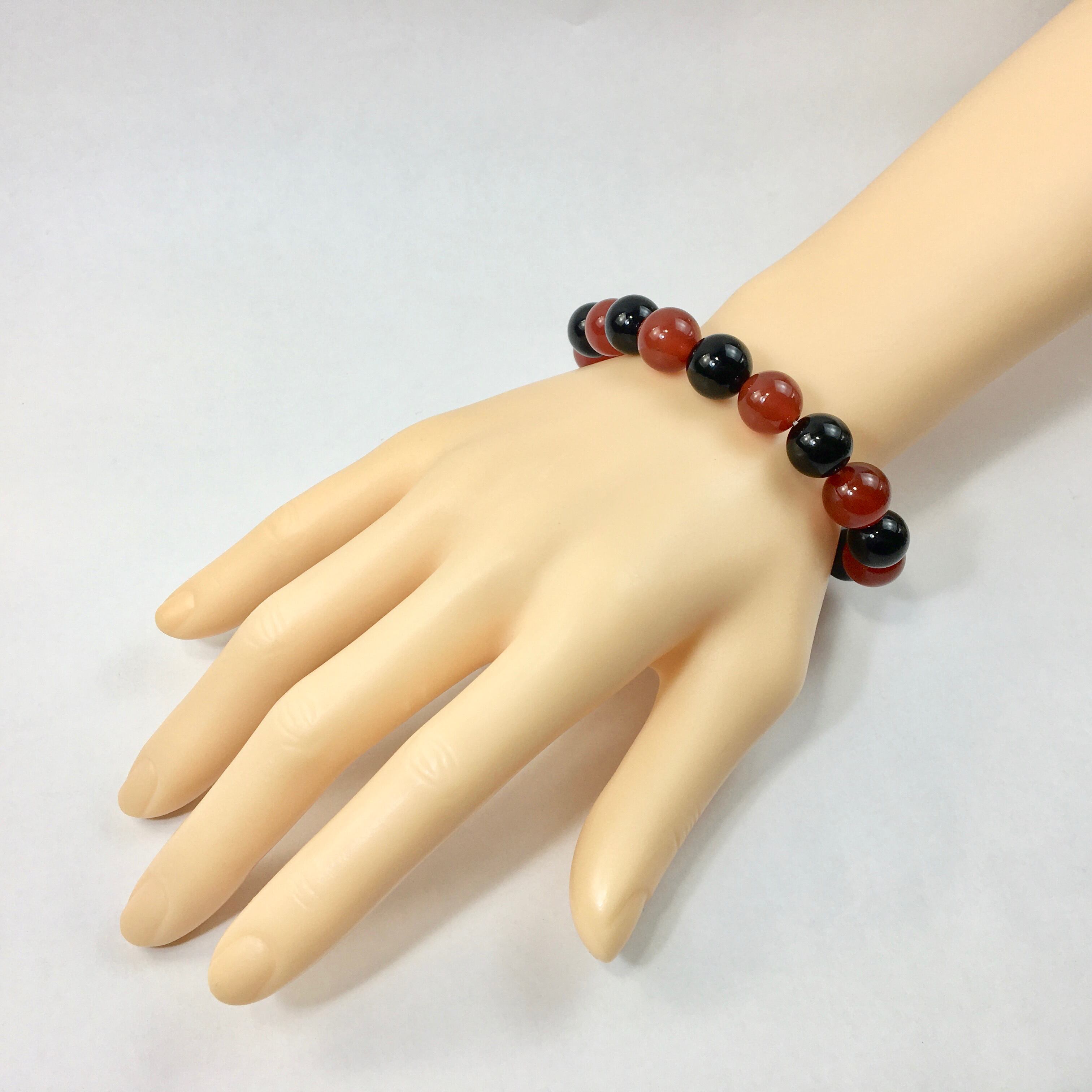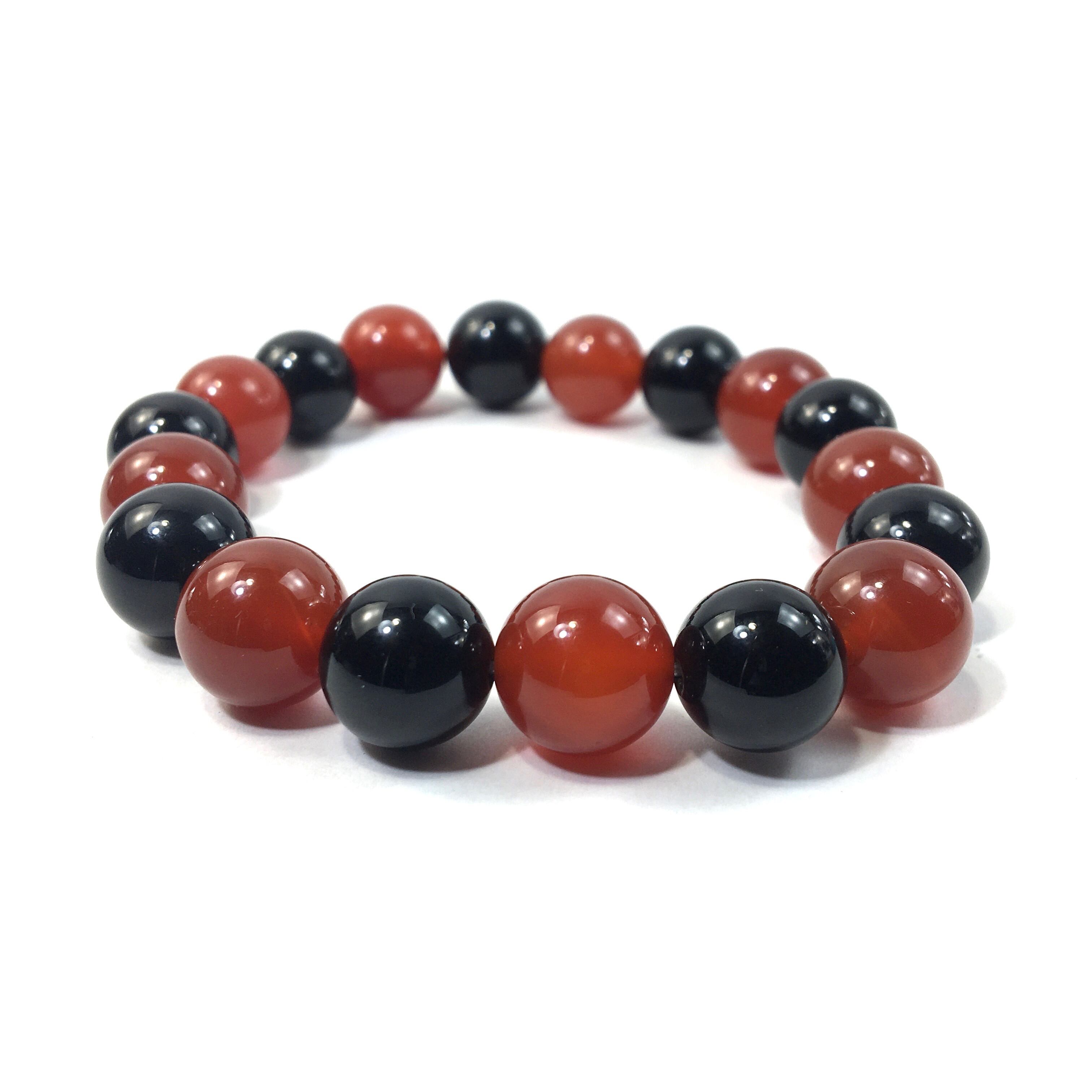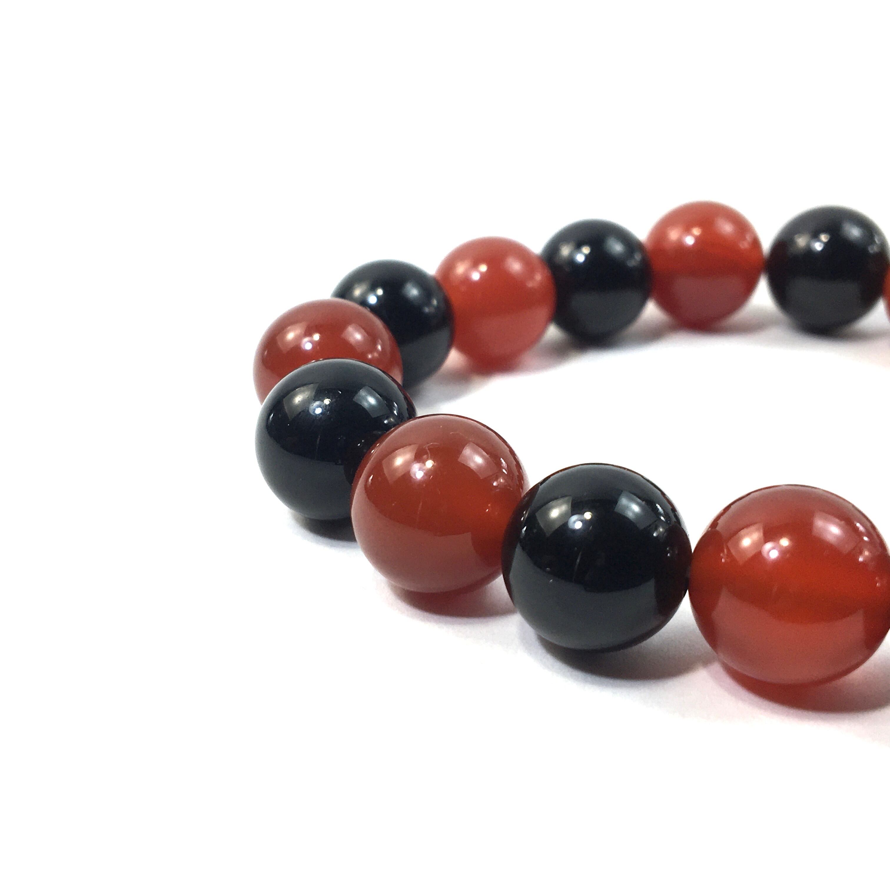こちらは、オニキスと赤瑪瑙を交互に組み合わせたパワーストーンブレスレットです。シンプルなデザインですのでどんなコーディネートとも合わせ易いブレスレットです。程よくインパクトがある12mm玉を使用して内周約18cmです。数に限りがございますので気になる方はお早めにどうぞ。