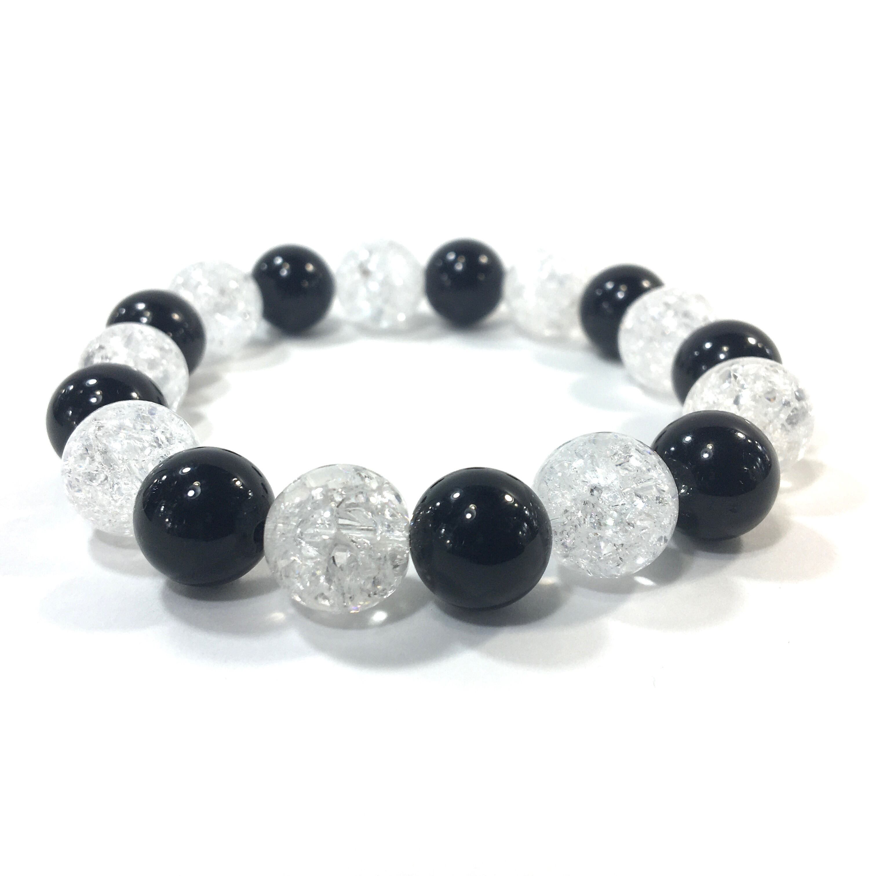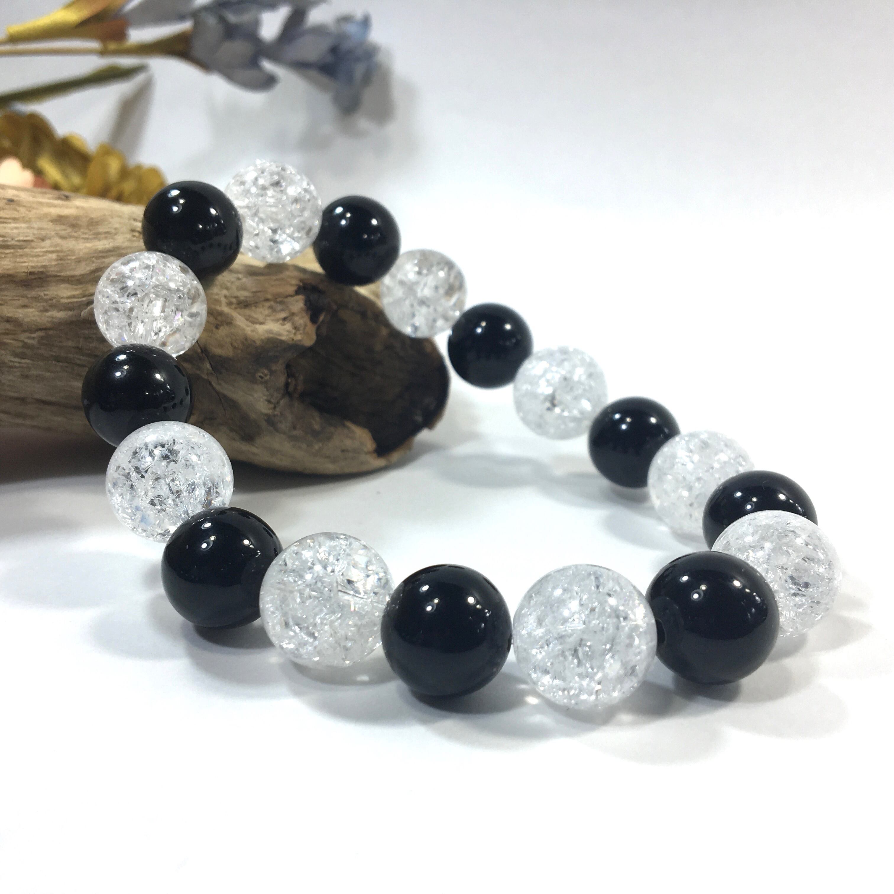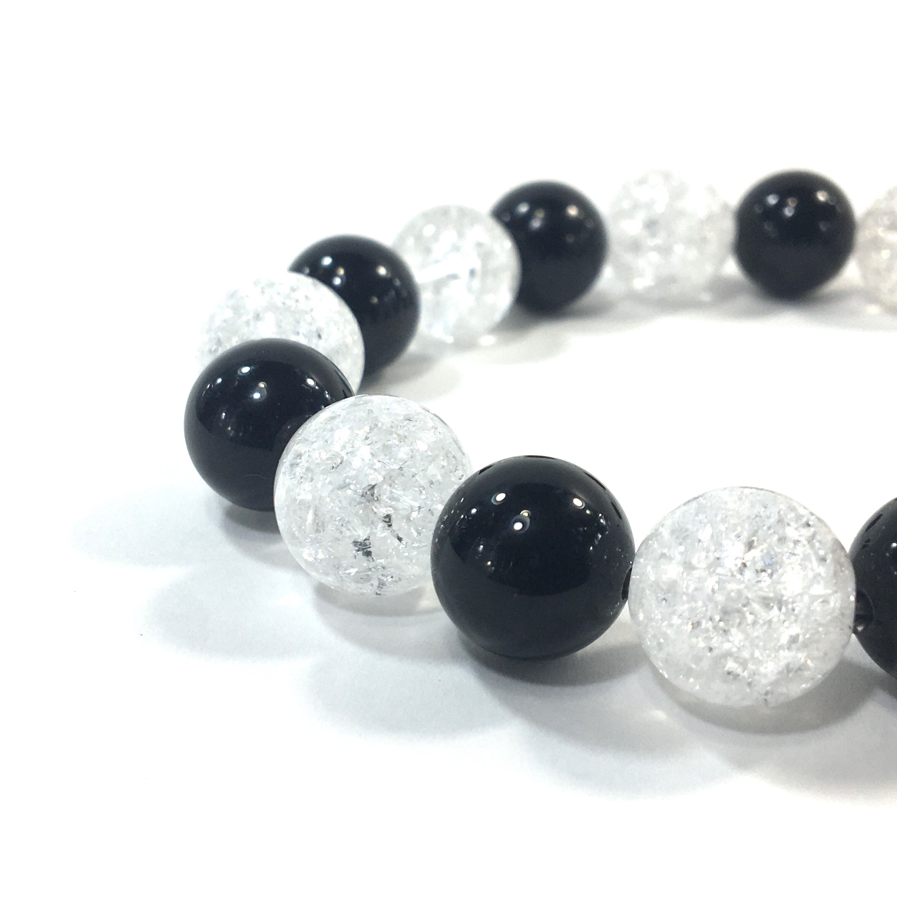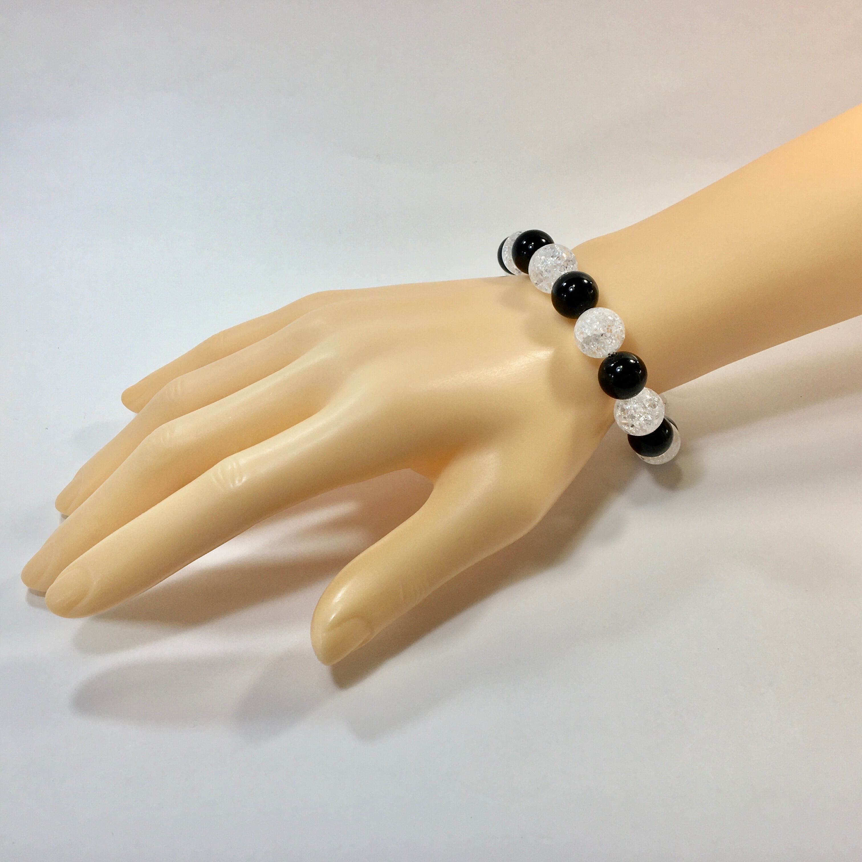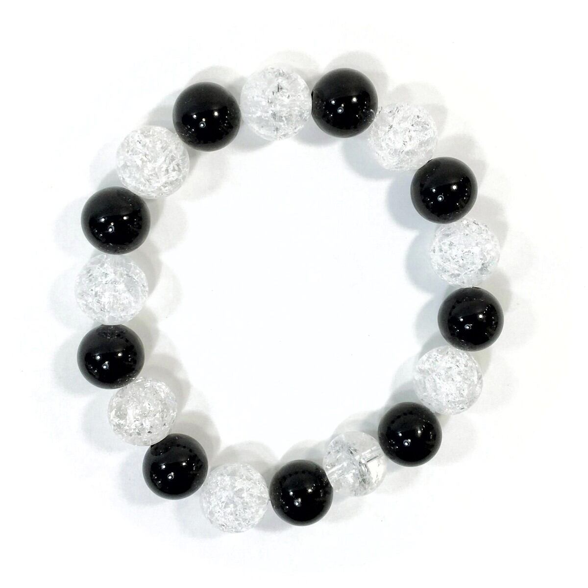 こちらは、オニキスとクラック水晶を交互に組み合わせたパワーストーンブレスレットです。シンプルなデザインですのでどんなコーディネートとも合わせ易いブレスレットです。程よくインパクトがある12mm玉を使用して内周約18cmです。数に限りがございますので気になる方はお早めにどうぞ。