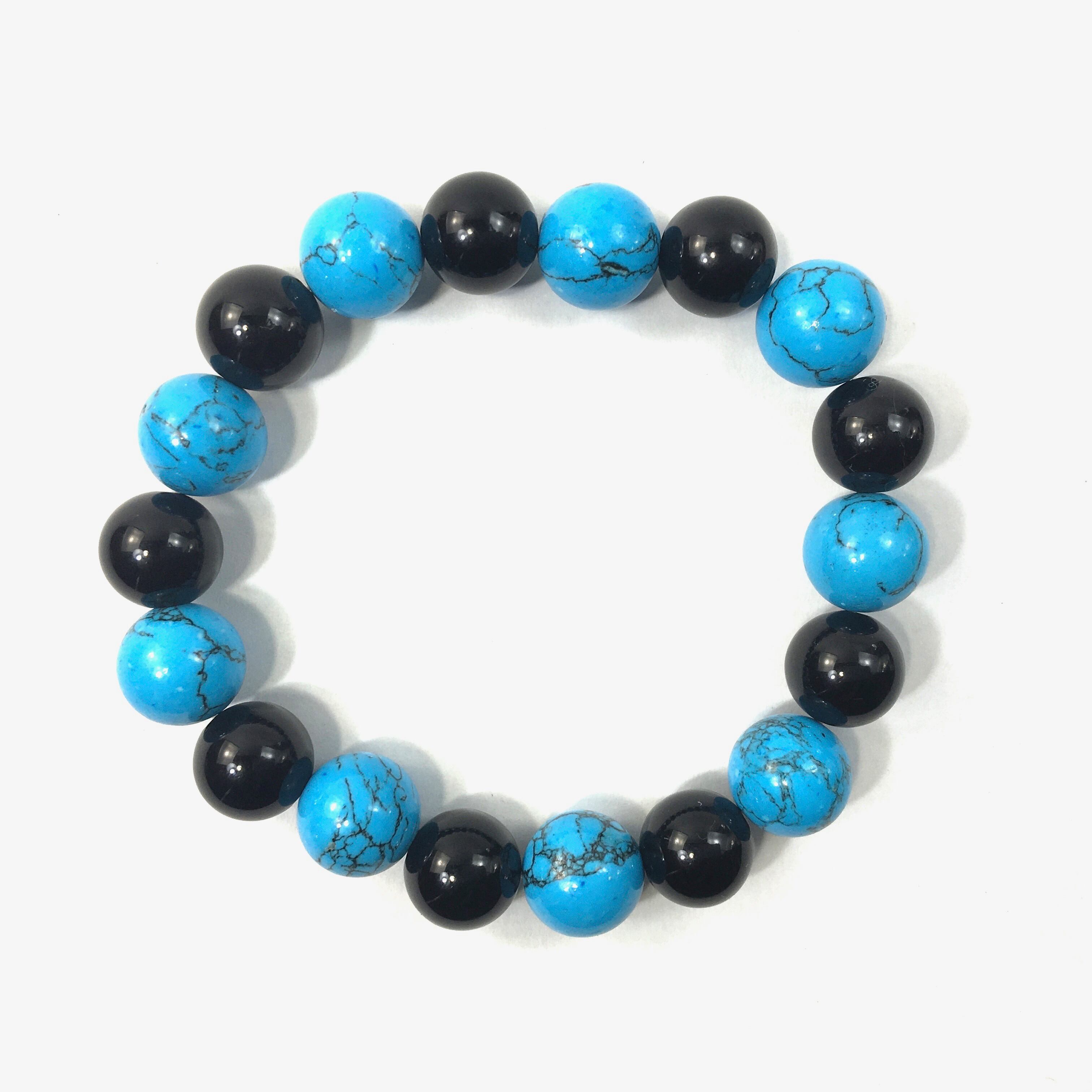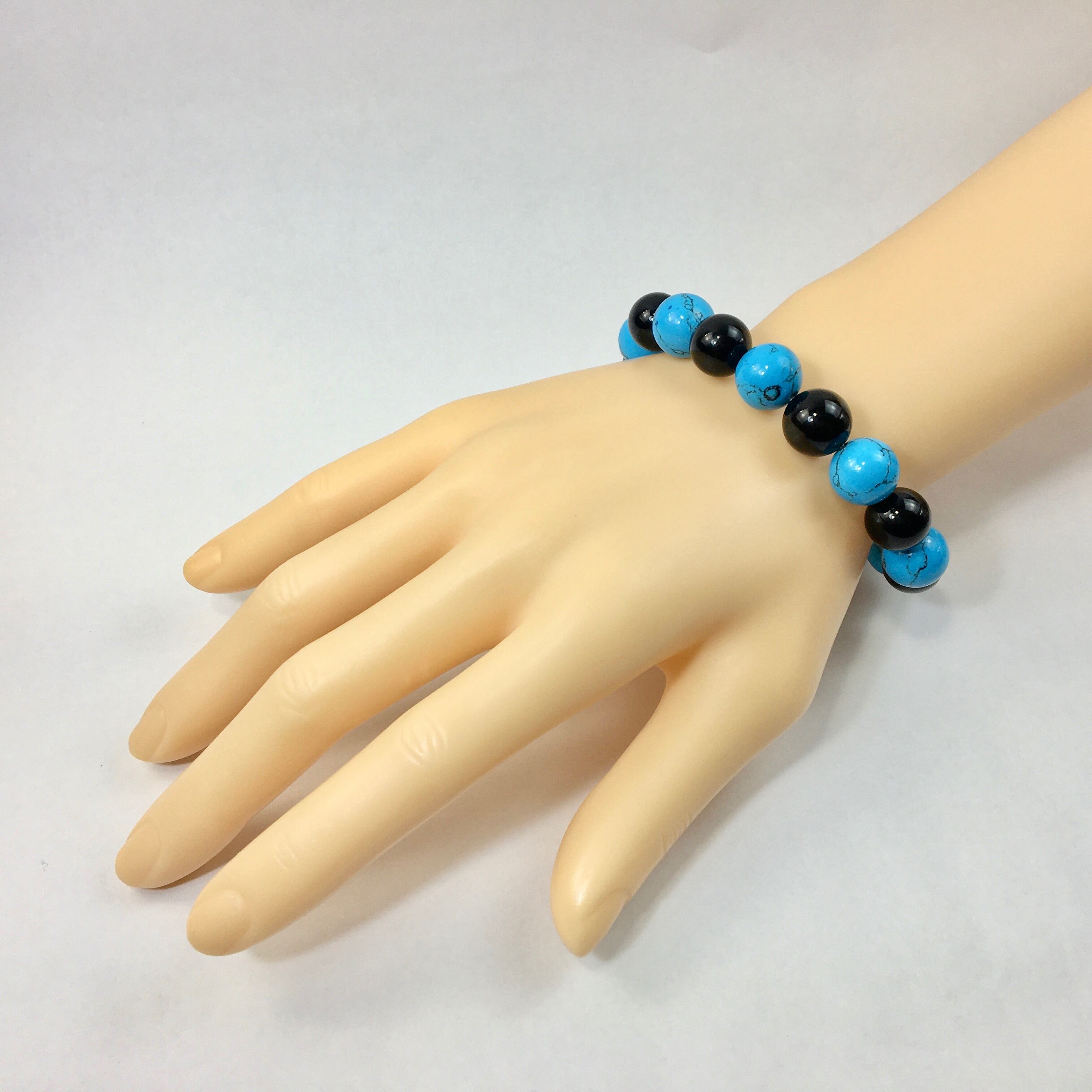 こちらは、オニキスとターコイズを交互に組み合わせたパワーストーンブレスレットです。シンプルなデザインですのでどんなコーディネートとも合わせ易いブレスレットです。程よくインパクトがある12mm玉を使用して内周約18cmです。数に限りがございますので気になる方はお早めにどうぞ。