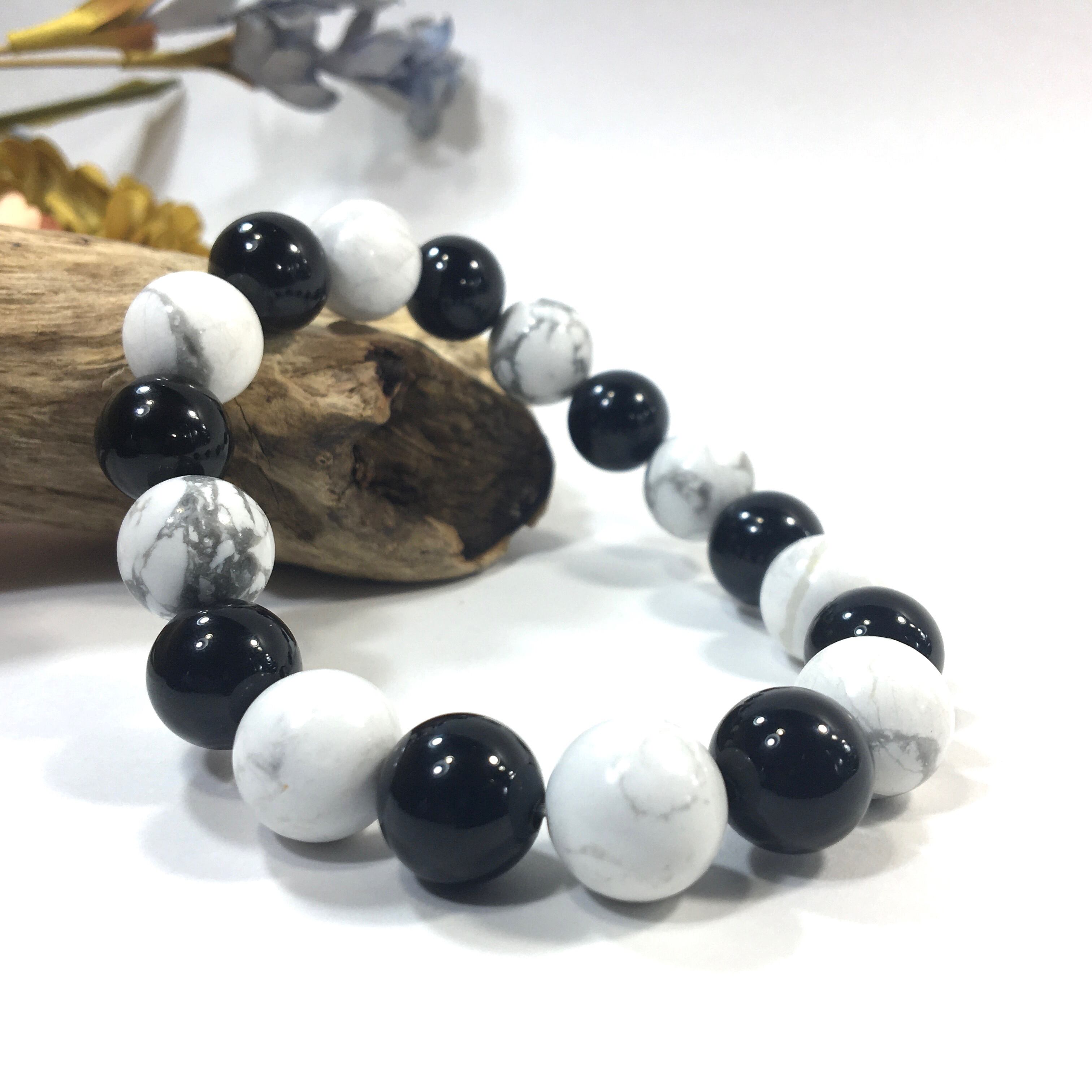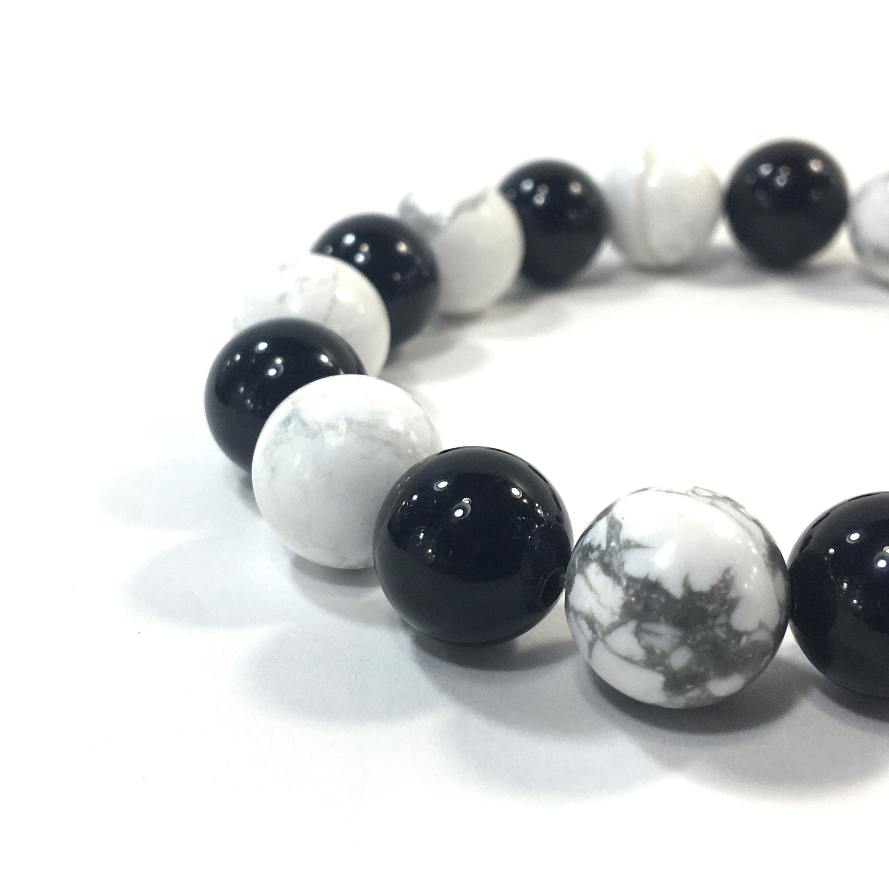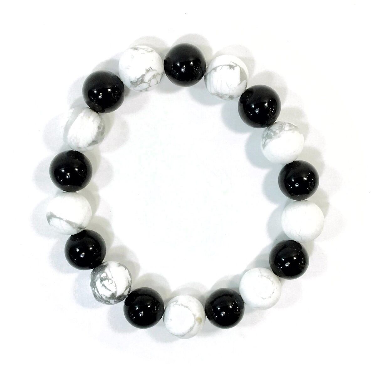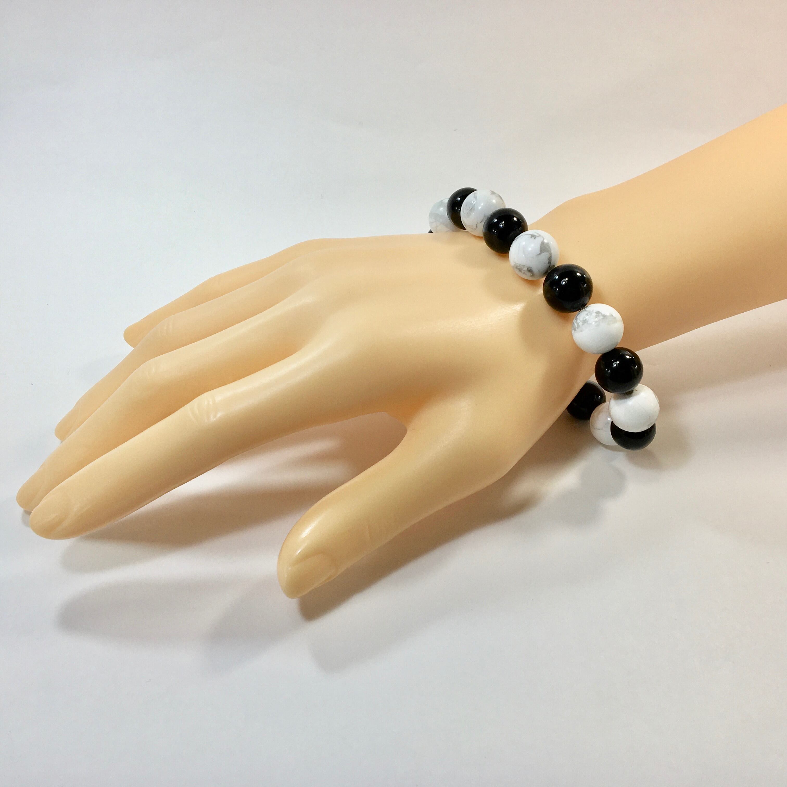 こちらは、オニキスとハウライトを交互に組み合わせたパワーストーンブレスレットです。シンプルなデザインですのでどんなコーディネートとも合わせ易いブレスレットです。程よくインパクトがある12mm玉を使用して内周約18cmです。数に限りがございますので気になる方はお早めにどうぞ。