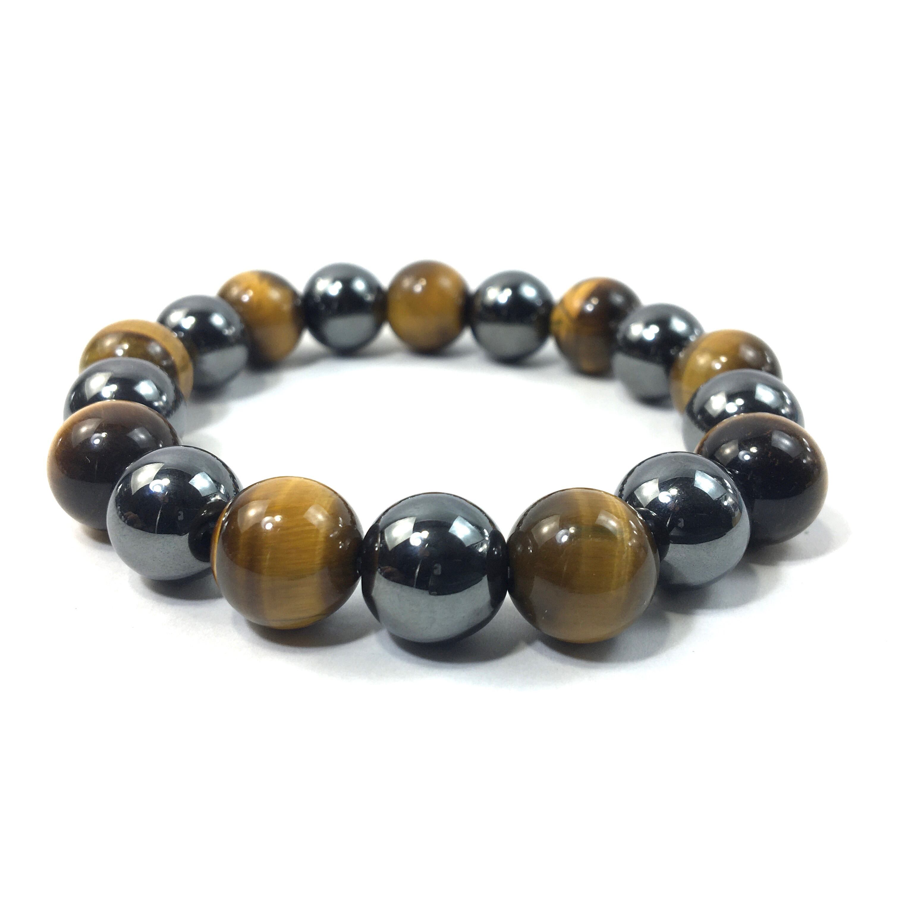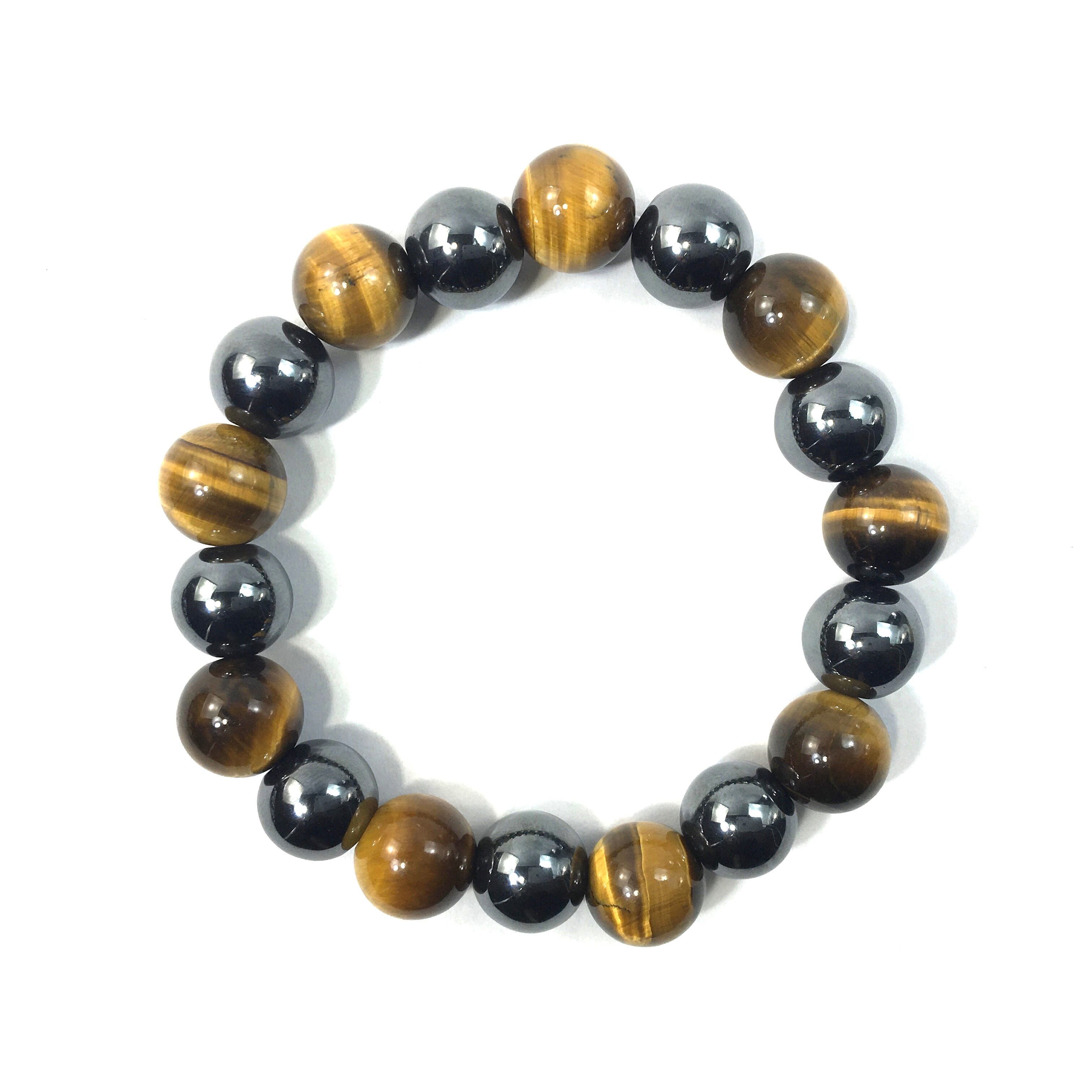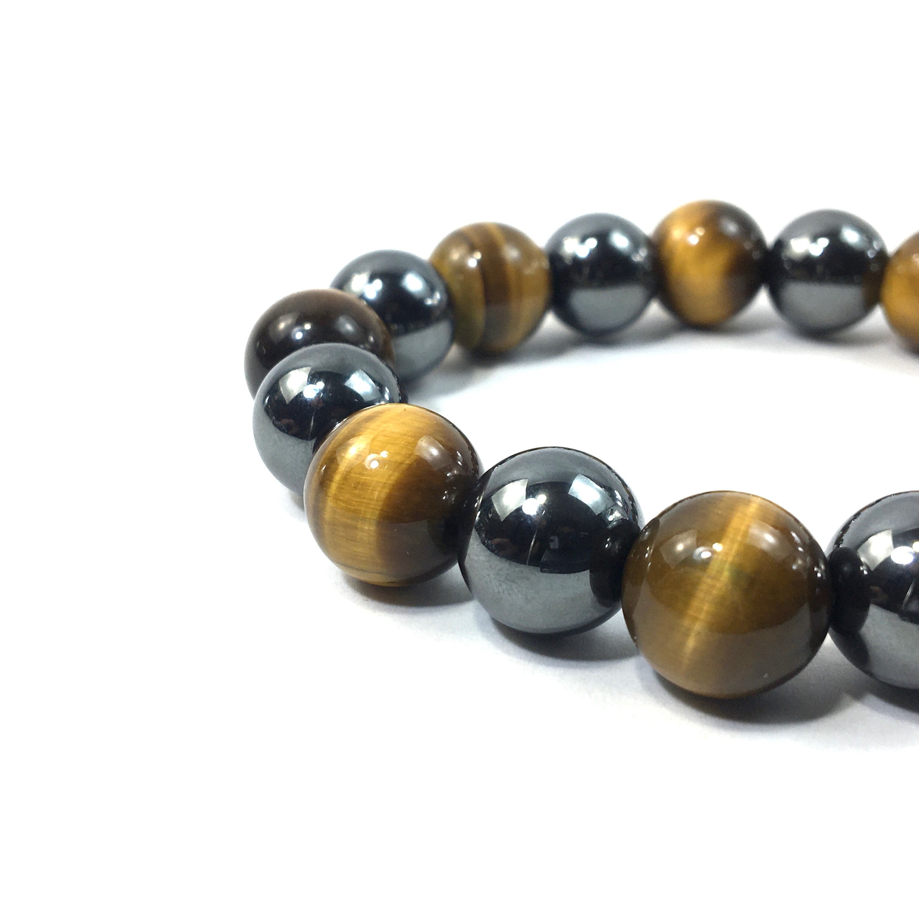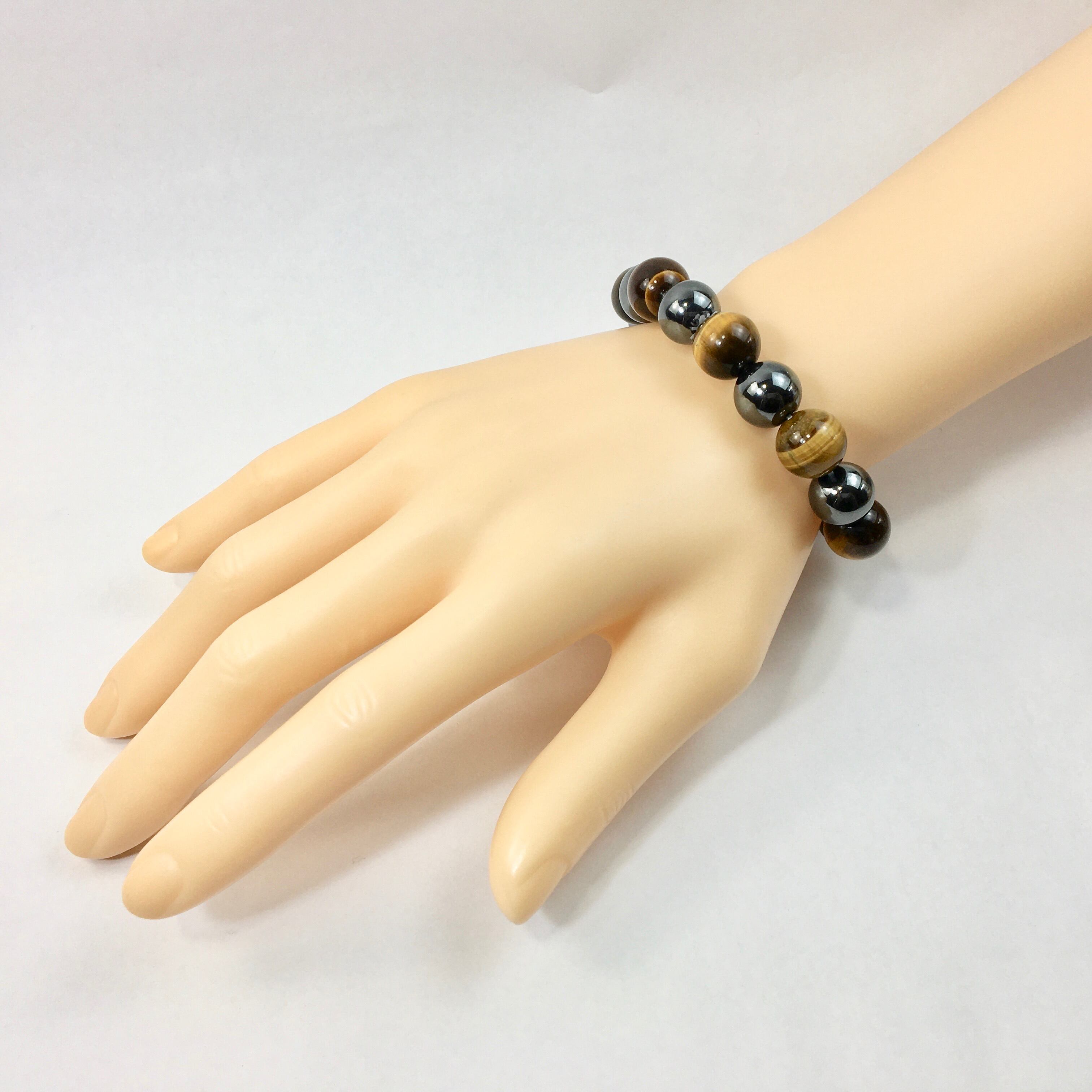 こちらは、ヘマタイトとタイガーアイを交互に組み合わせたパワーストーンブレスレットです。シンプルなデザインですのでどんなコーディネートとも合わせ易いブレスレットです。程よくインパクトがある12mm玉を使用して内周約18cmです。数に限りがございますので気になる方はお早めにどうぞ。