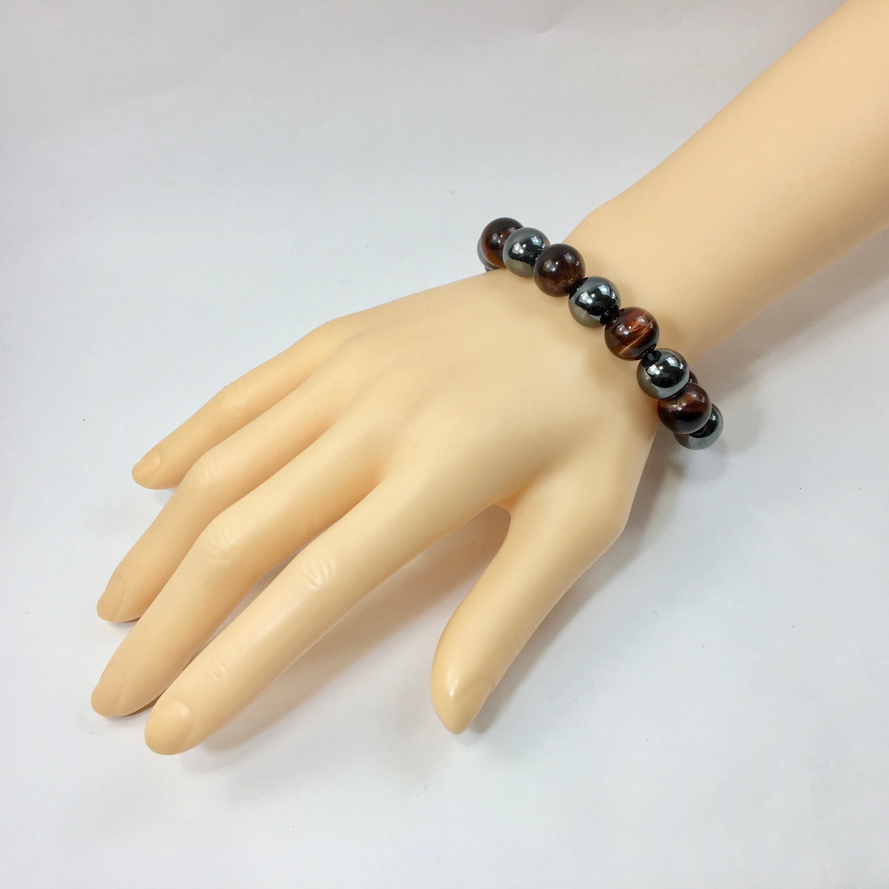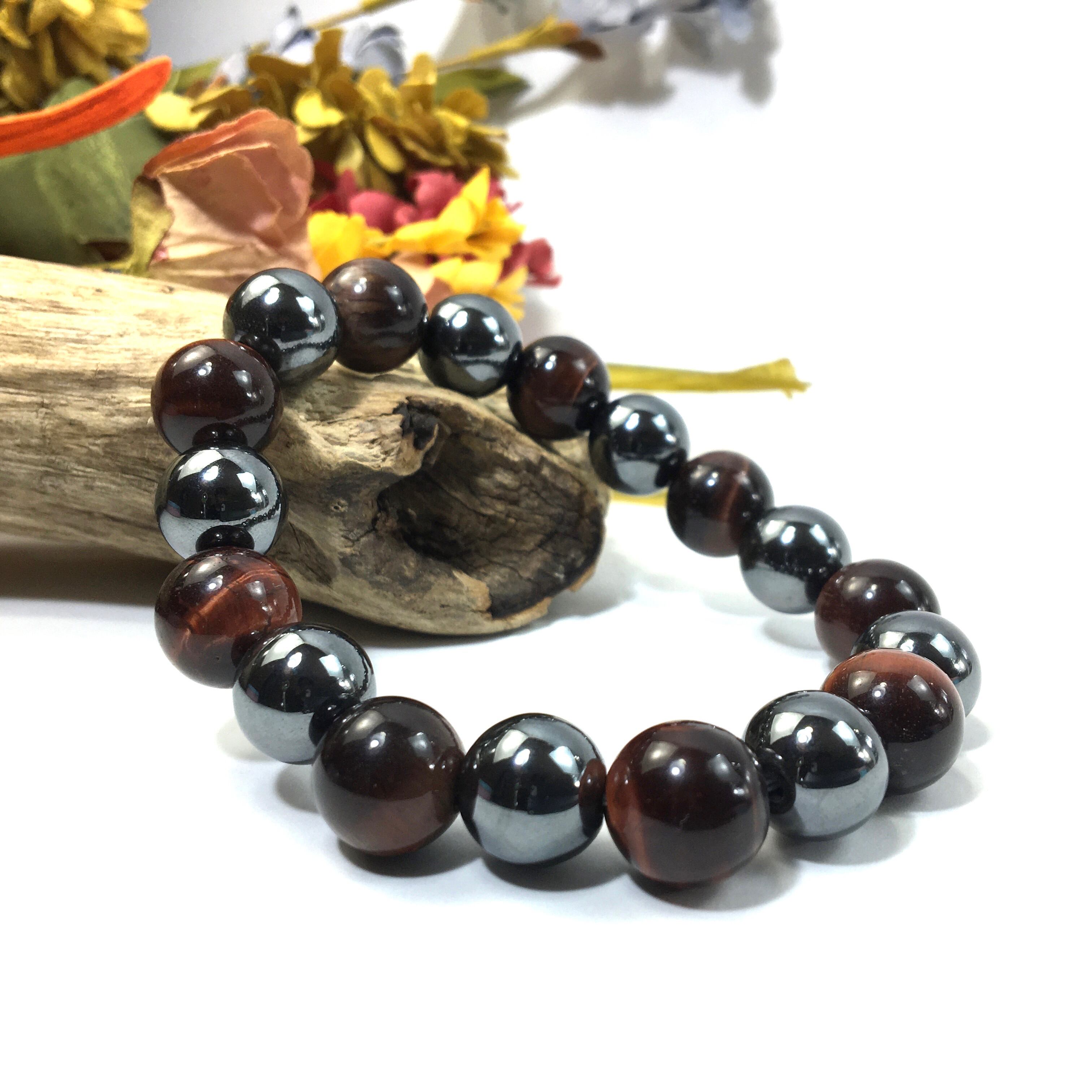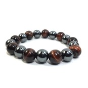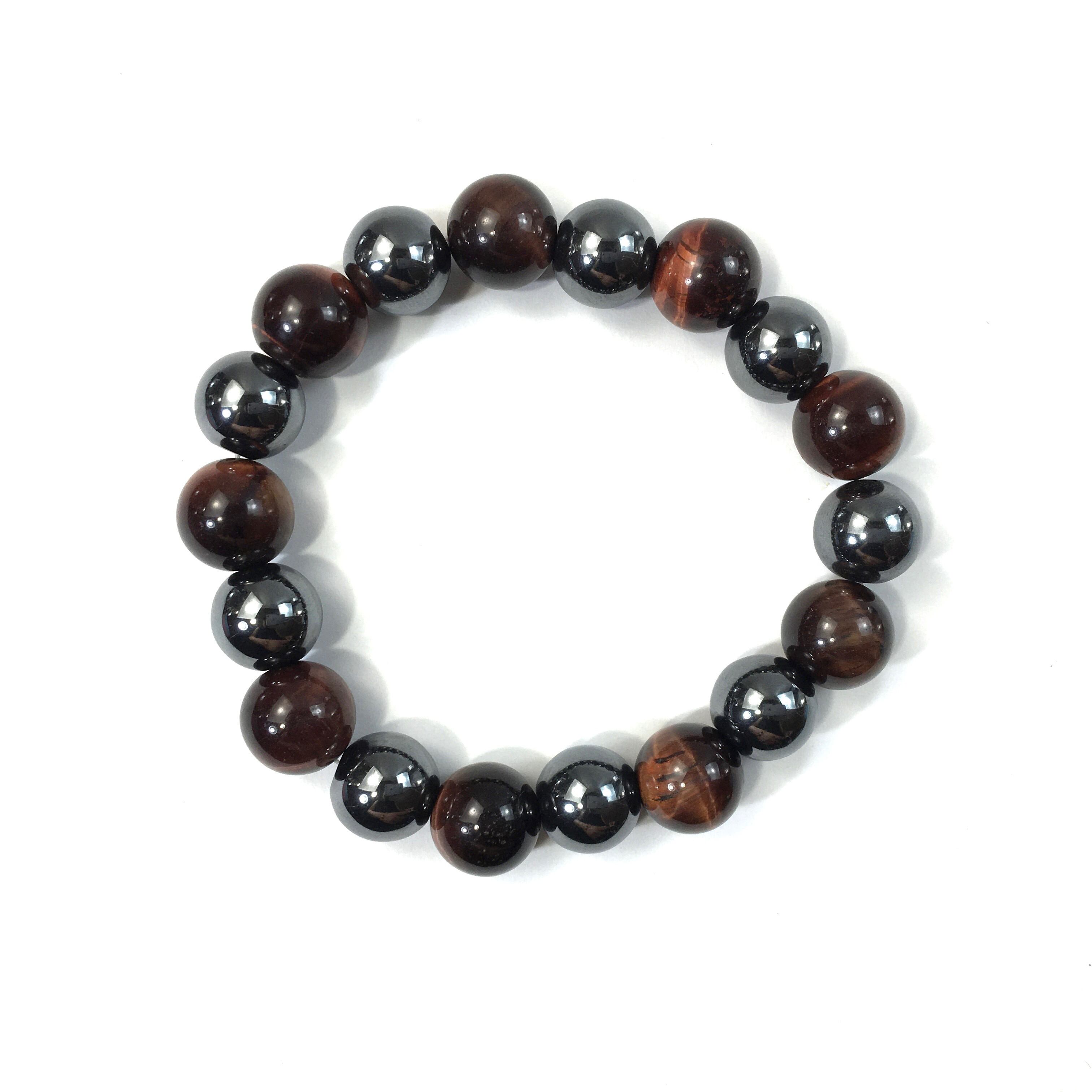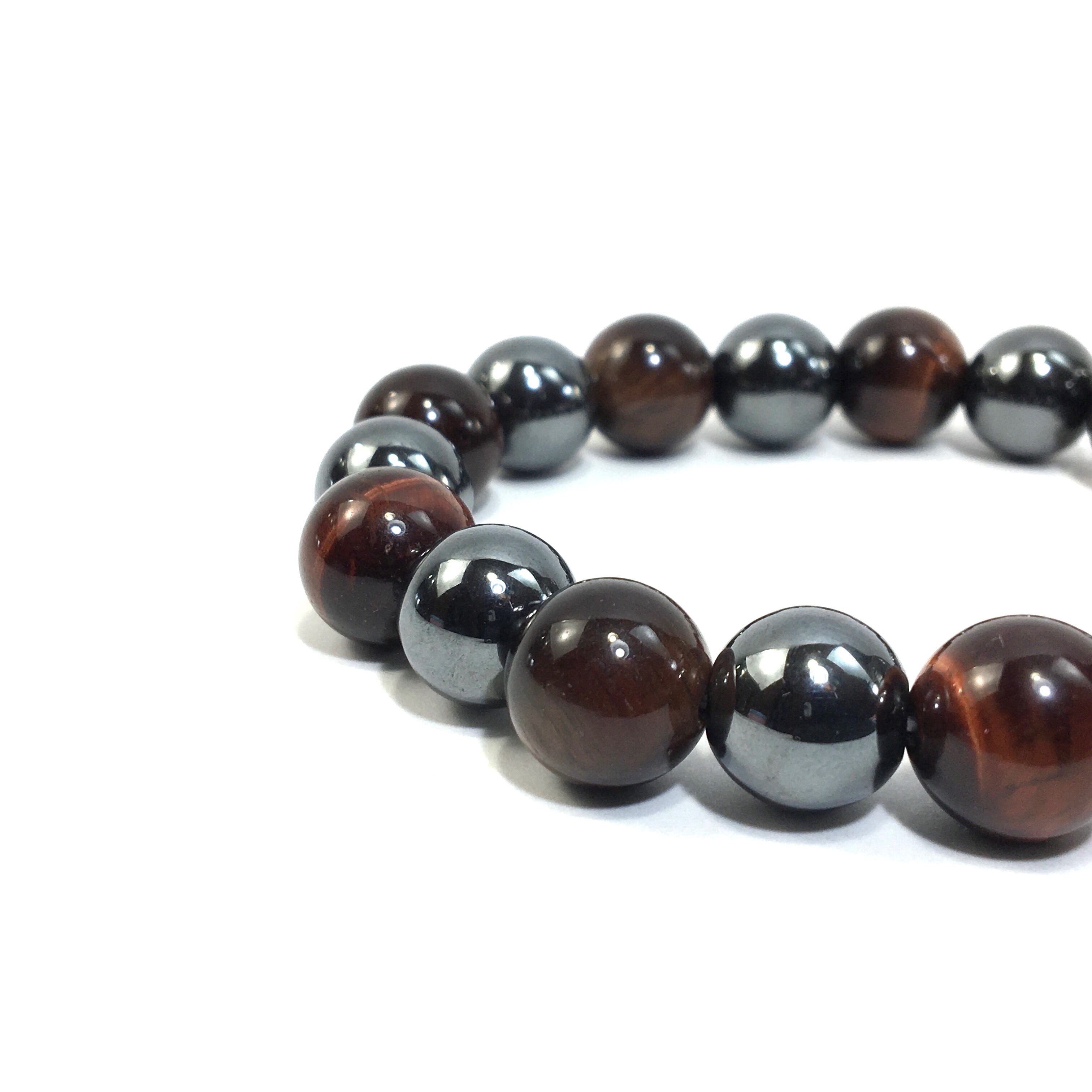 こちらは、ヘマタイトとレッドタイガーアイを交互に組み合わせたパワーストーンブレスレットです。シンプルなデザインですのでどんなコーディネートとも合わせ易いブレスレットです。程よくインパクトがある12mm玉を使用して内周約18cmです。数に限りがございますので気になる方はお早めにどうぞ。