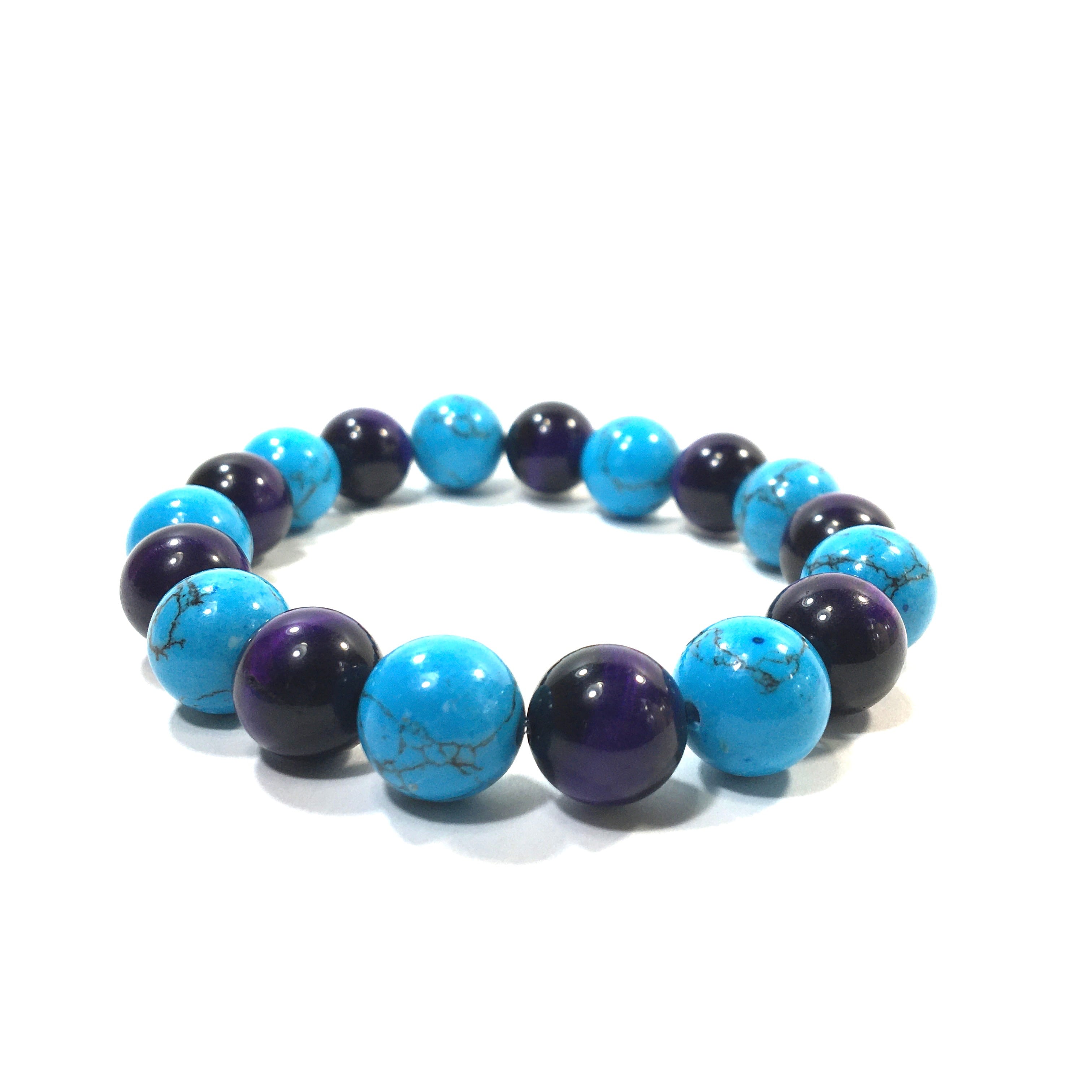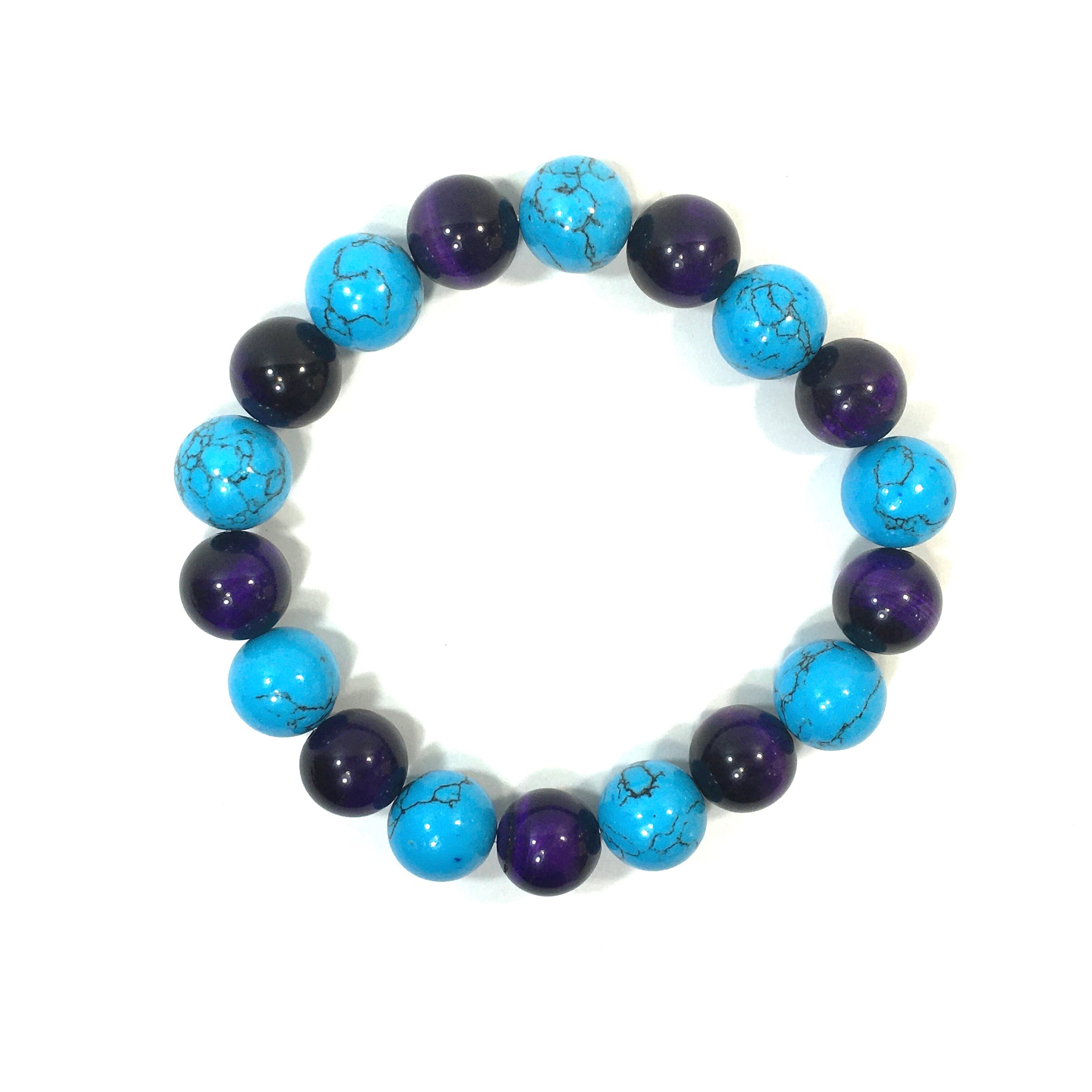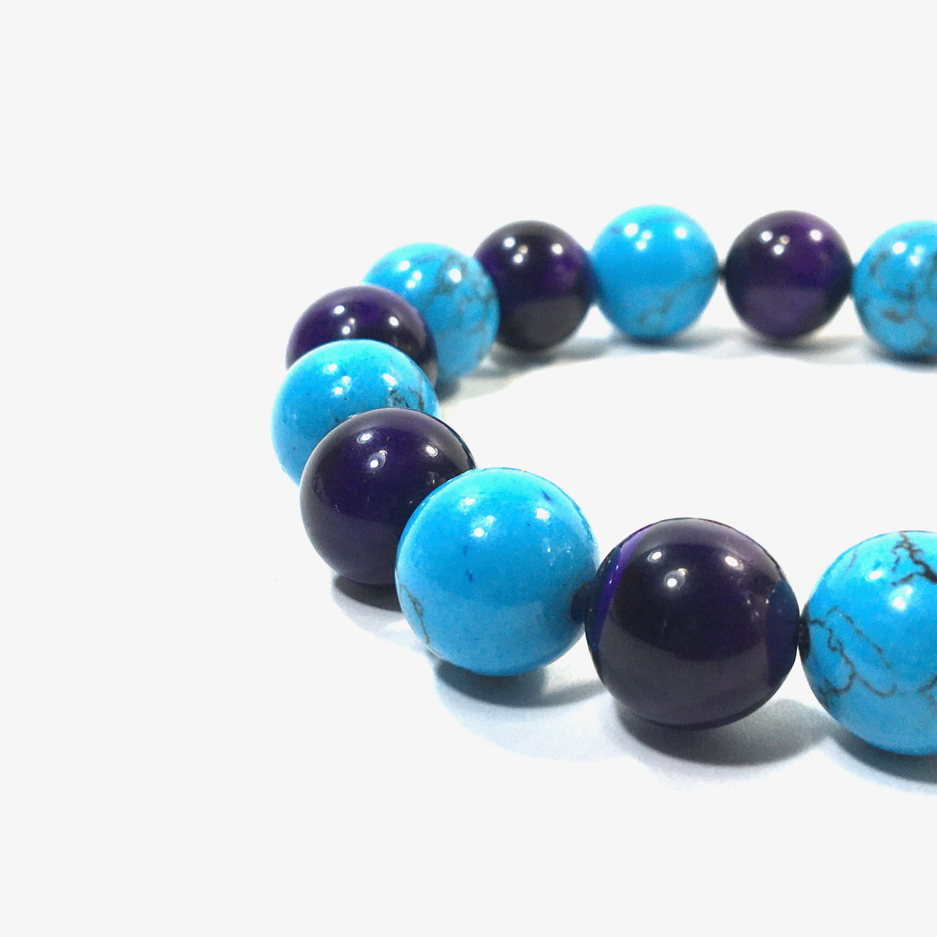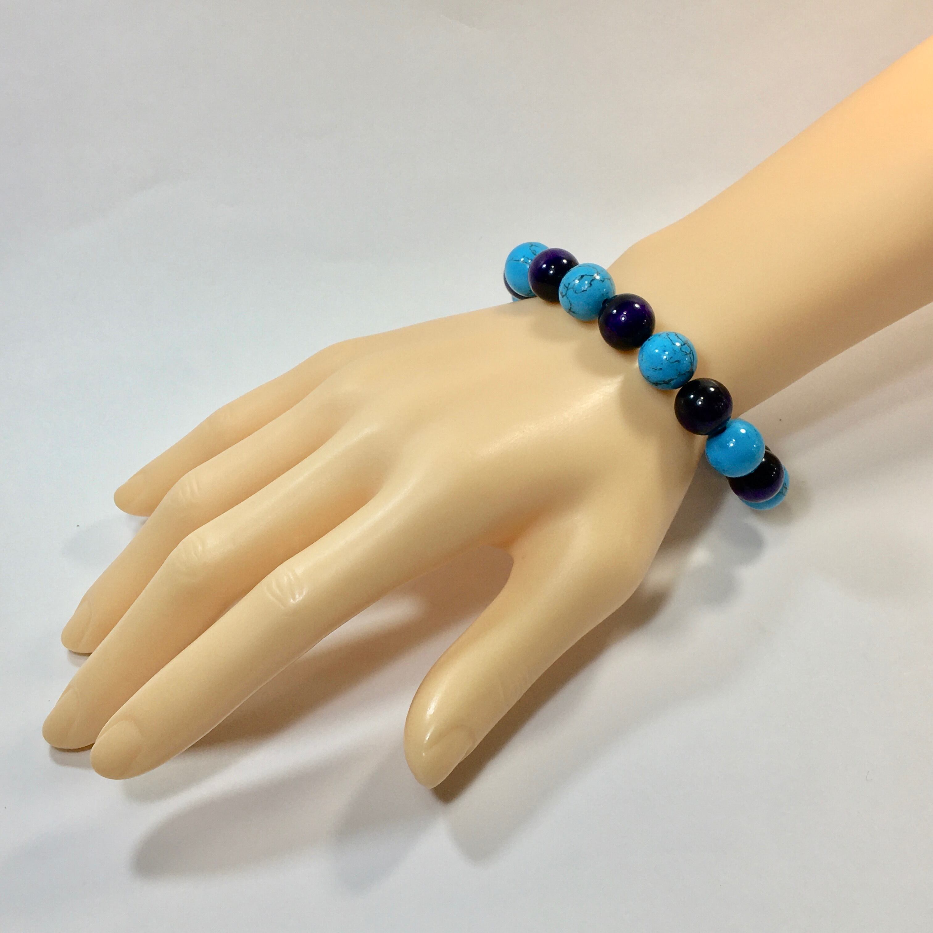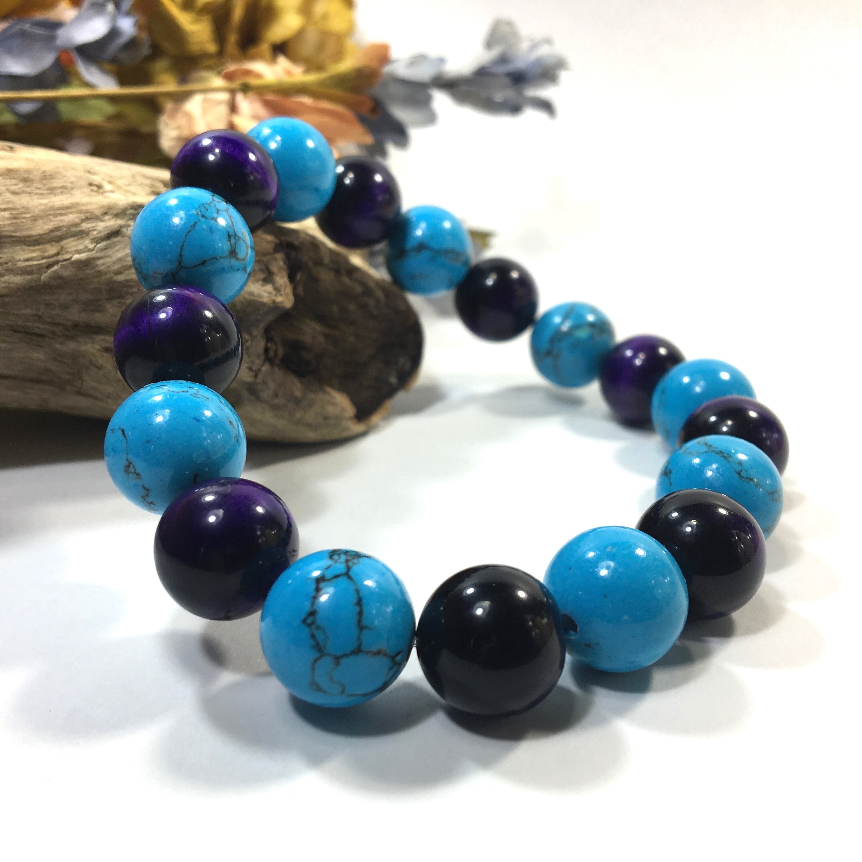 こちらは、ターコイズとパープルタイガーアイを交互に組み合わせたパワーストーンブレスレットです。シンプルなデザインですのでどんなコーディネートとも合わせ易いブレスレットです。程よくインパクトがある12mm玉を使用して内周約18cmです。数に限りがございますので気になる方はお早めにどうぞ。
