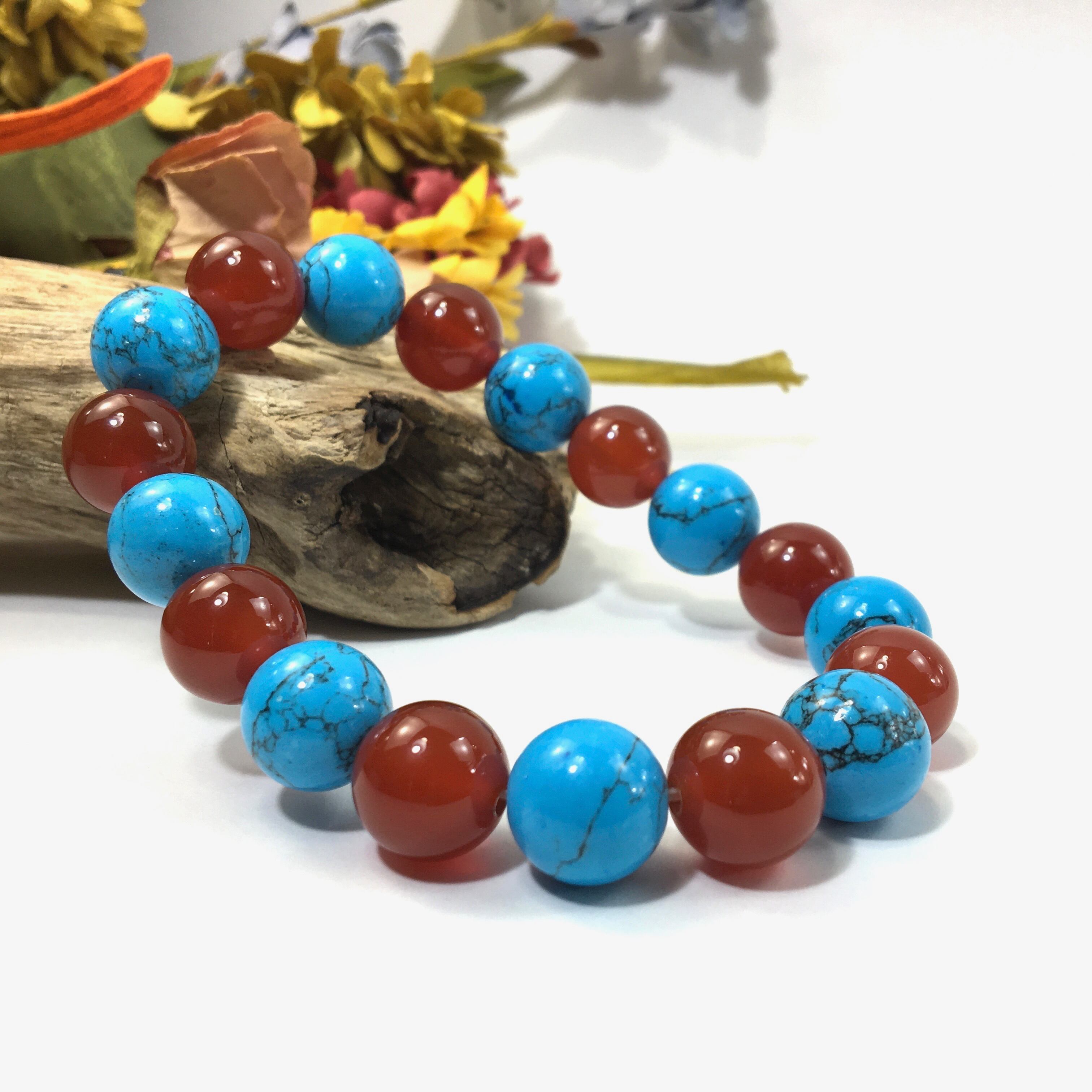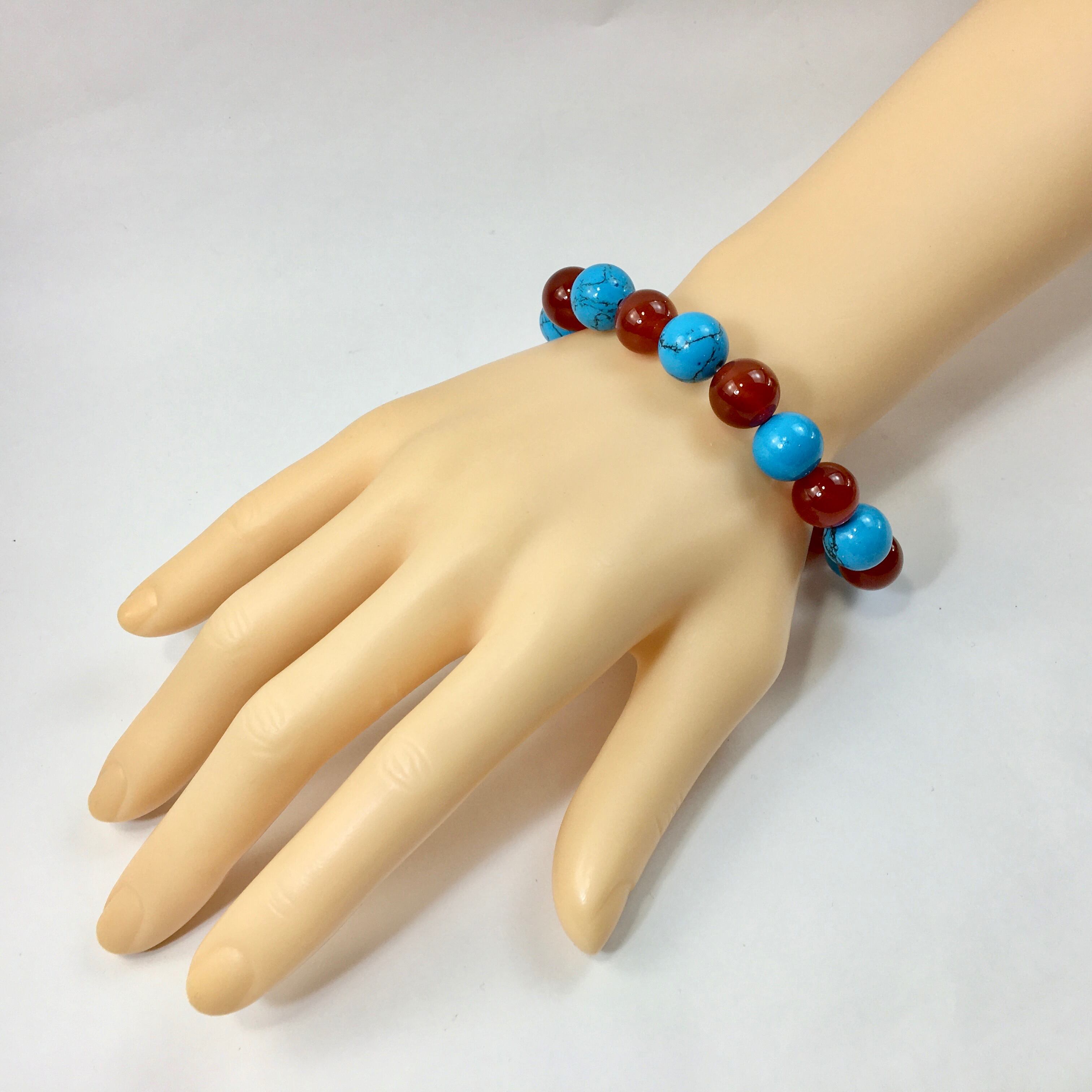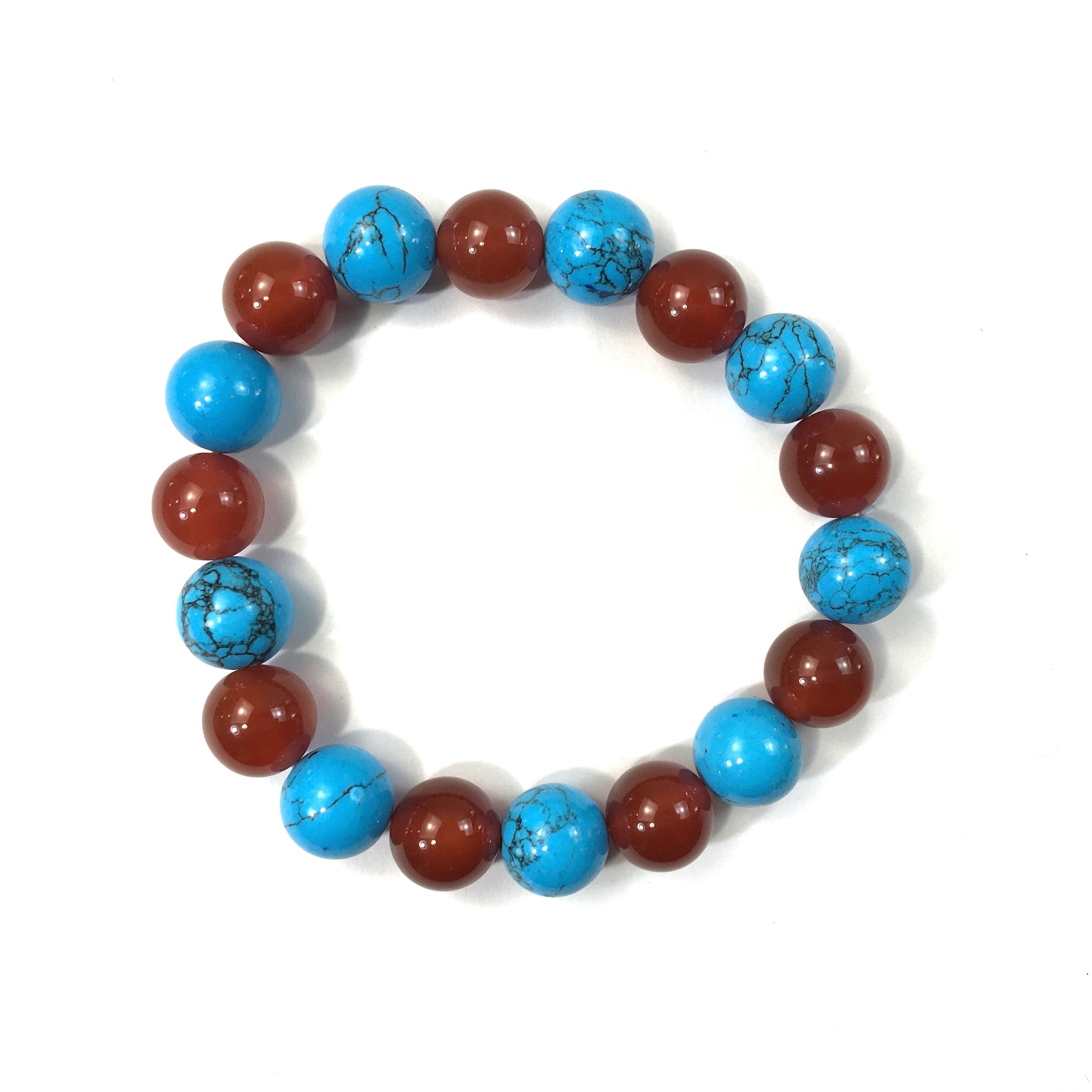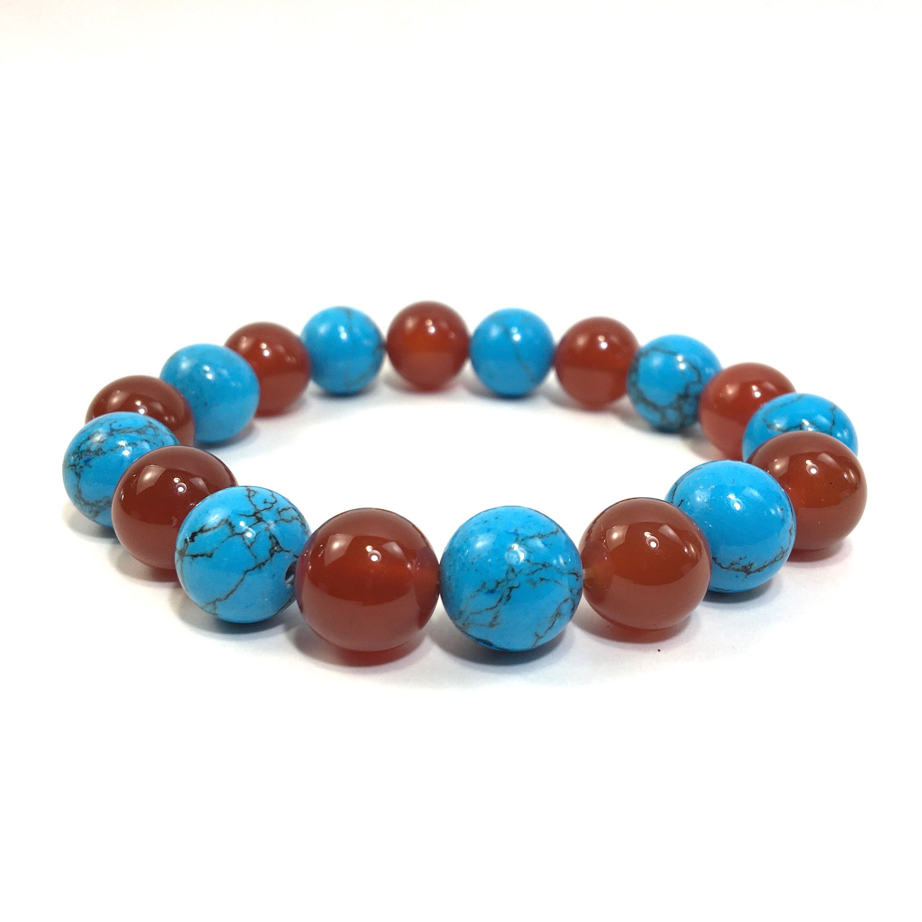 こちらは、ターコイズと赤瑪瑙を交互に組み合わせたパワーストーンブレスレットです。シンプルなデザインですのでどんなコーディネートとも合わせ易いブレスレットです。程よくインパクトがある12mm玉を使用して内周約18cmです。数に限りがございますので気になる方はお早めにどうぞ。