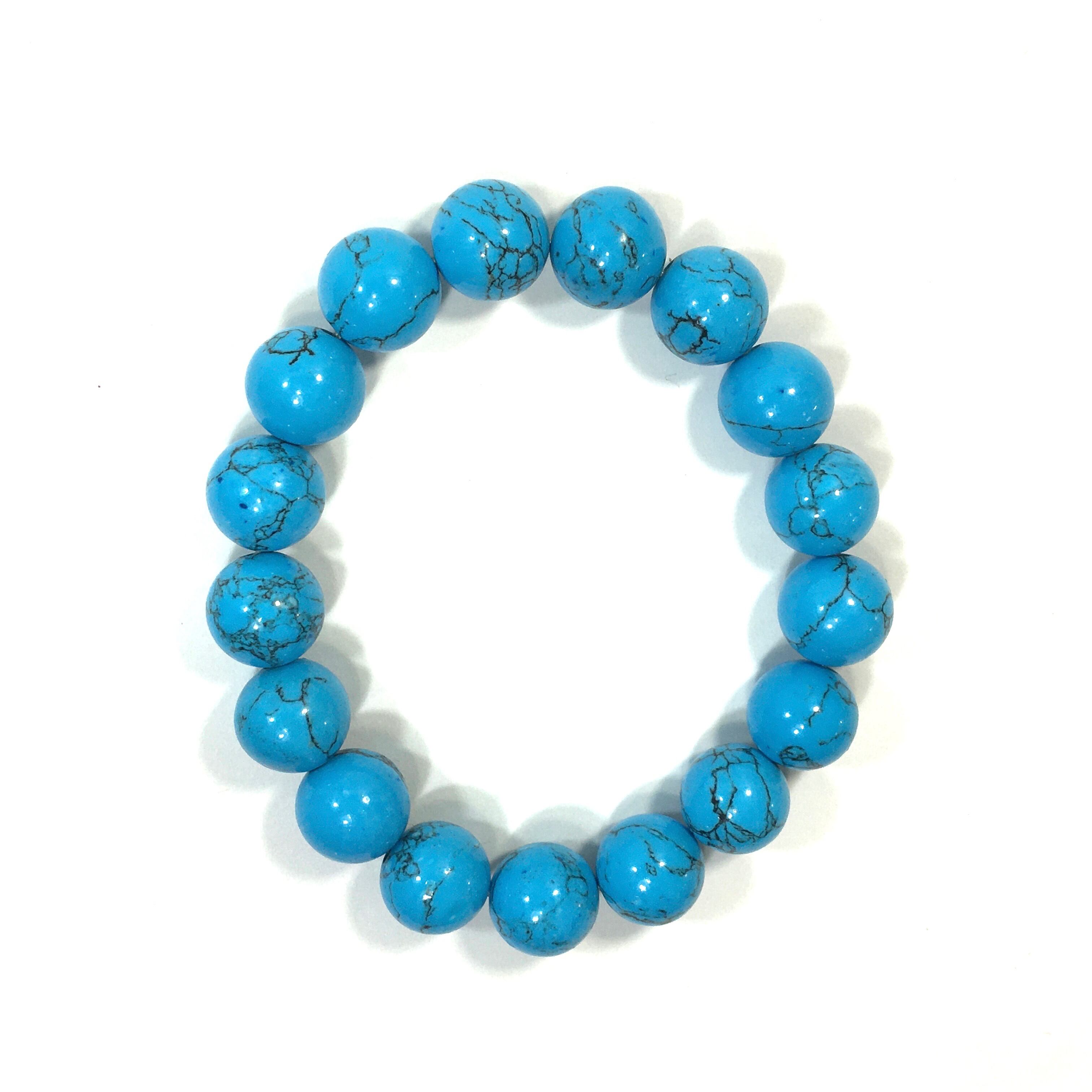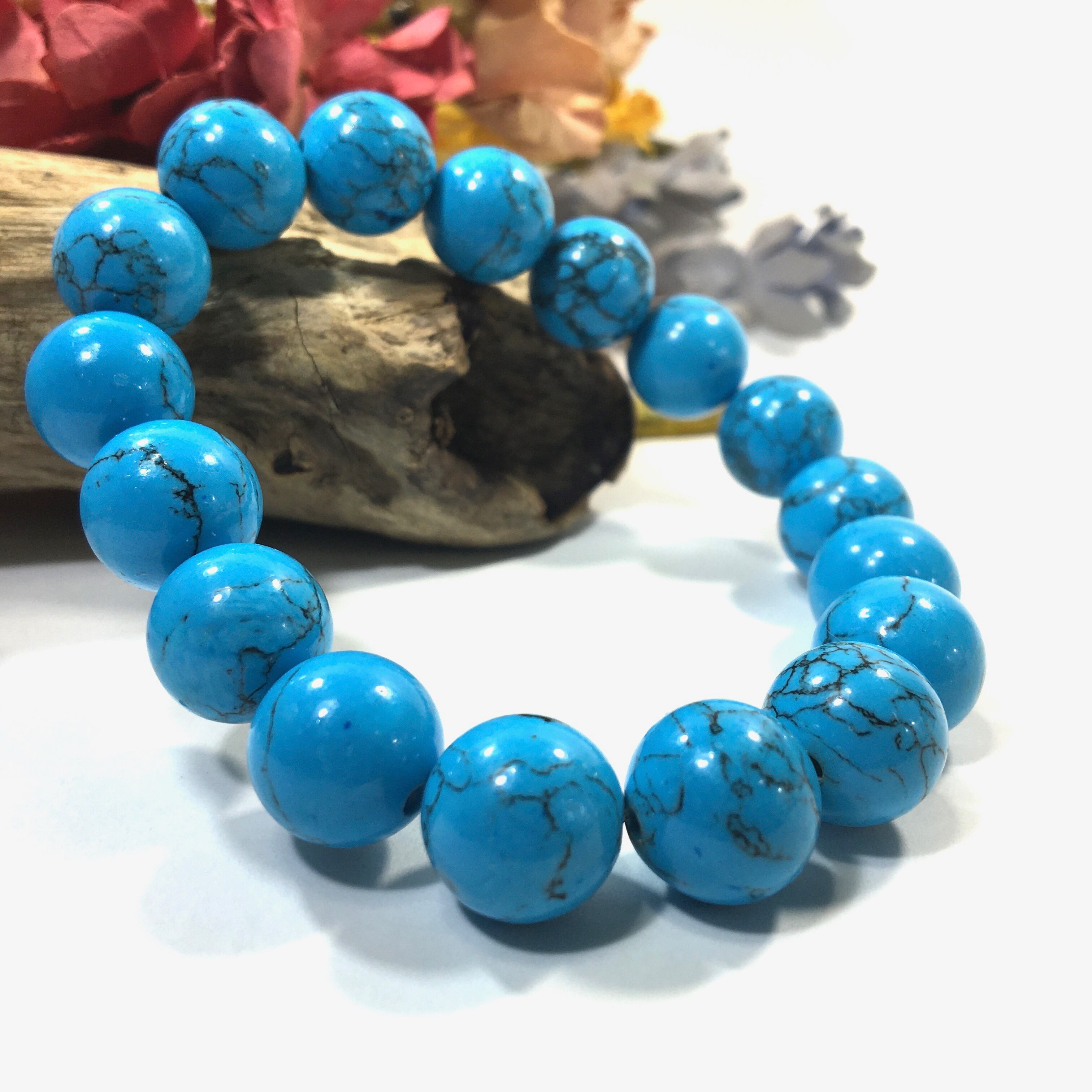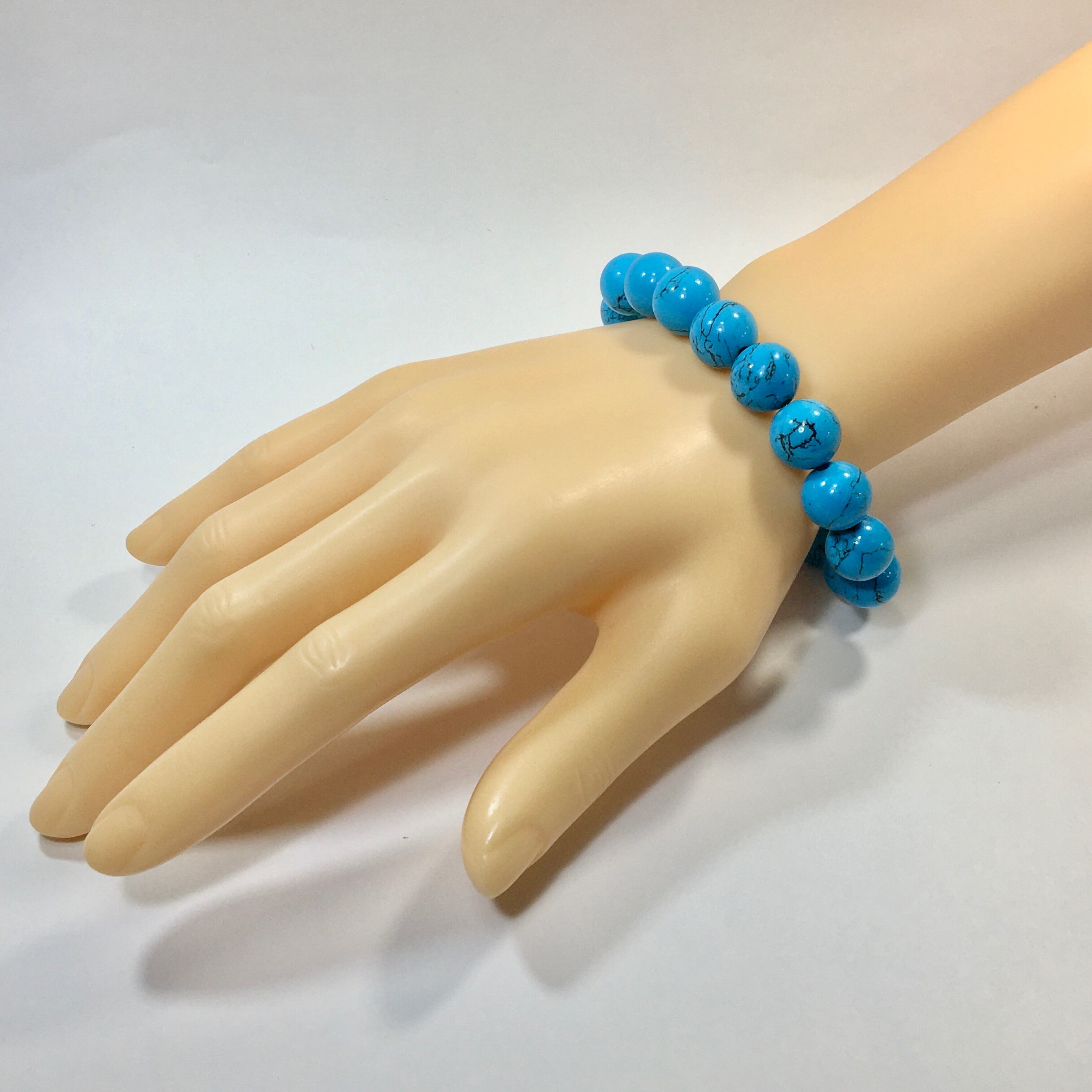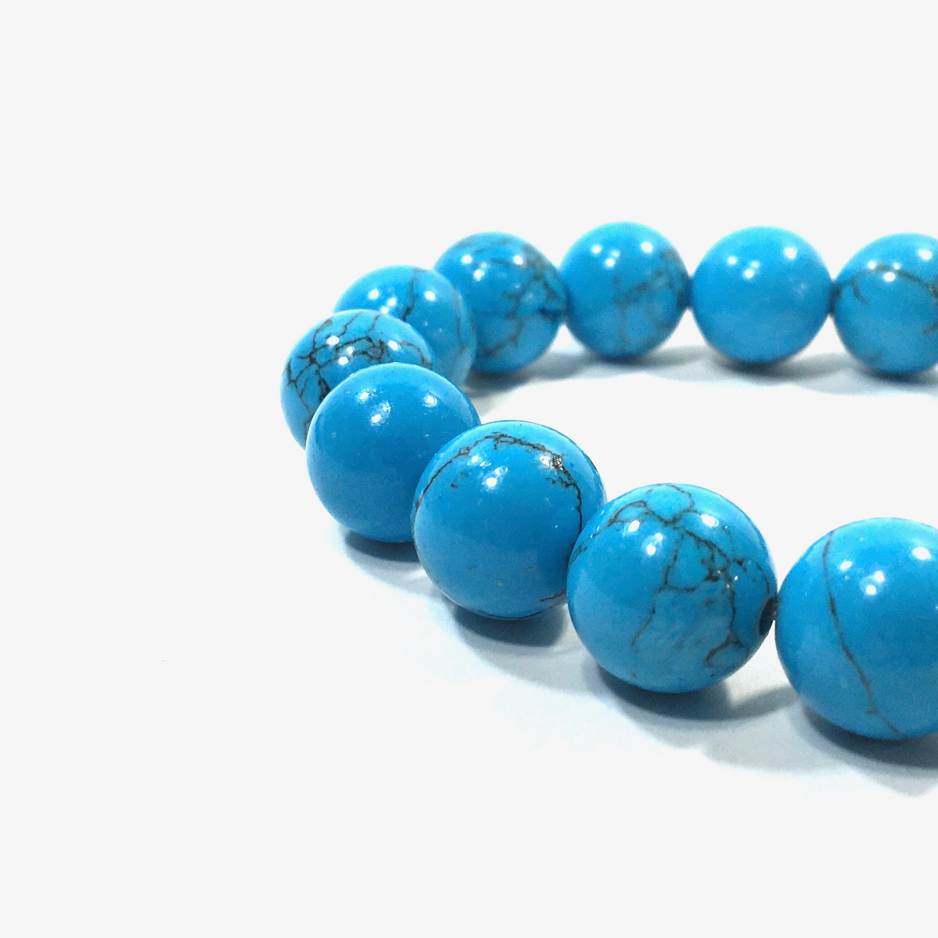 こちらは、12mm玉のターコイズを使用したブレスレットです。シンプルなデザインですのでどんなコーディネートとも合わせ易いブレスレットです。石大きさは12mm玉です。内周約17cmです。気になる方は是非この機会にどうぞ。