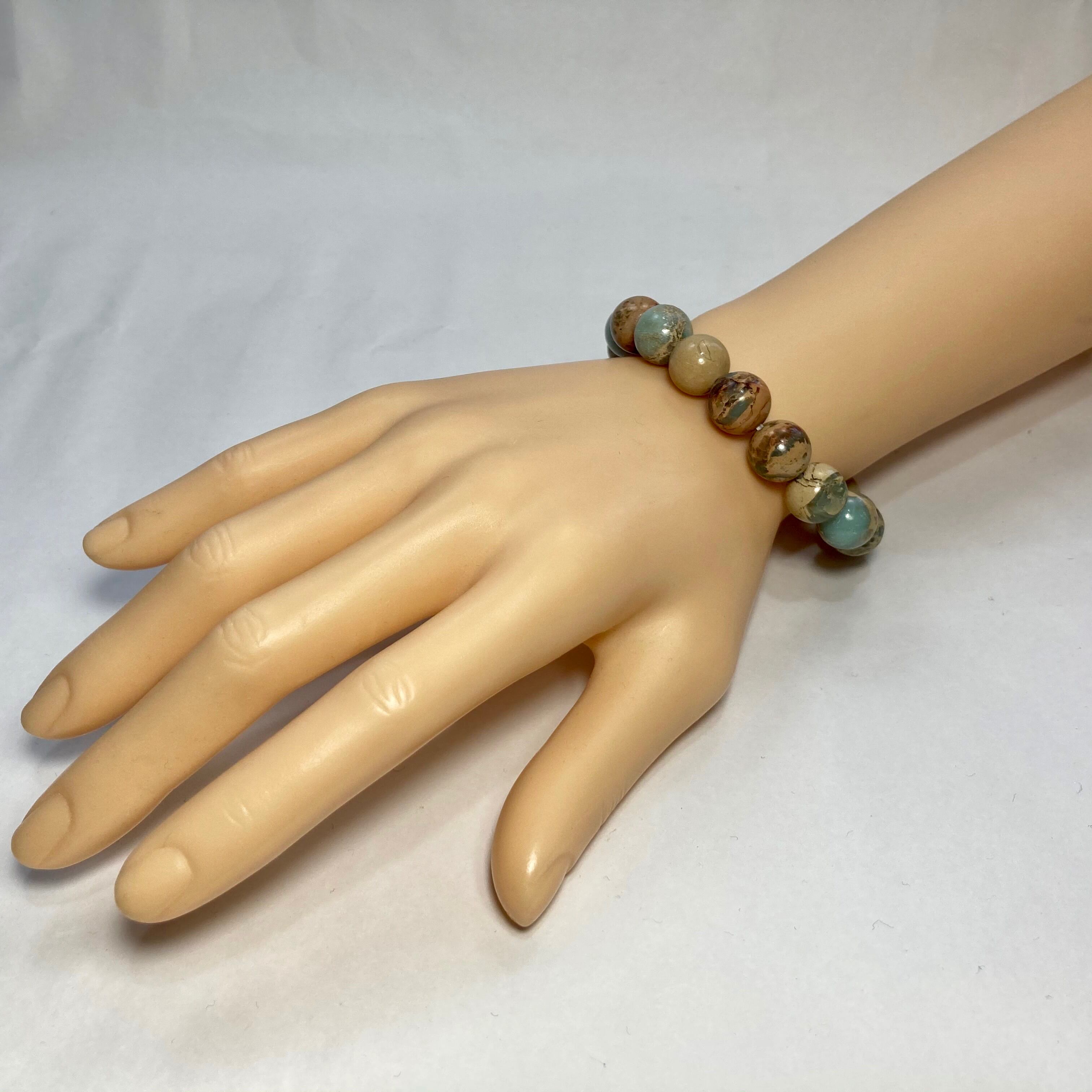 こちらは、12mm玉のインプレッションストーンを使用した天然石ブレスレットです。シンプルなデザインですのでどんなコーディネートとも合わせ易いブレスレットです。石大きさは12mm玉です。内周約17cmです。気になる方は是非この機会にどうぞ。