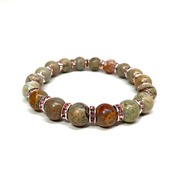 過去の辛いトラウマや記憶を癒やし中枢神経系のバランスを取り 、不安や焦りを手放す手助けをしてくれるヒーリング ストーンです。悩み事やストレスなどから持ち主を守り、精神の安定をもたらしてくれる石です。そしてマイナスな感情を鎮め、ポジティブな考えへと導き、安らぎやリラックス効果をもたらしてくれると言われています。近年知られるようになった石で、 淡いグリーンにベージュ 、ブラウンカラーの織りなす芸術的な美しさが特徴の天然石です。