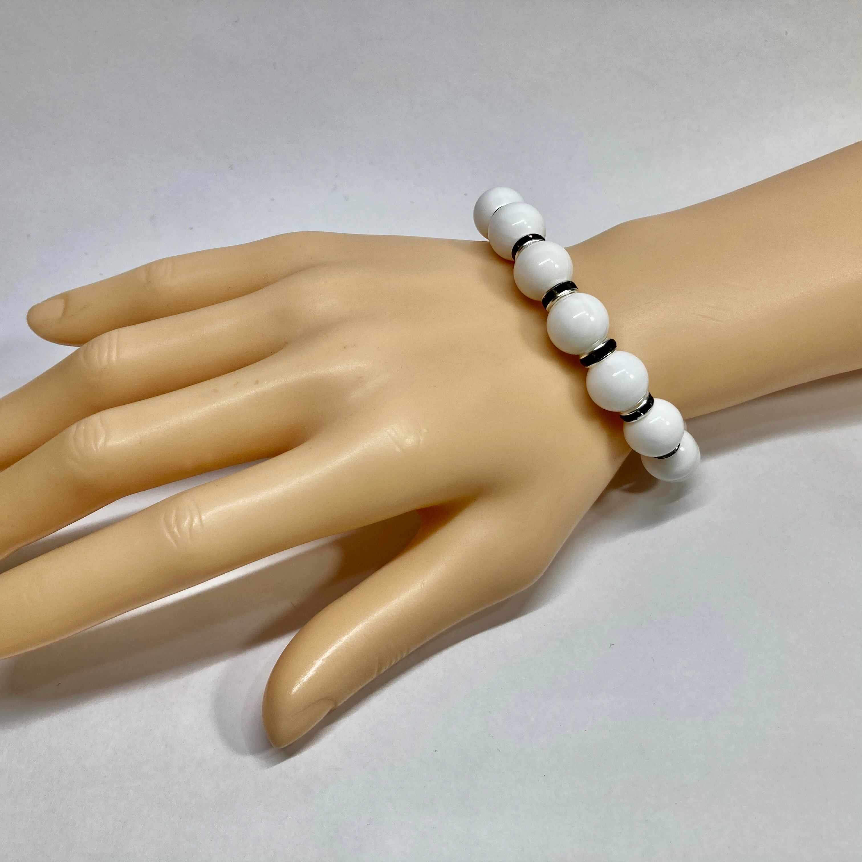 こちらは、ホワイトオニキスの10mm玉を使用したパワーストーンブレスレットです。石との間にはロンデルを挟み高級感を演出しております。シンプルなデザインは、シーン問わずどんなコーディネートとも合わせ易いブレスレットです。サイズは種類を選択からお選びください。(内周約14cm?内周約22cmでお選び頂けます)当社の中でも一番人気の実績があるデザインとなっております。気になる方はお早めにどうぞ。