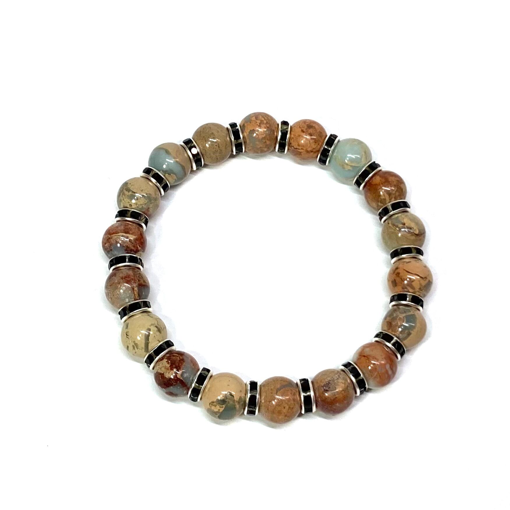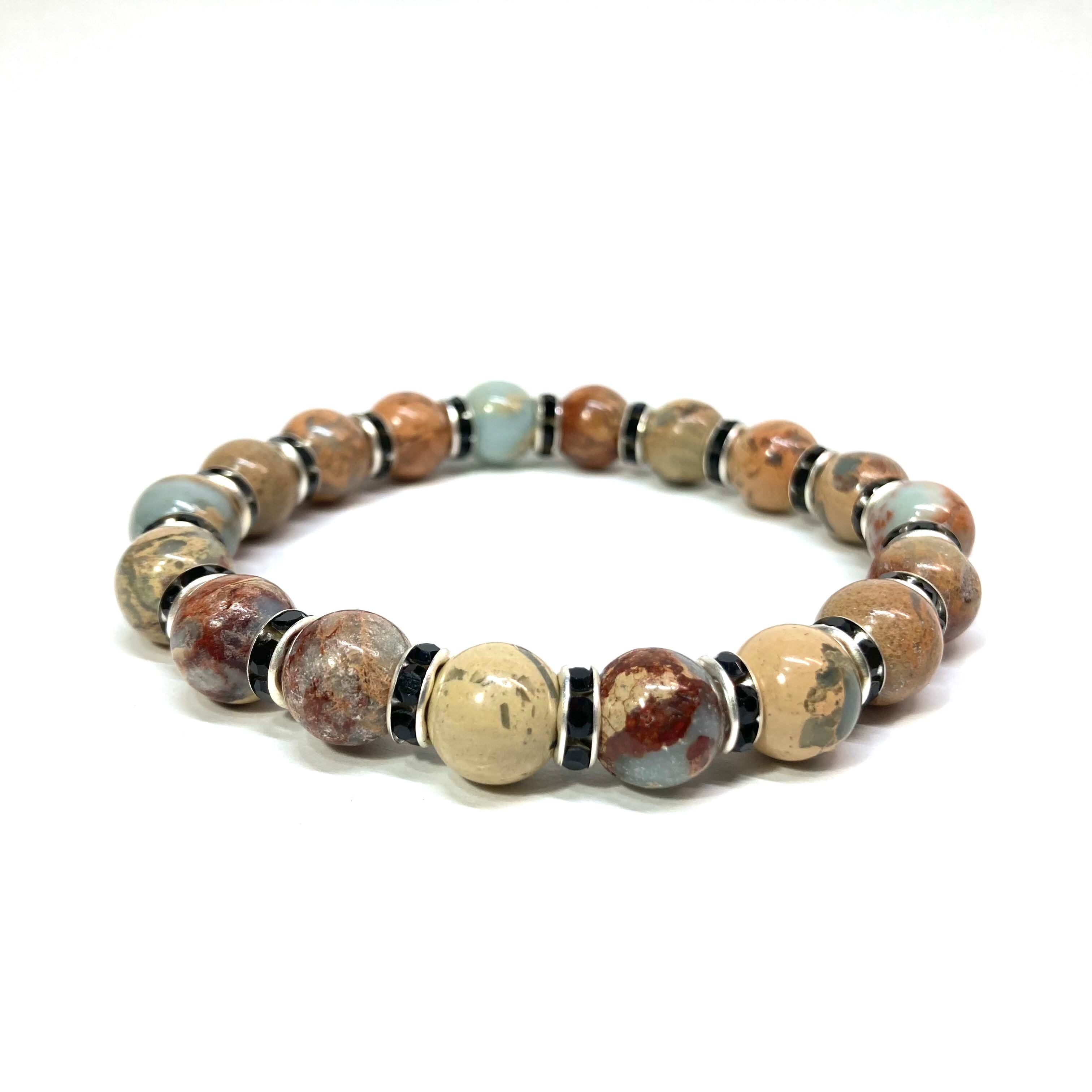 こちらは、インプレッションストーンの10mm玉を使用したパワーストーンブレスレットです。石との間にはロンデルを挟み高級感を演出しております。シンプルなデザインは、シーン問わずどんなコーディネートとも合わせ易いブレスレットです。サイズは種類を選択からお選びください。(内周約14cm?内周約22cmでお選び頂けます)当社の中でも一番人気の実績があるデザインとなっております。気になる方はお早めにどうぞ。