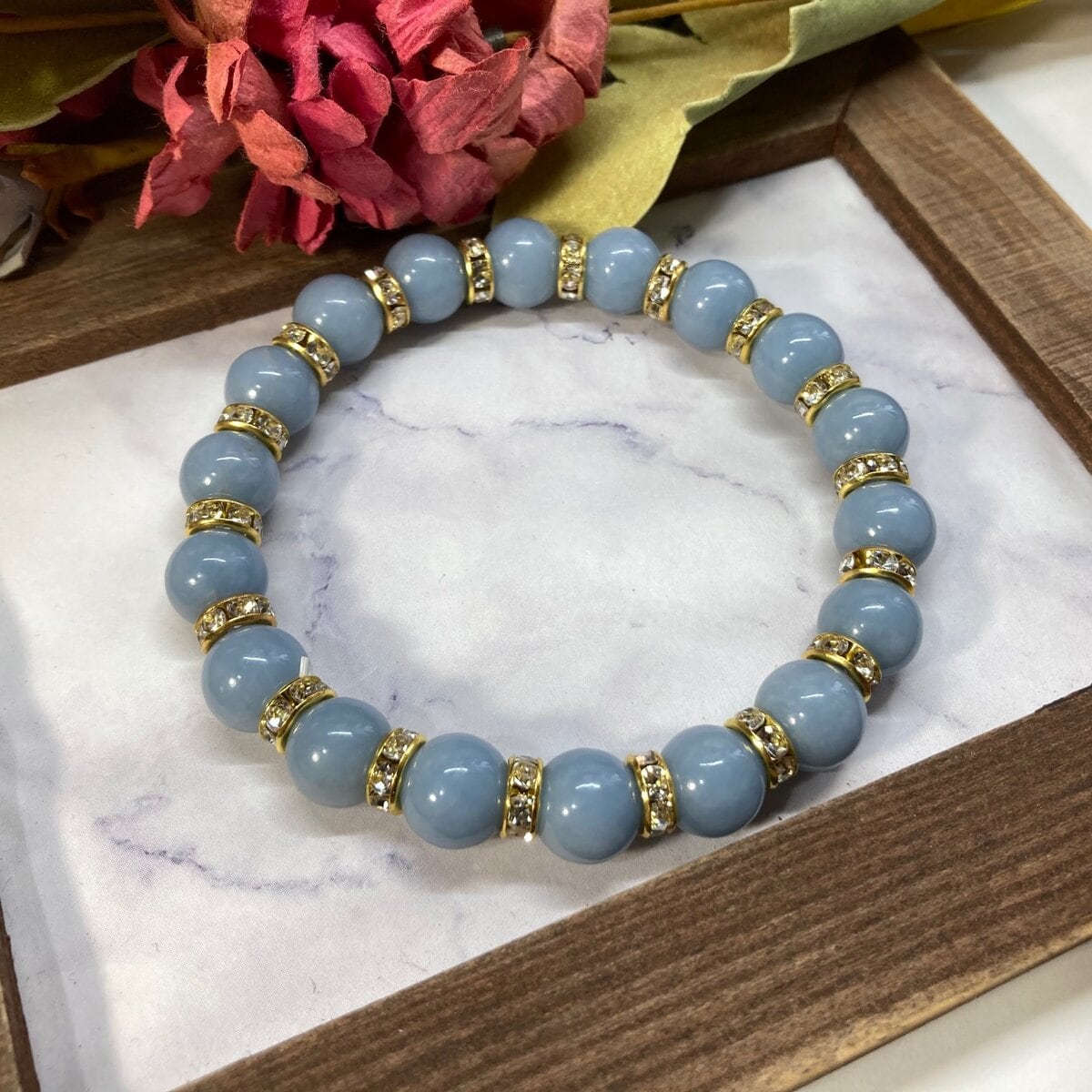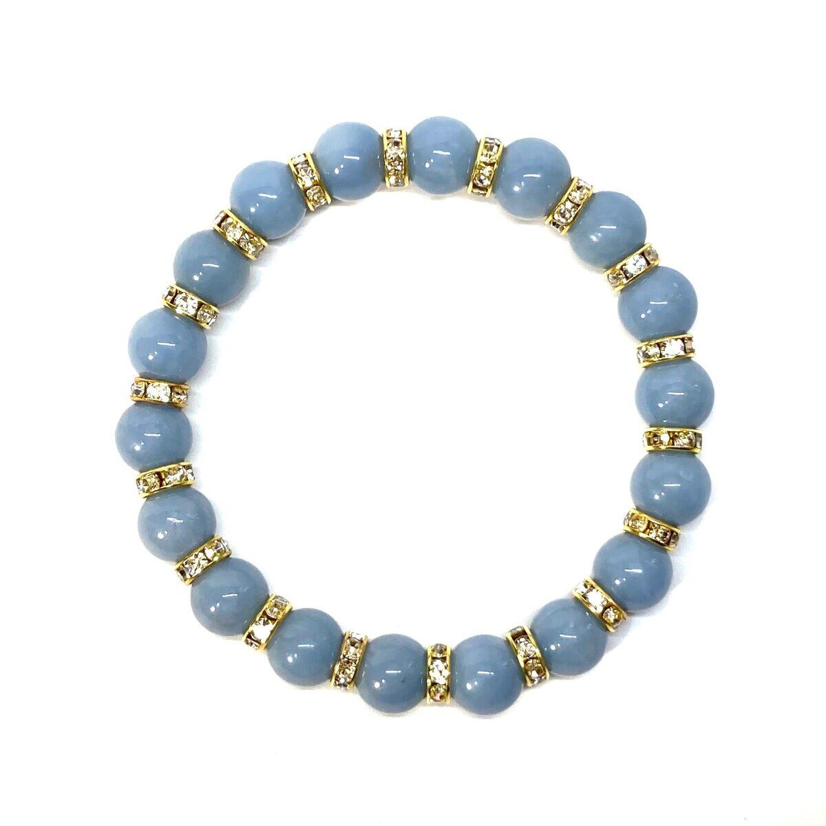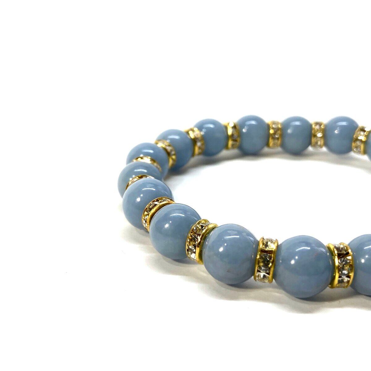 こちらは、エンジェライトの10mm玉を使用したパワーストーンブレスレットです。石との間にはロンデルを挟み高級感を演出しております。シンプルなデザインは、シーン問わずどんなコーディネートとも合わせ易いブレスレットです。サイズは種類を選択からお選びください。(内周約14cm?内周約22cmでお選び頂けます)当社の中でも一番人気の実績があるデザインとなっております。気になる方はお早めにどうぞ。