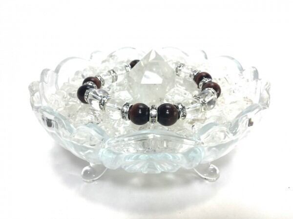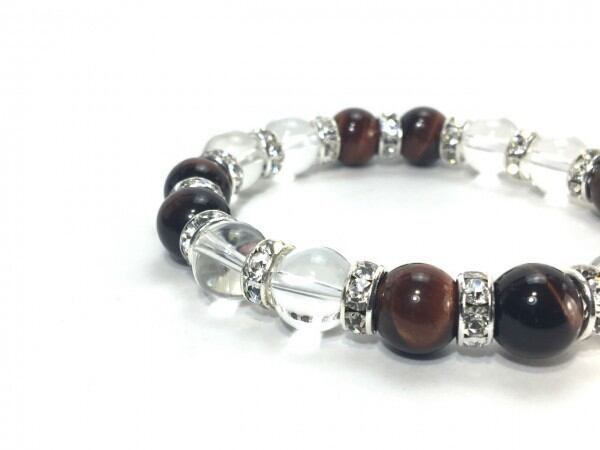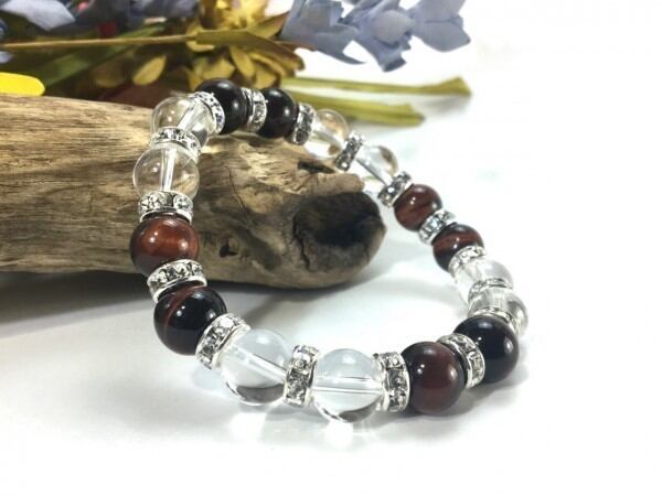 こちらは、レッドタイガーアイと水晶を組み合わせたブレスレットです。間にはロンデルを挟み高級感あるデザインに仕上がっています。石大きさは腕にも馴染みやすいように10mm玉で内周約16cm(伸可能)です。数に限りがございますので気になる方はお早めにどうぞ。