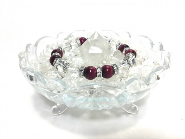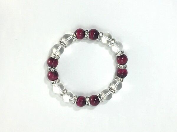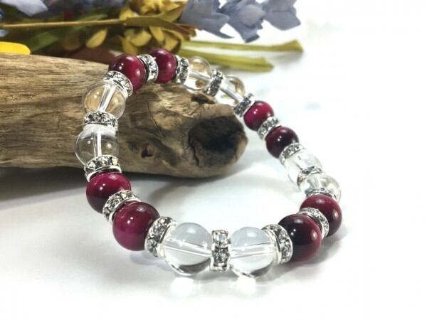 こちらは、ピンクタイガーアイと水晶を組み合わせたブレスレットです。間にはロンデルを挟み高級感あるデザインに仕上がっています。石大きさは腕にも馴染みやすいように10mm玉で内周約16cm(伸可能)です。数に限りがございますので気になる方はお早めにどうぞ。