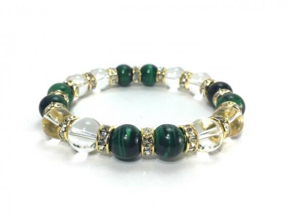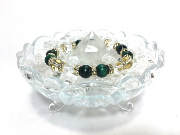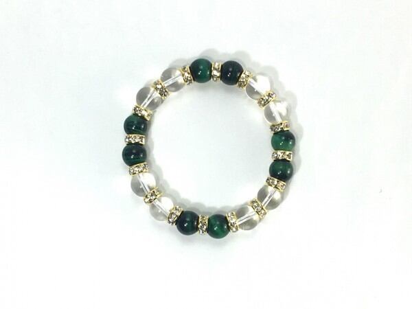 こちらは、グリーンタイガーアイと水晶を組み合わせたブレスレットです。間にはロンデルを挟み高級感あるデザインに仕上がっています。石大きさは腕にも馴染みやすいように10mm玉で内周約16cm(伸可能)です。数に限りがございますので気になる方はお早めにどうぞ。