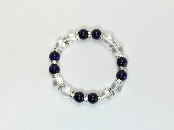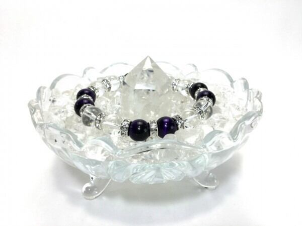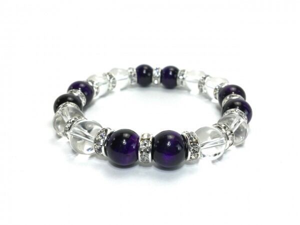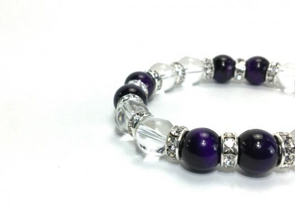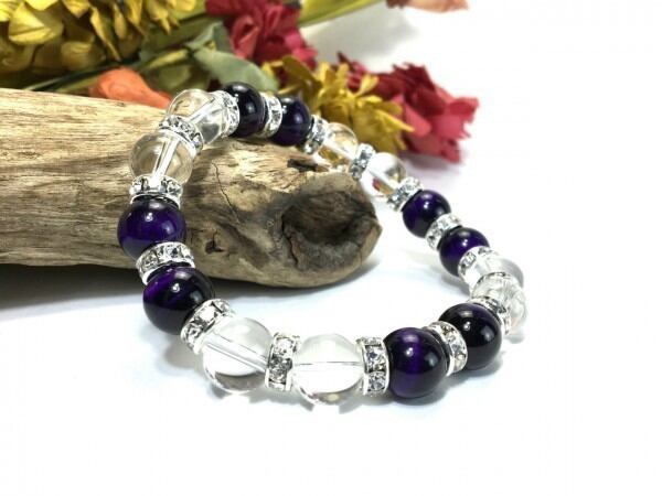 こちらは、パープルタイガーアイと水晶を組み合わせたブレスレットです。間にはロンデルを挟み高級感あるデザインに仕上がっています。石大きさは腕にも馴染みやすいように10mm玉で内周約16cm(伸可能)です。数に限りがございますので気になる方はお早めにどうぞ。
