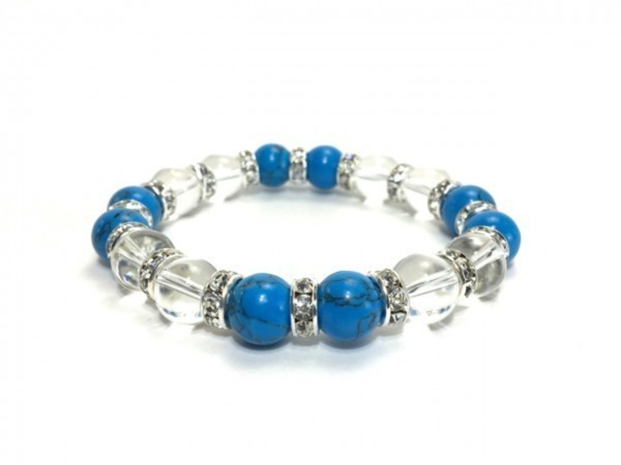 こちらは、ターコイズと水晶を組み合わせたブレスレットです。間にはロンデルを挟み高級感あるデザインに仕上がっています。石大きさは腕にも馴染みやすいように10mm玉で内周約16cm(伸可能)です。数に限りがございますので気になる方はお早めにどうぞ。