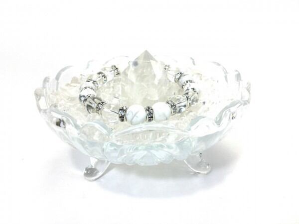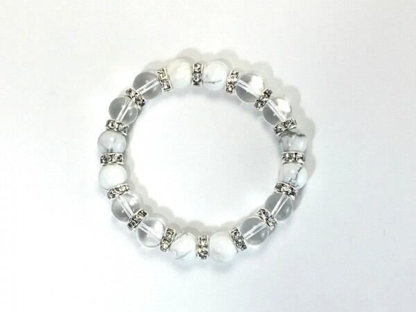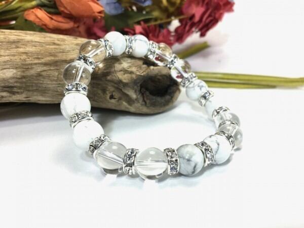 こちらは、ハウライトと水晶を組み合わせたブレスレットです。間にはロンデルを挟み高級感あるデザインに仕上がっています。石大きさは腕にも馴染みやすいように10mm玉で内周約16cm(伸可能)です。数に限りがございますので気になる方はお早めにどうぞ。