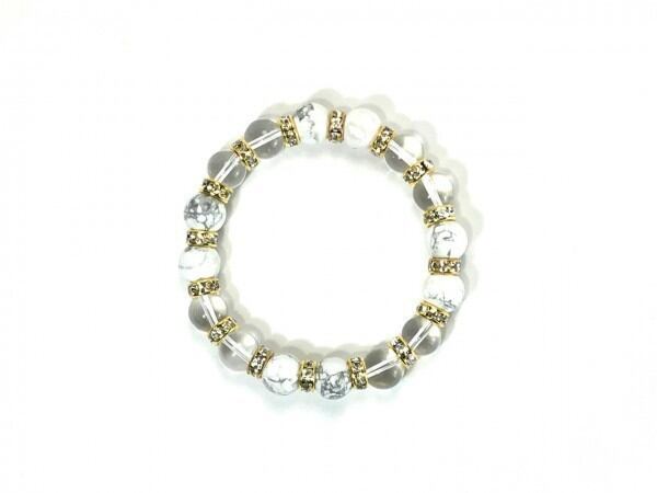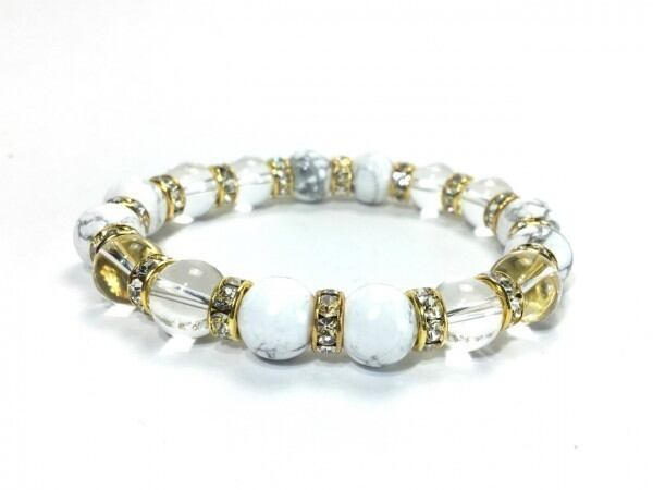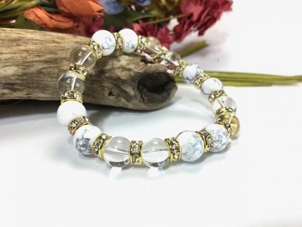こちらは、ハウライトと水晶を組み合わせたブレスレットです。間にはロンデルを挟み高級感あるデザインに仕上がっています。石大きさは腕にも馴染みやすいように10mm玉で内周約16cm(伸可能)です。数に限りがございますので気になる方はお早めにどうぞ。