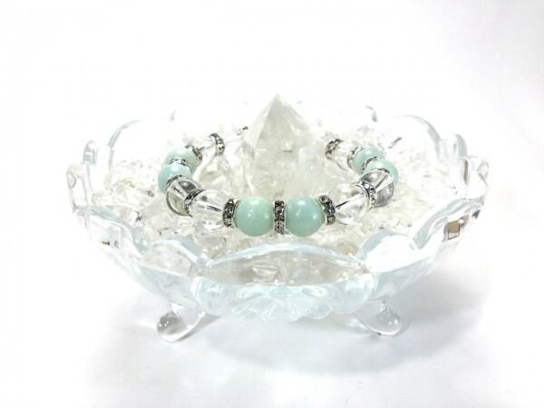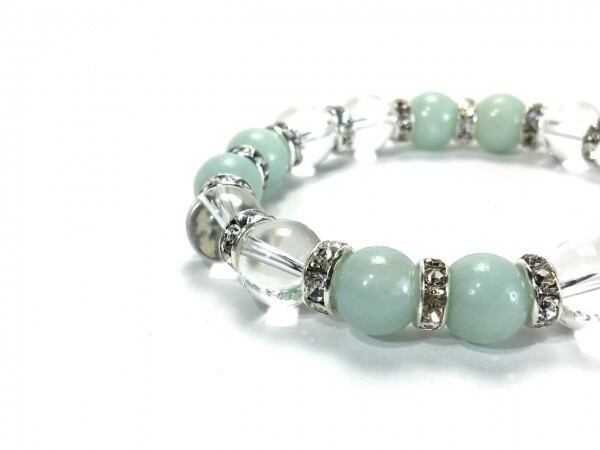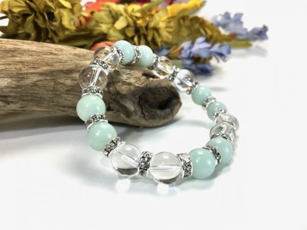 こちらは、アマゾナイトと水晶を組み合わせたブレスレットです。間にはロンデルを挟み高級感あるデザインに仕上がっています。石大きさは腕にも馴染みやすいように10mm玉で内周約16cm(伸可能)です。数に限りがございますので気になる方はお早めにどうぞ。