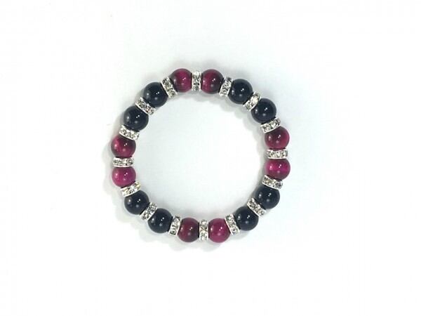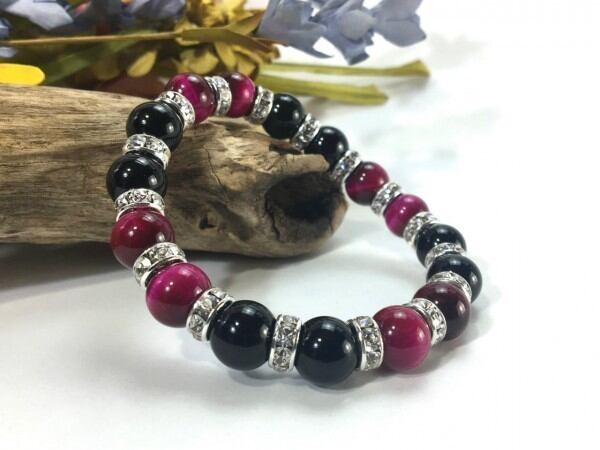 こちらは、ピンクタイガーアイとオニキスを組み合わせたブレスレットです。間にはロンデルを挟み高級感あるデザインに仕上がっています。石大きさは腕にも馴染みやすいように10mm玉で内周約16cm(伸可能)です。数に限りがございますので気になる方はお早めにどうぞ。