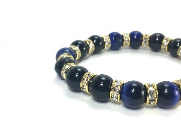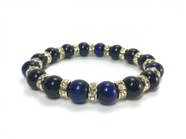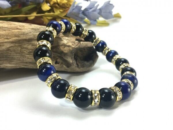 こちらは、ブルータイガーアイとオニキスを組み合わせたブレスレットです。間にはロンデルを挟み高級感あるデザインに仕上がっています。石大きさは腕にも馴染みやすいように10mm玉で内周約16cm(伸可能)です。数に限りがございますので気になる方はお早めにどうぞ。