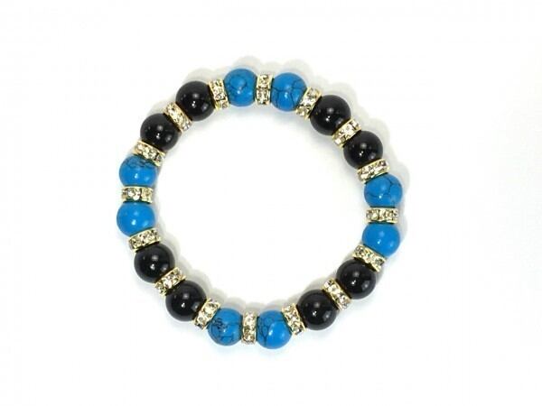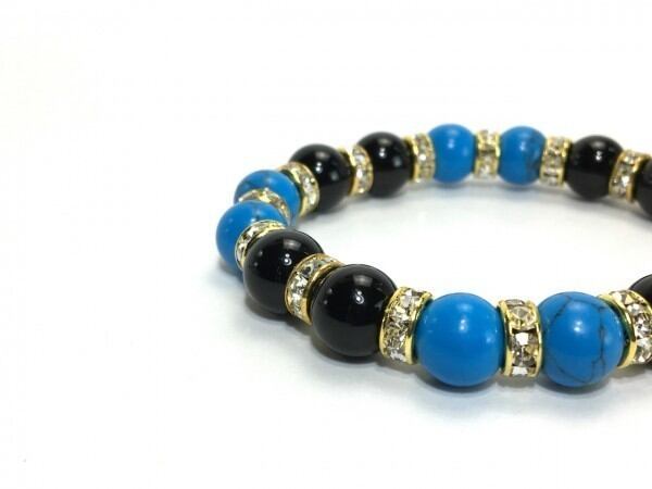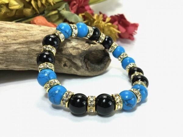 こちらは、ターコイズとオニキスを組み合わせたブレスレットです。間にはロンデルを挟み高級感あるデザインに仕上がっています。石大きさは腕にも馴染みやすいように10mm玉で内周約16cm(伸可能)です。数に限りがございますので気になる方はお早めにどうぞ。