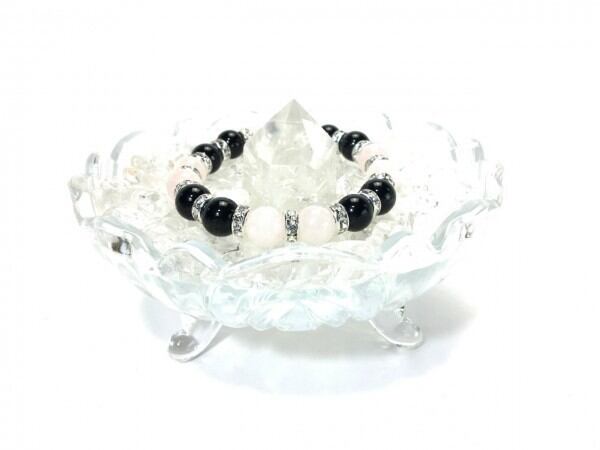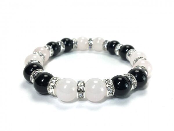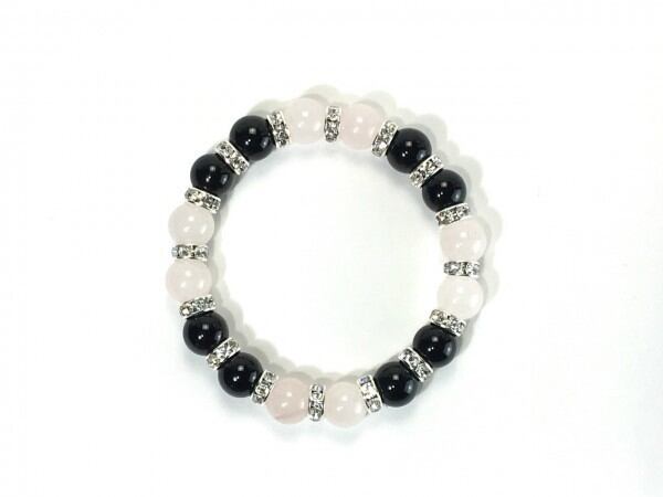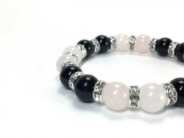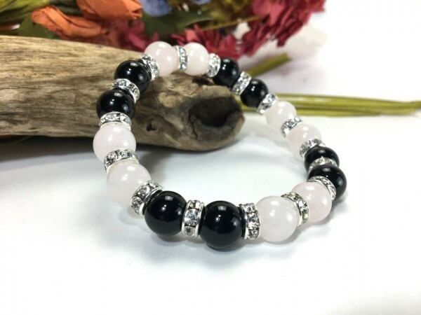 こちらは、ローズクォーツとオニキスを組み合わせたブレスレットです。間にはロンデルを挟み高級感あるデザインに仕上がっています。石大きさは腕にも馴染みやすいように10mm玉で内周約16cm(伸可能)です。数に限りがございますので気になる方はお早めにどうぞ。
