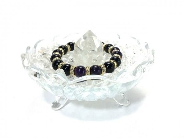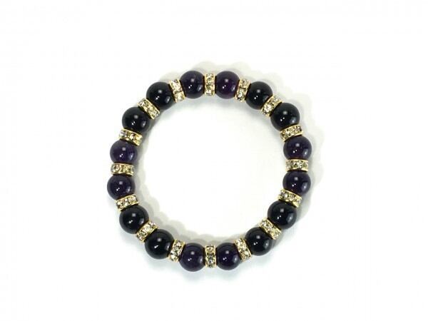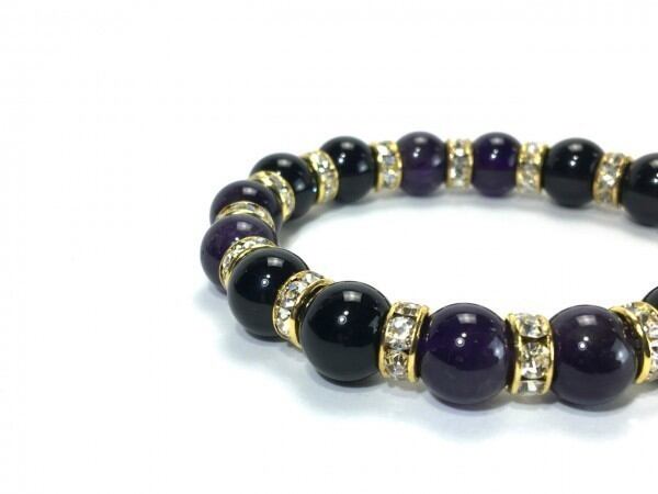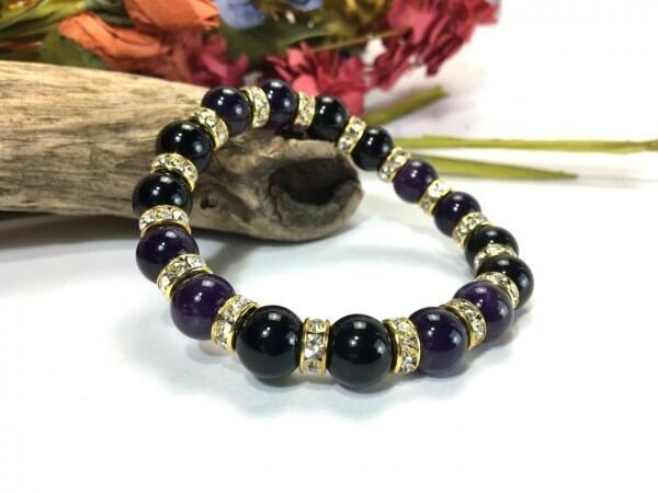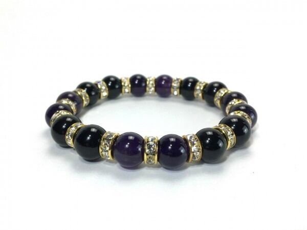 こちらは、アメジストとオニキスを組み合わせたブレスレットです。間にはロンデルを挟み高級感あるデザインに仕上がっています。石大きさは腕にも馴染みやすいように10mm玉で内周約16cm(伸可能)です。数に限りがございますので気になる方はお早めにどうぞ。