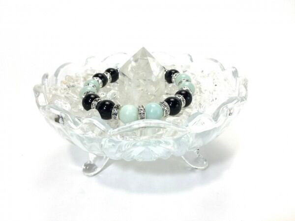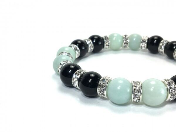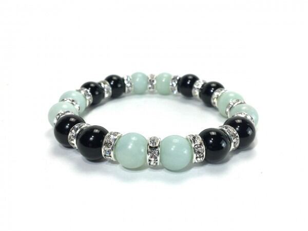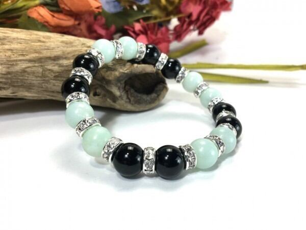 こちらは、アマゾナイトとオニキスを組み合わせたブレスレットです。間にはロンデルを挟み高級感あるデザインに仕上がっています。石大きさは腕にも馴染みやすいように10mm玉で内周約16cm(伸可能)です。数に限りがございますので気になる方はお早めにどうぞ。