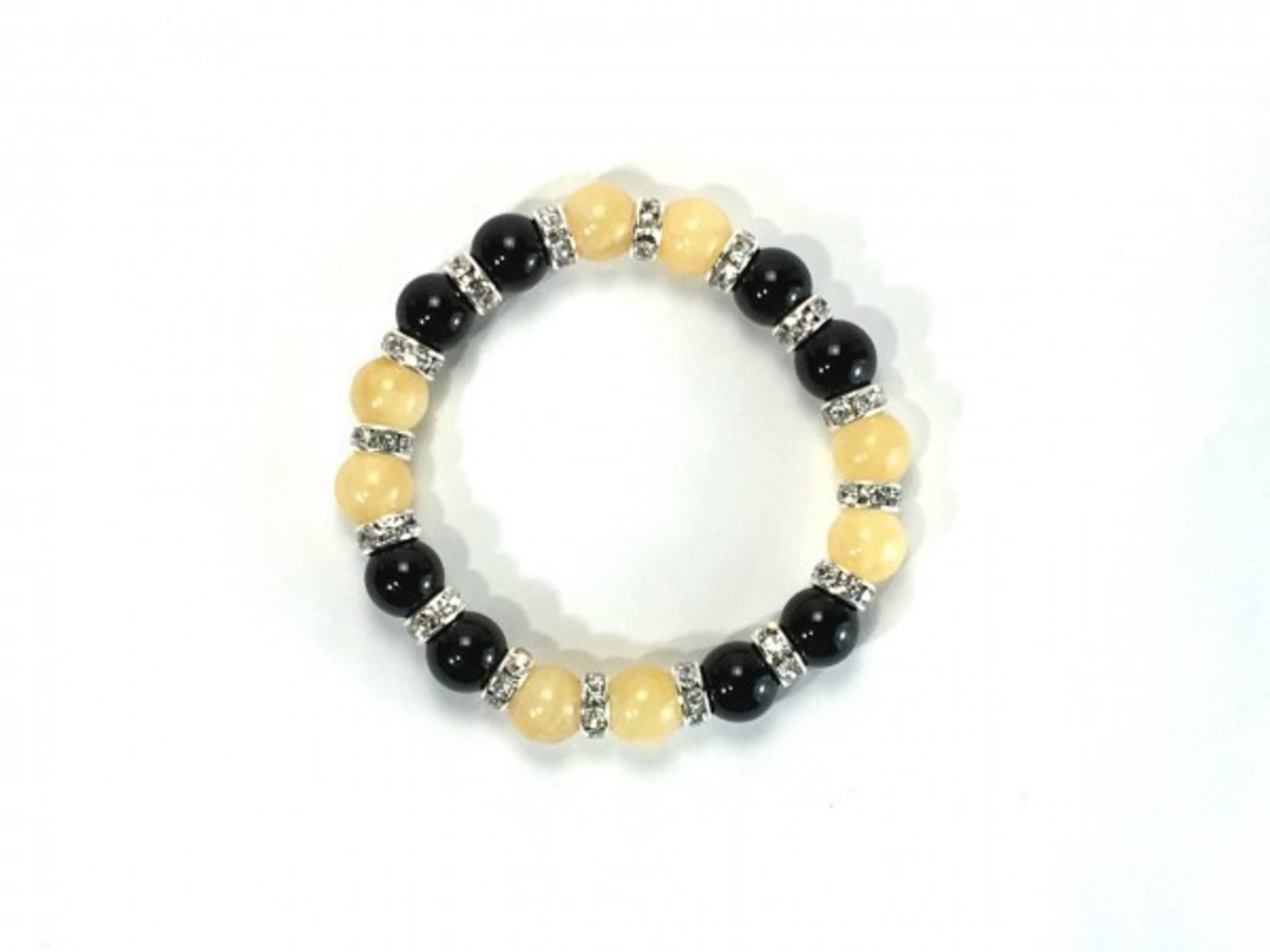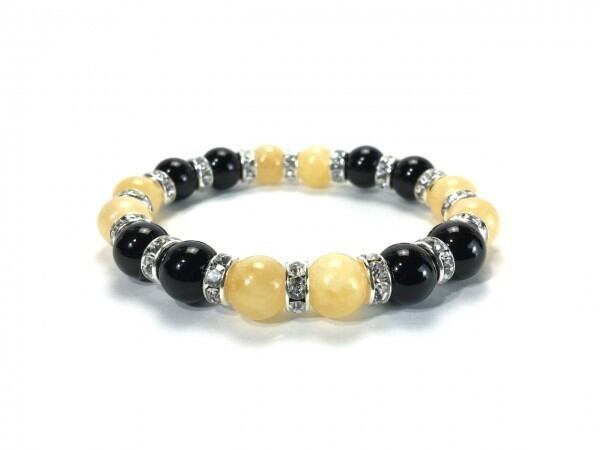 こちらは、アラゴナイトとオニキスを組み合わせたブレスレットです。間にはロンデルを挟み高級感あるデザインに仕上がっています。石大きさは腕にも馴染みやすいように10mm玉で内周約16cm(伸可能)です。数に限りがございますので気になる方はお早めにどうぞ。