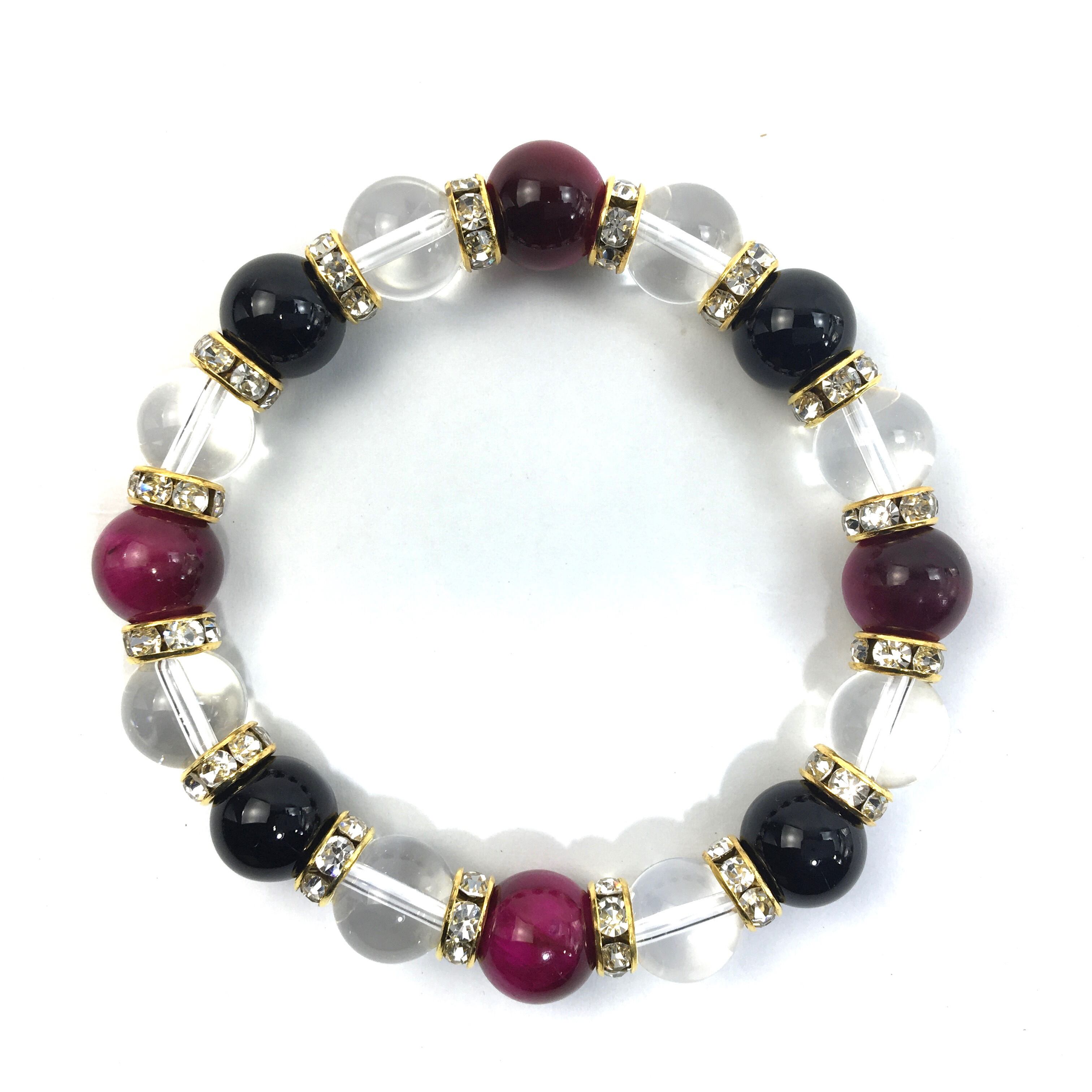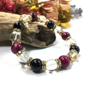 こちらは、ピンクタイガーアイと水晶とオニキスを組み合わせたブレスレットです。間にはロンデルを挟み高級感あるデザインに仕上がっています。石大きさは腕にも馴染みやすいように10mm玉で内周約16cmです。数に限りがございますので気になる方はお早めにどうぞ。