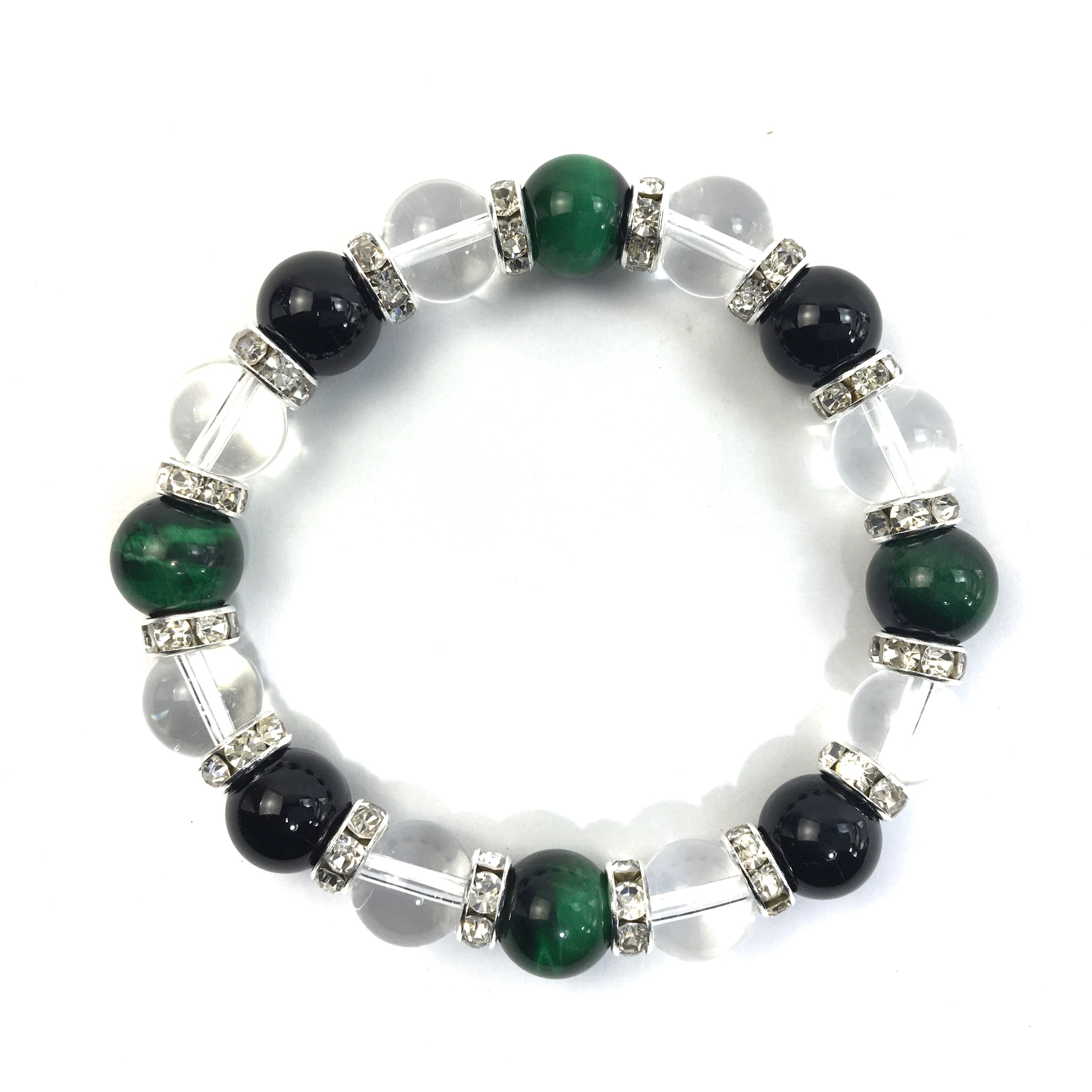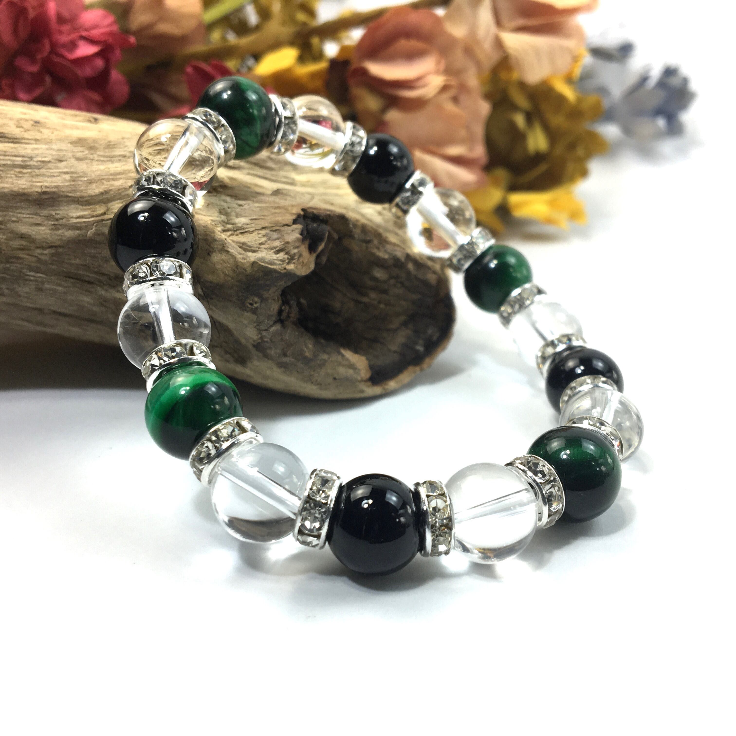 グリーンタイガーアイ×水晶×オニキス パワーストーン ブレスレット 10mm(シルバー)メンズ・レディース 男性・女性 数珠ブレス 開運 ☆