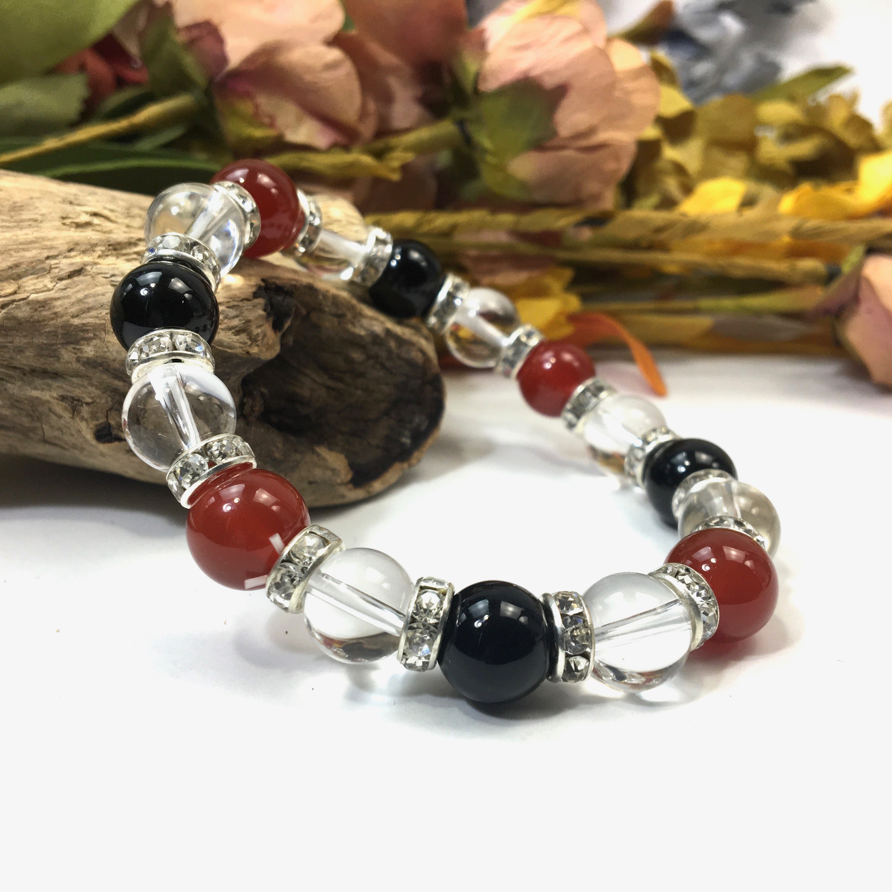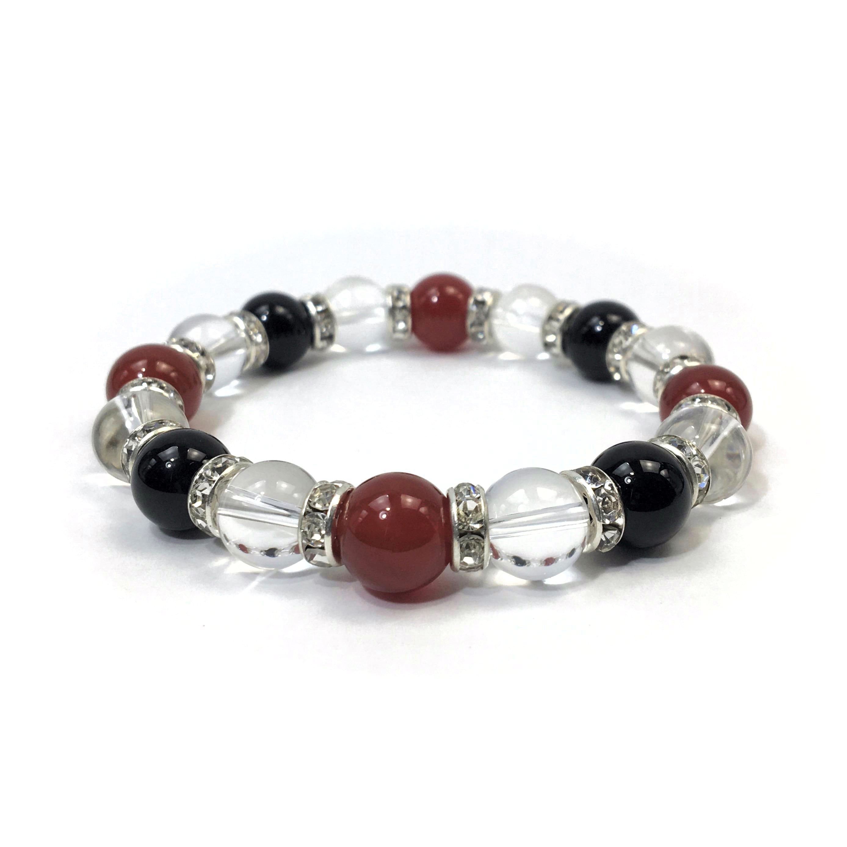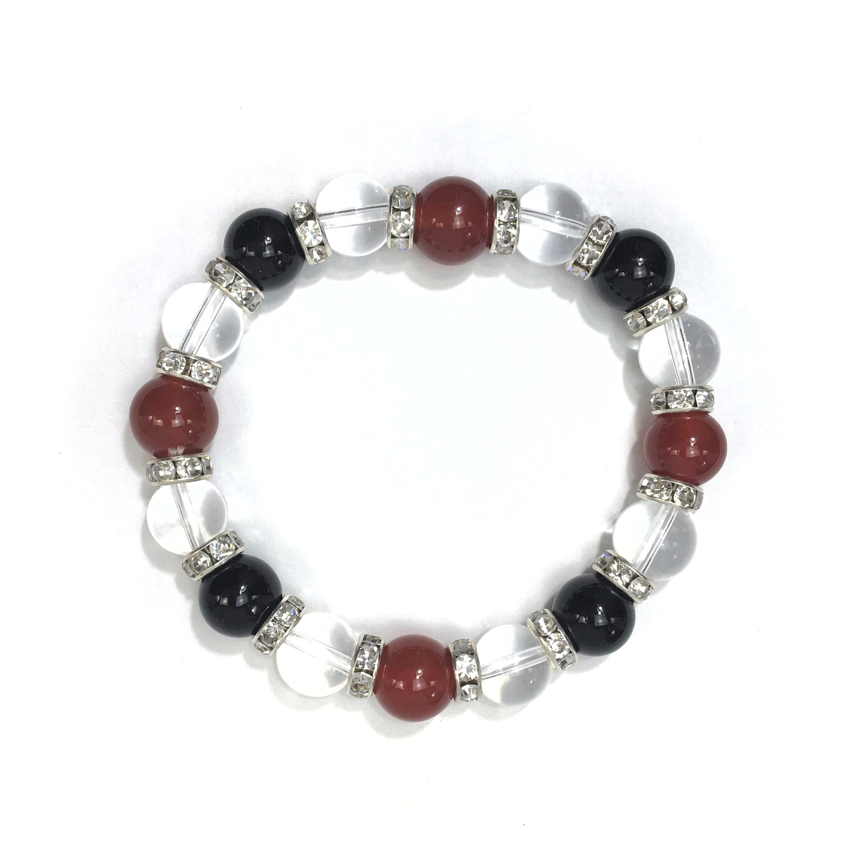 こちらは、赤瑪瑙と水晶とオニキスを組み合わせたブレスレットです。間にはロンデルを挟み高級感あるデザインに仕上がっています。石大きさは腕にも馴染みやすいように10mm玉で内周約16cmです。数に限りがございますので気になる方はお早めにどうぞ。