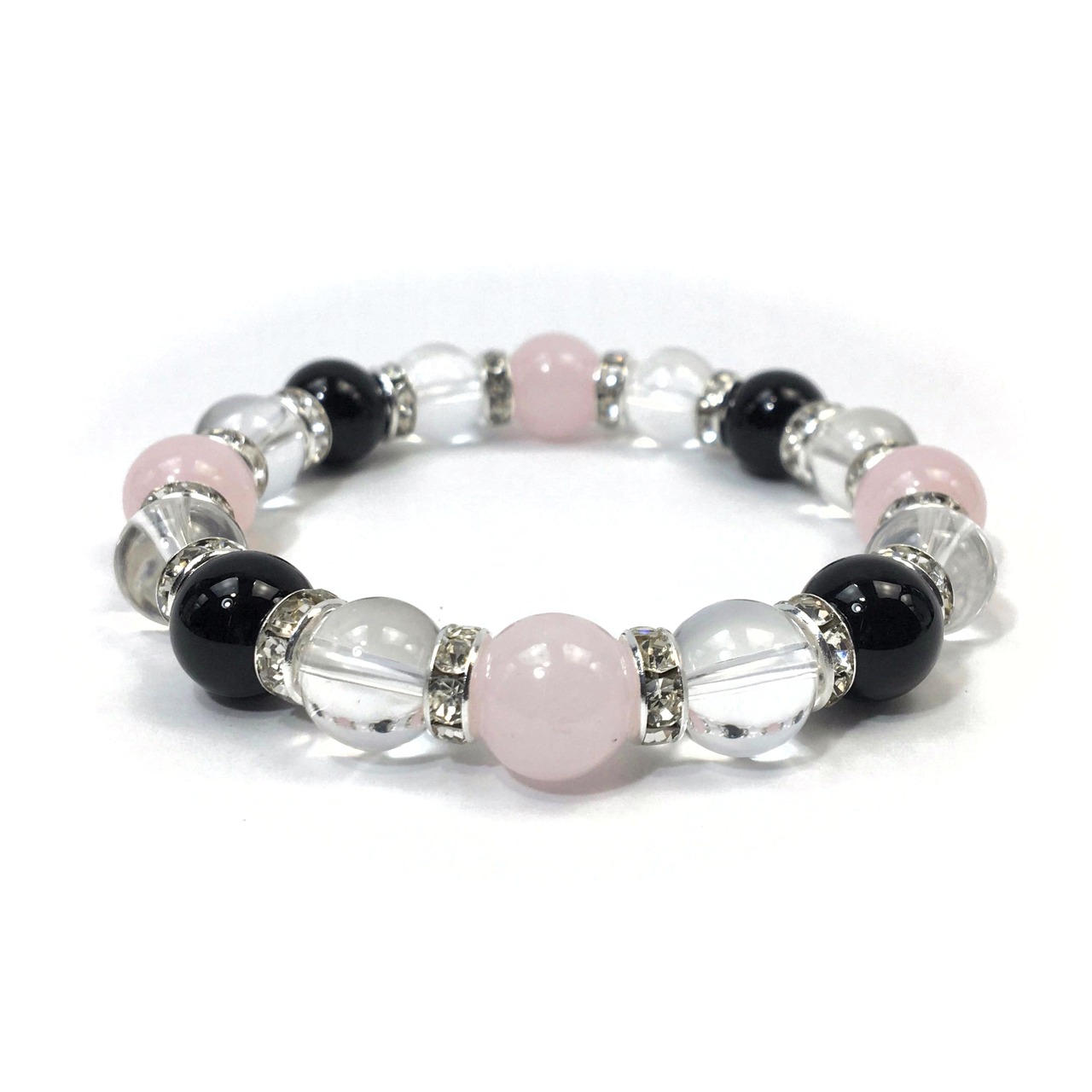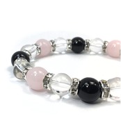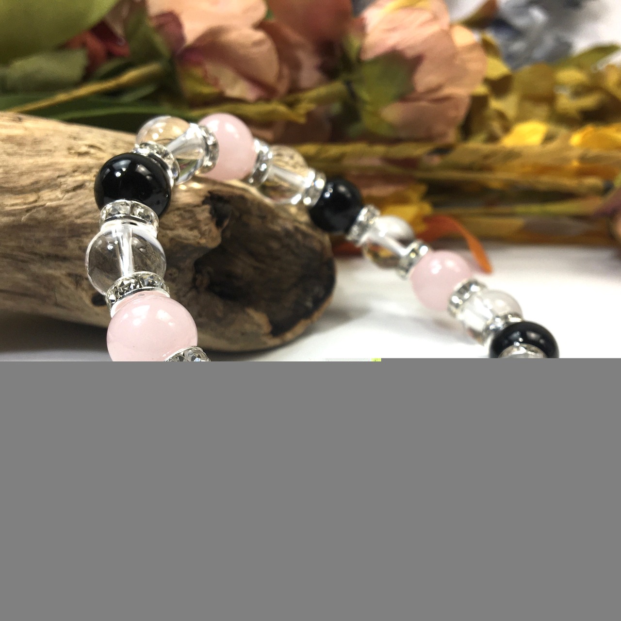 こちらは、ローズクォーツと水晶とオニキスを組み合わせたブレスレットです。間にはロンデルを挟み高級感あるデザインに仕上がっています。石大きさは腕にも馴染みやすいように10mm玉で内周約16cmです。数に限りがございますので気になる方はお早めにどうぞ。