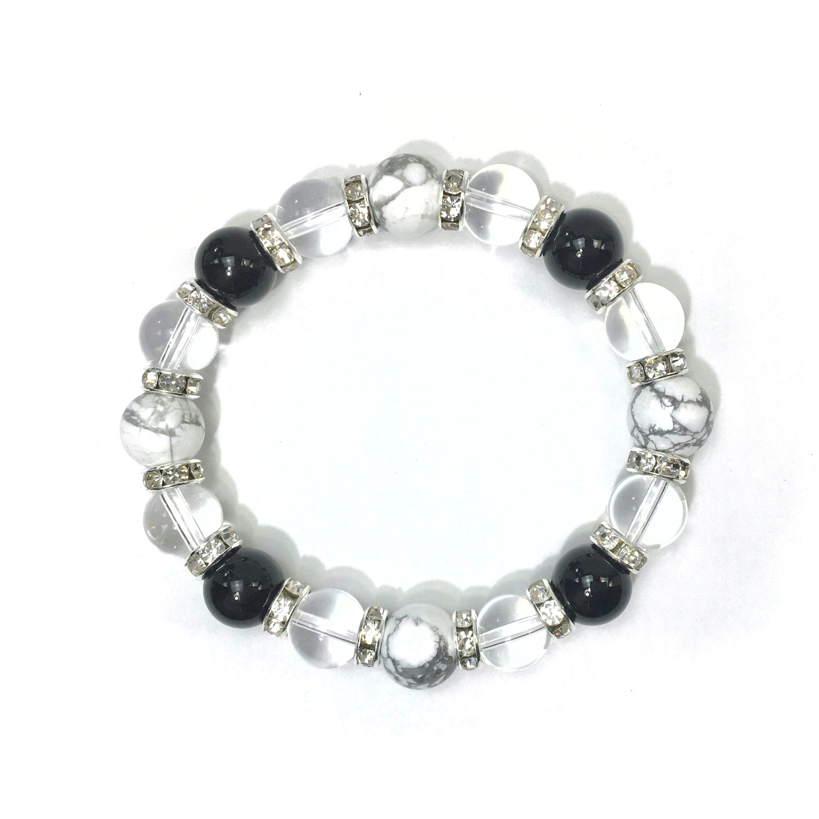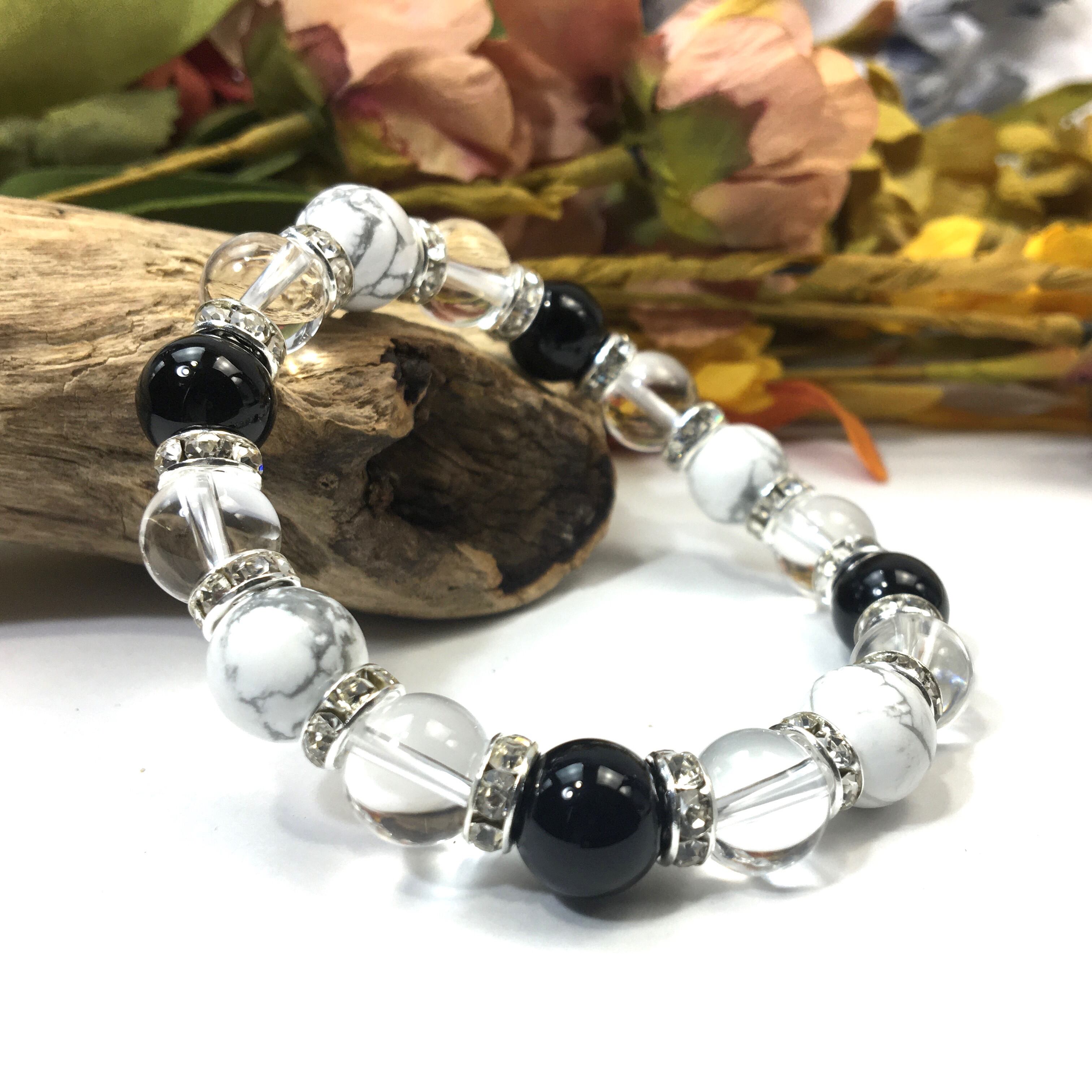 こちらは、ハウライトと水晶とオニキスを組み合わせたブレスレットです。間にはロンデルを挟み高級感あるデザインに仕上がっています。石大きさは腕にも馴染みやすいように10mm玉で内周約16cmです。数に限りがございますので気になる方はお早めにどうぞ。