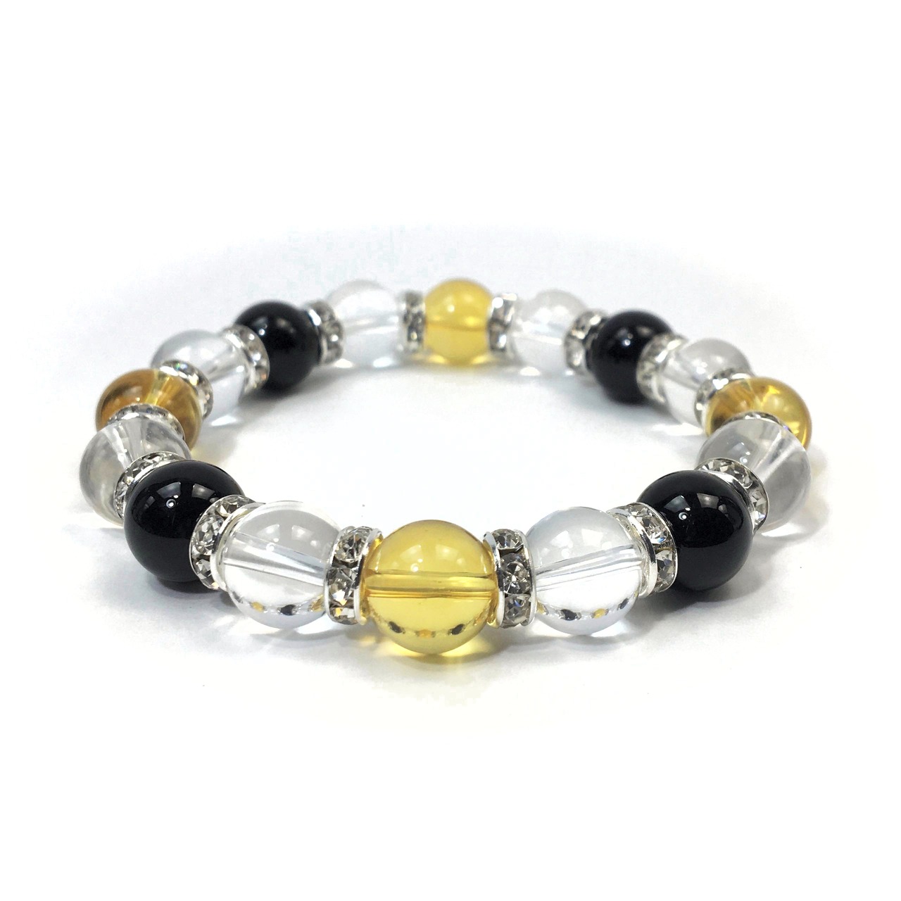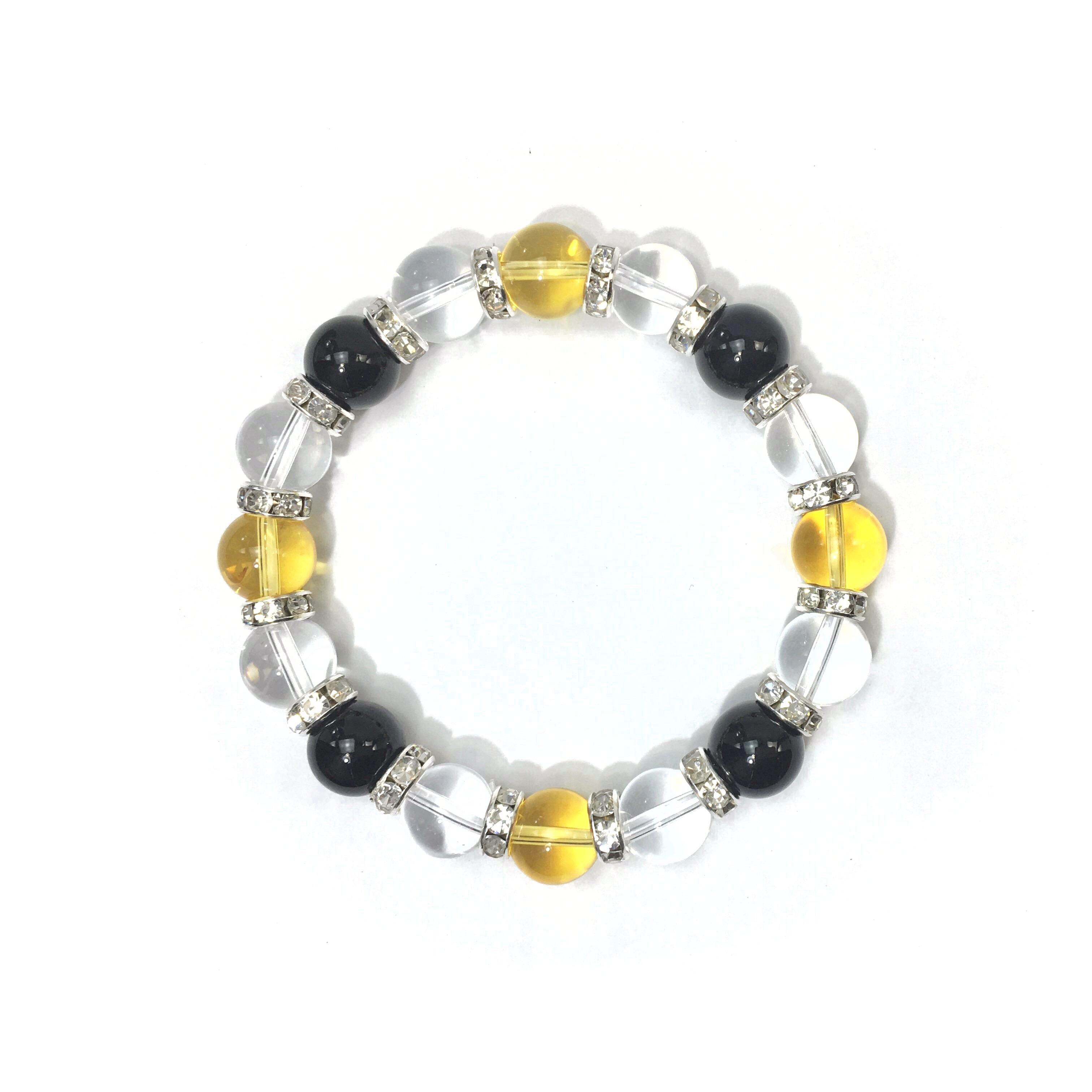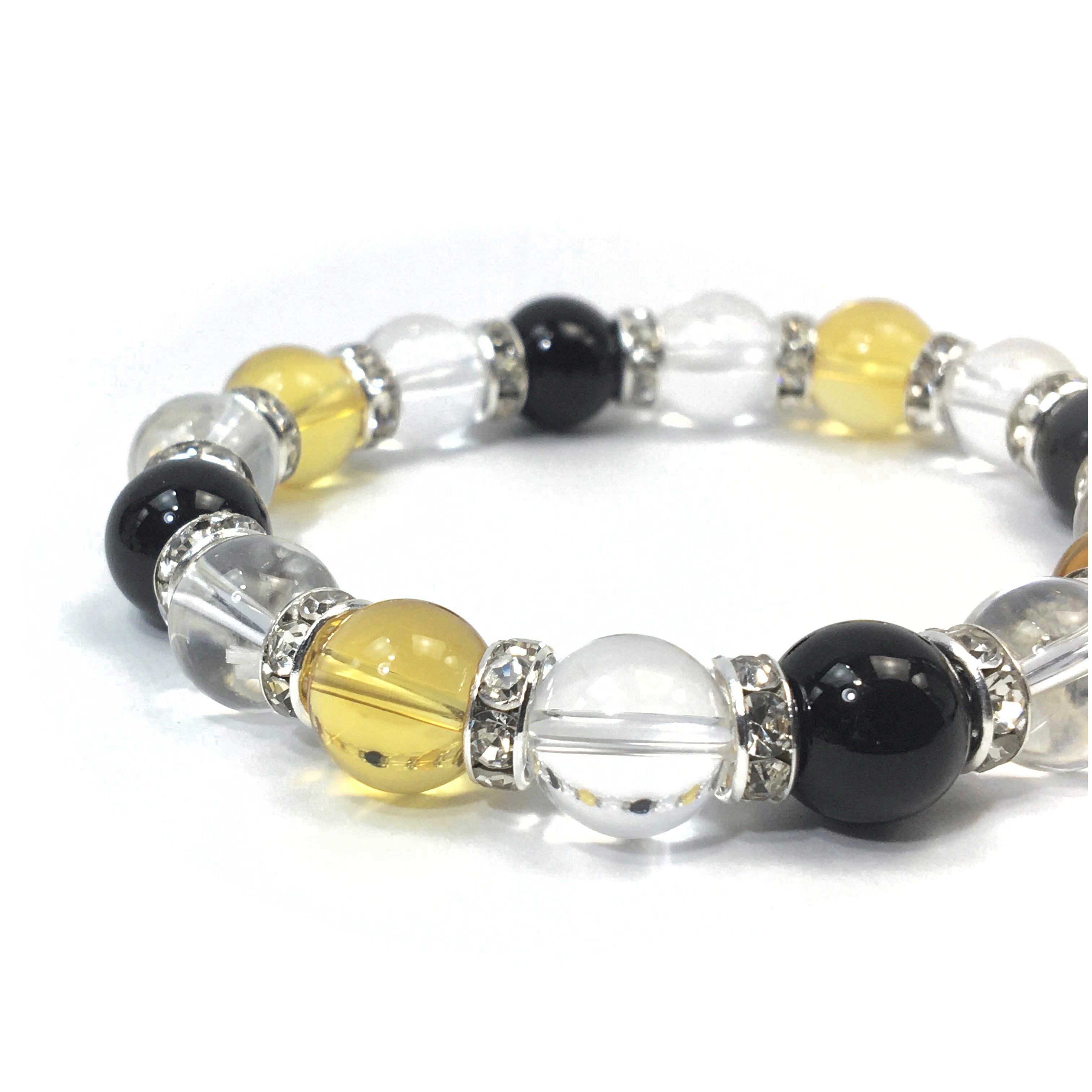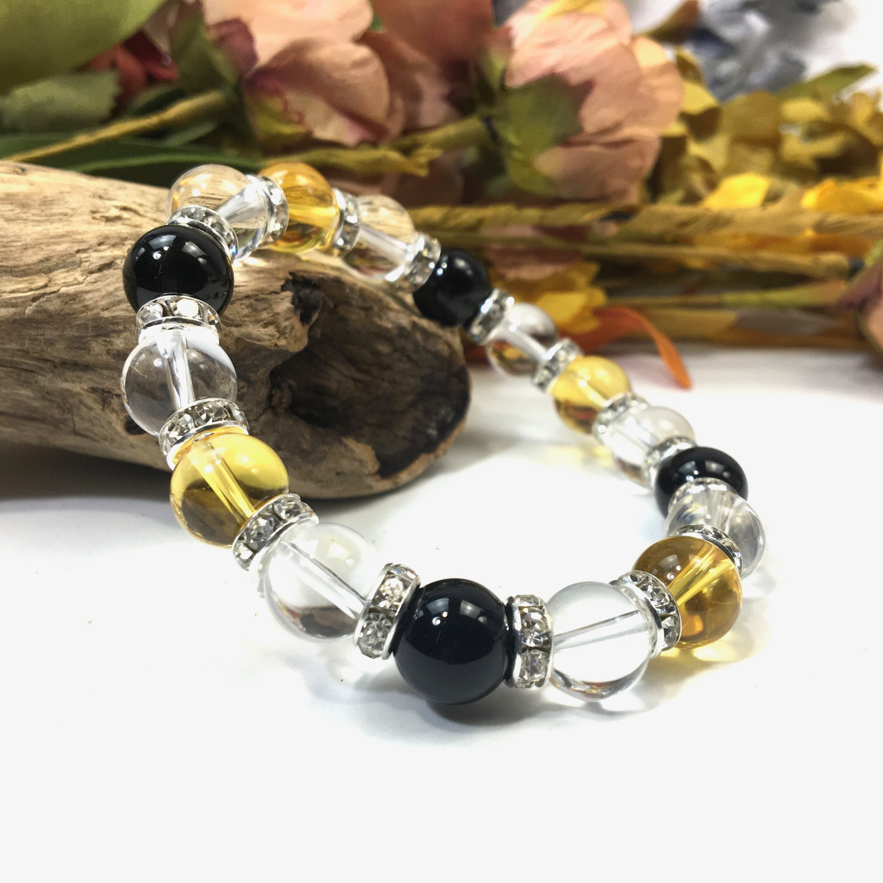 こちらは、シトリンと水晶とオニキスを組み合わせたブレスレットです。間にはロンデルを挟み高級感あるデザインに仕上がっています。石大きさは腕にも馴染みやすいように10mm玉で内周約16cmです。数に限りがございますので気になる方はお早めにどうぞ。