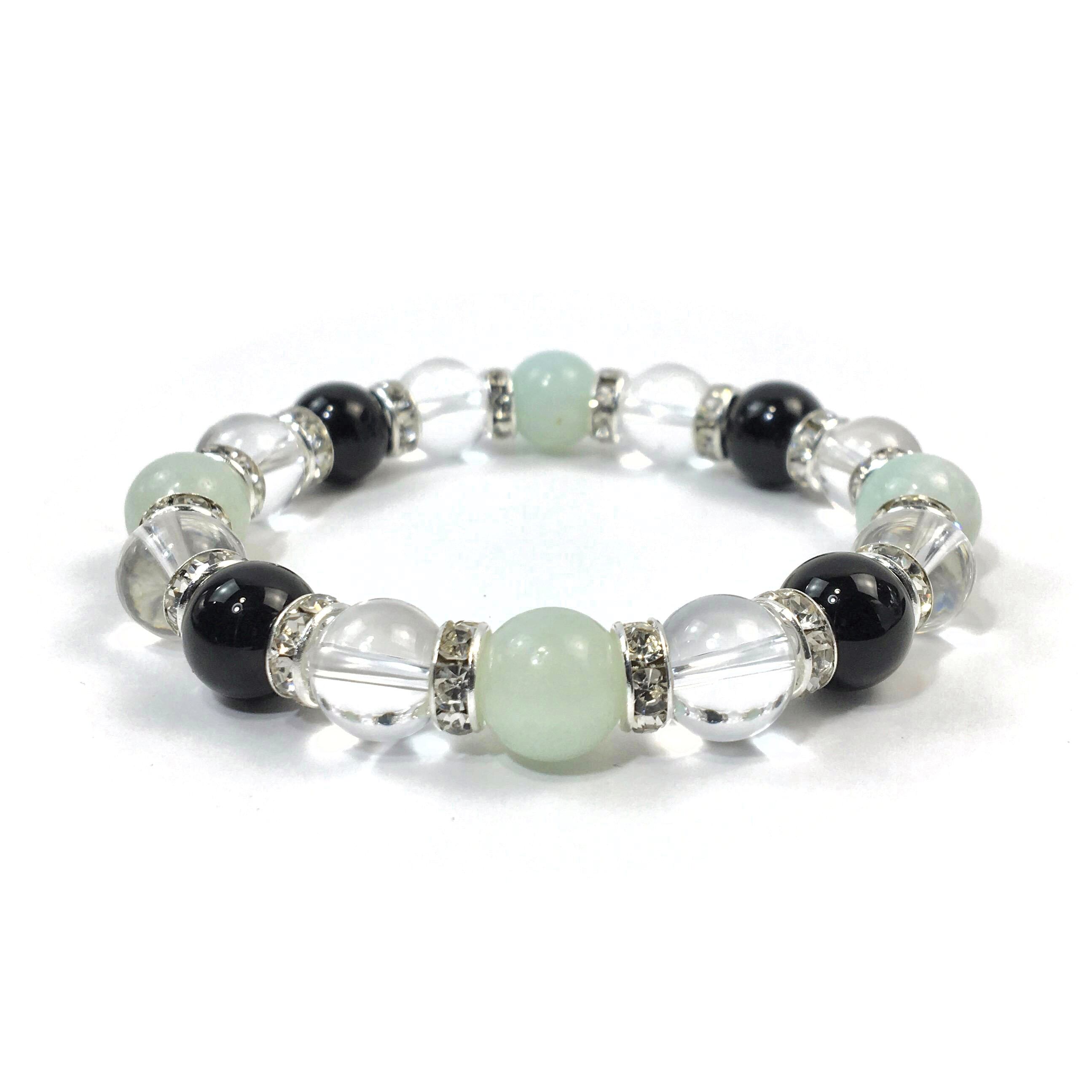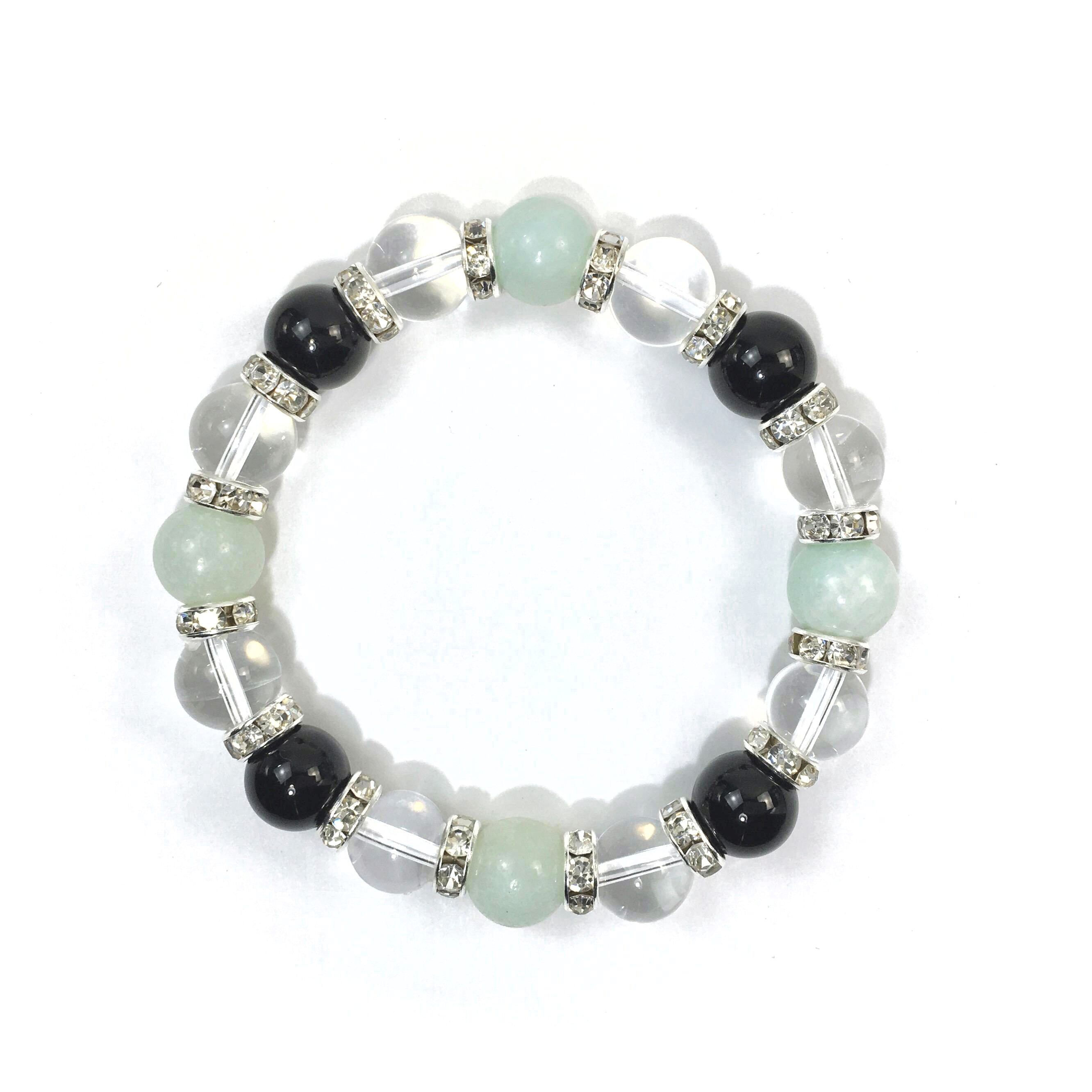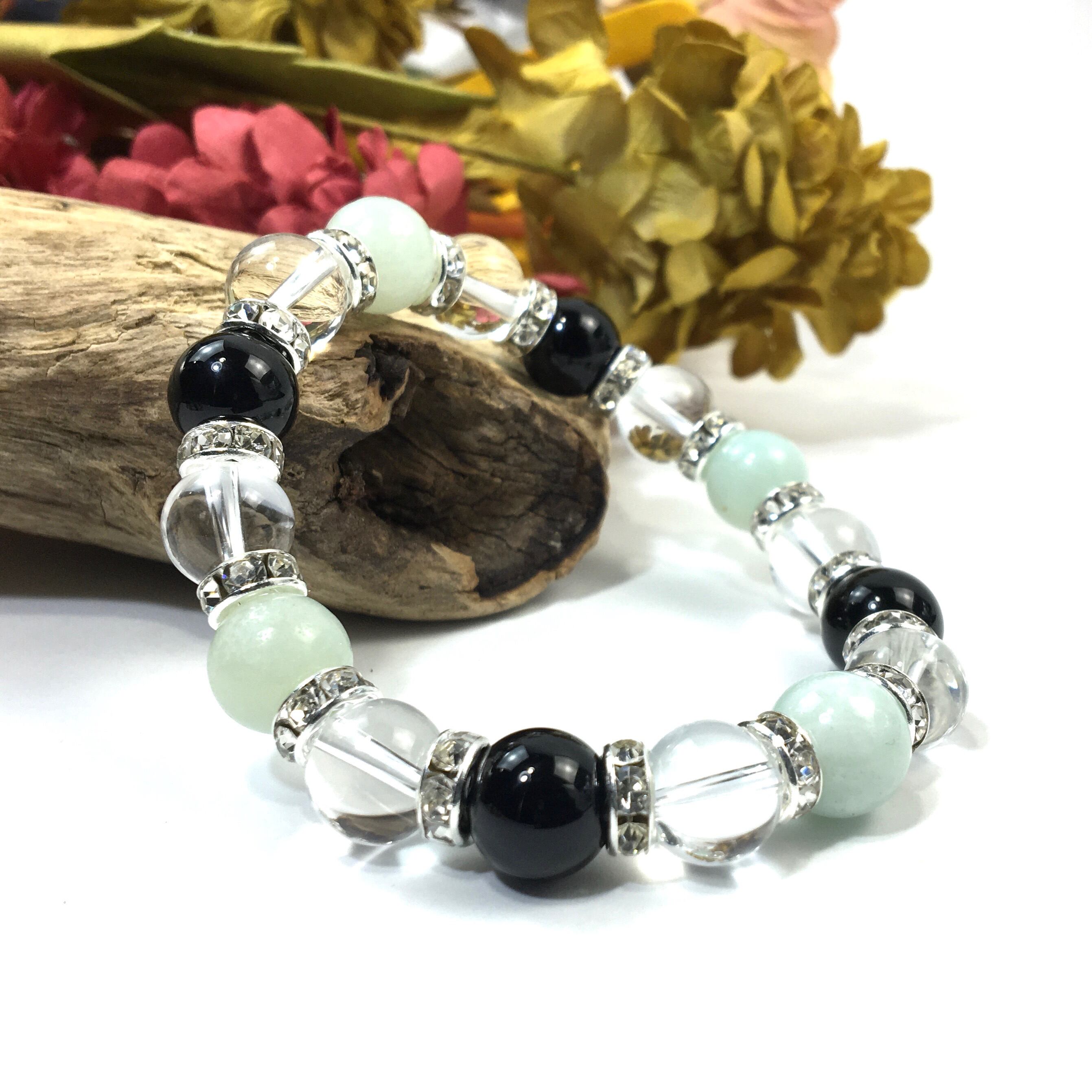 こちらは、アマゾナイトと水晶とオニキスを組み合わせたブレスレットです。間にはロンデルを挟み高級感あるデザインに仕上がっています。石大きさは腕にも馴染みやすいように10mm玉で内周約16cmです。数に限りがございますので気になる方はお早めにどうぞ。