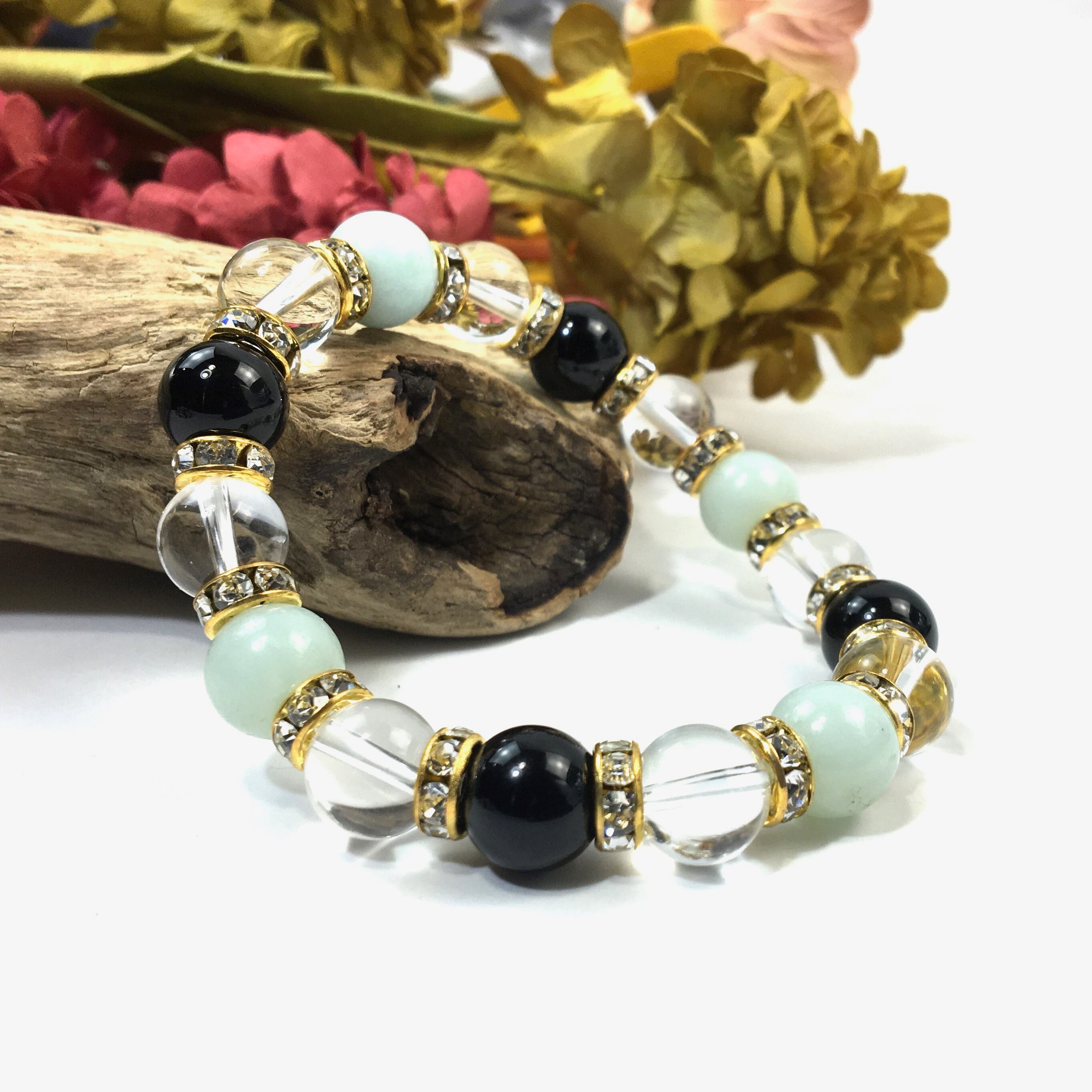 こちらは、アマゾナイトと水晶とオニキスを組み合わせたブレスレットです。間にはロンデルを挟み高級感あるデザインに仕上がっています。石大きさは腕にも馴染みやすいように10mm玉で内周約16cmです。数に限りがございますので気になる方はお早めにどうぞ。