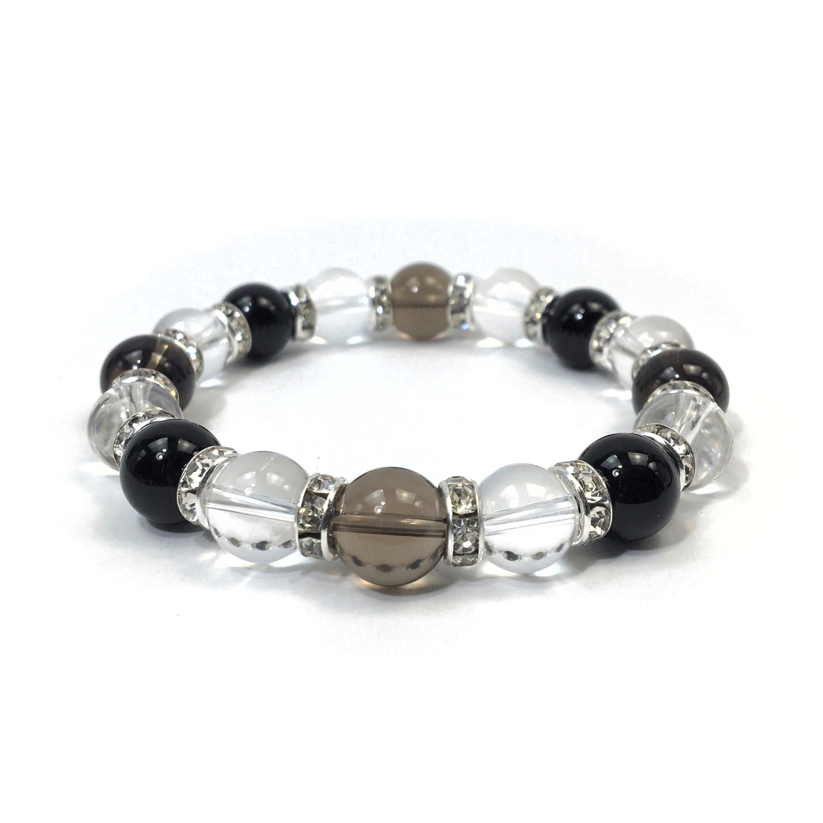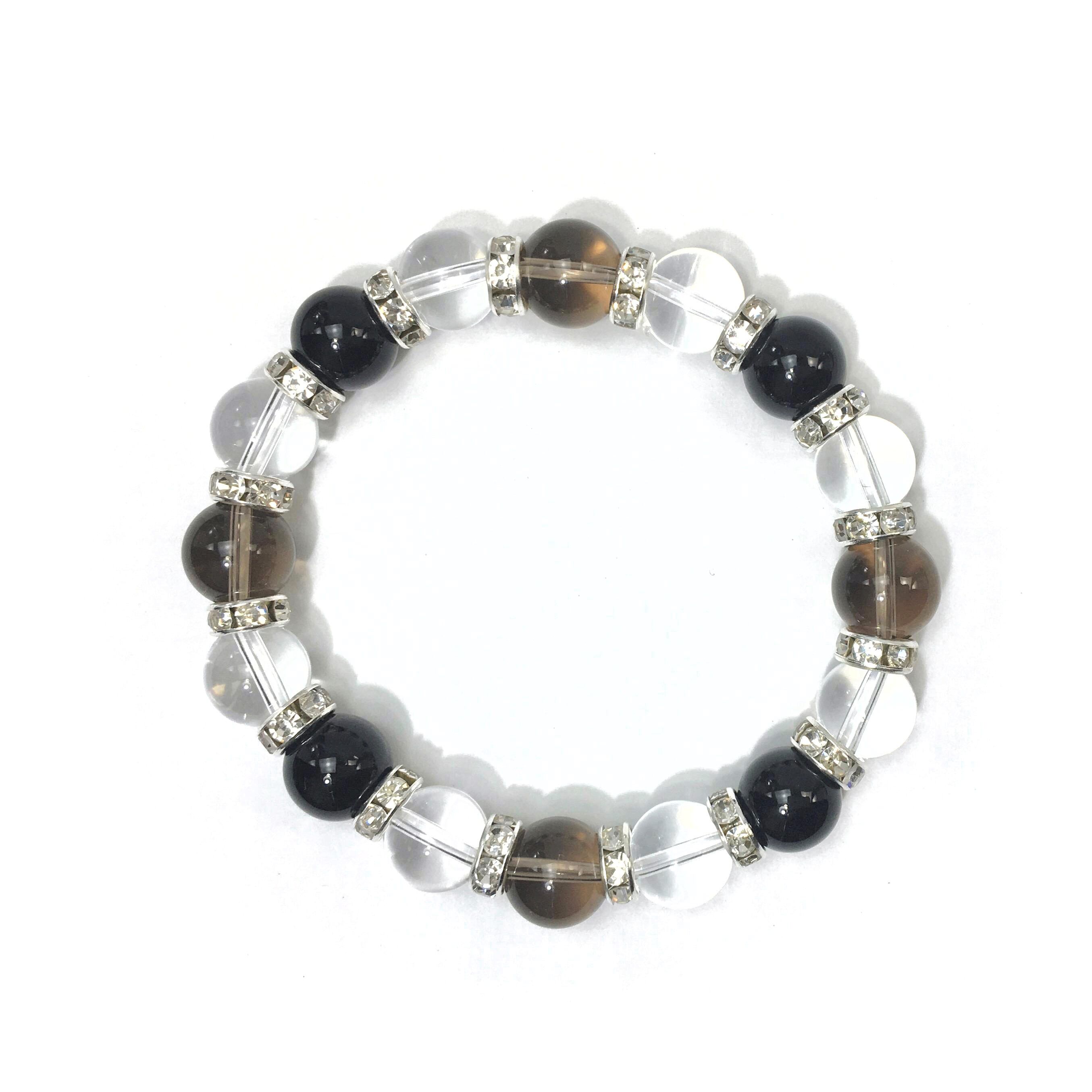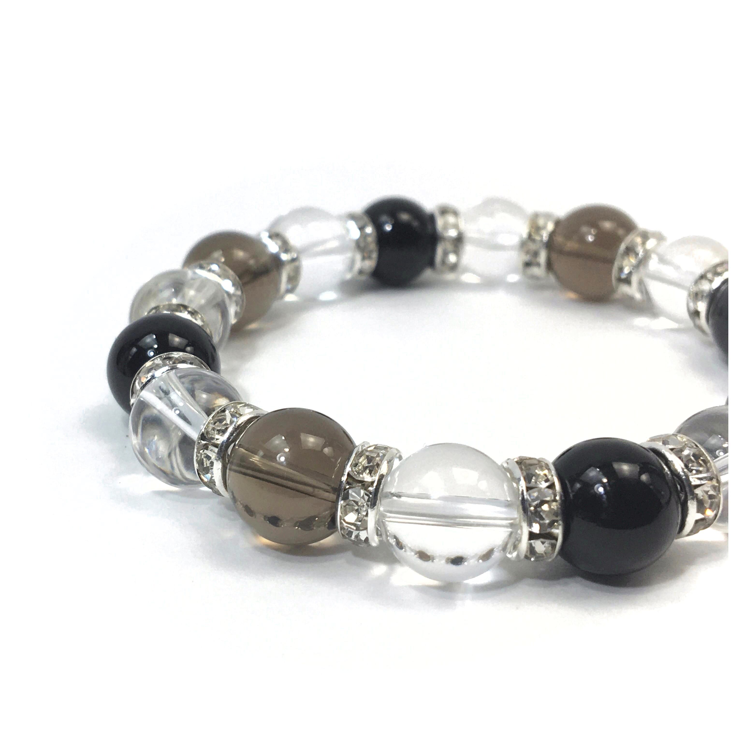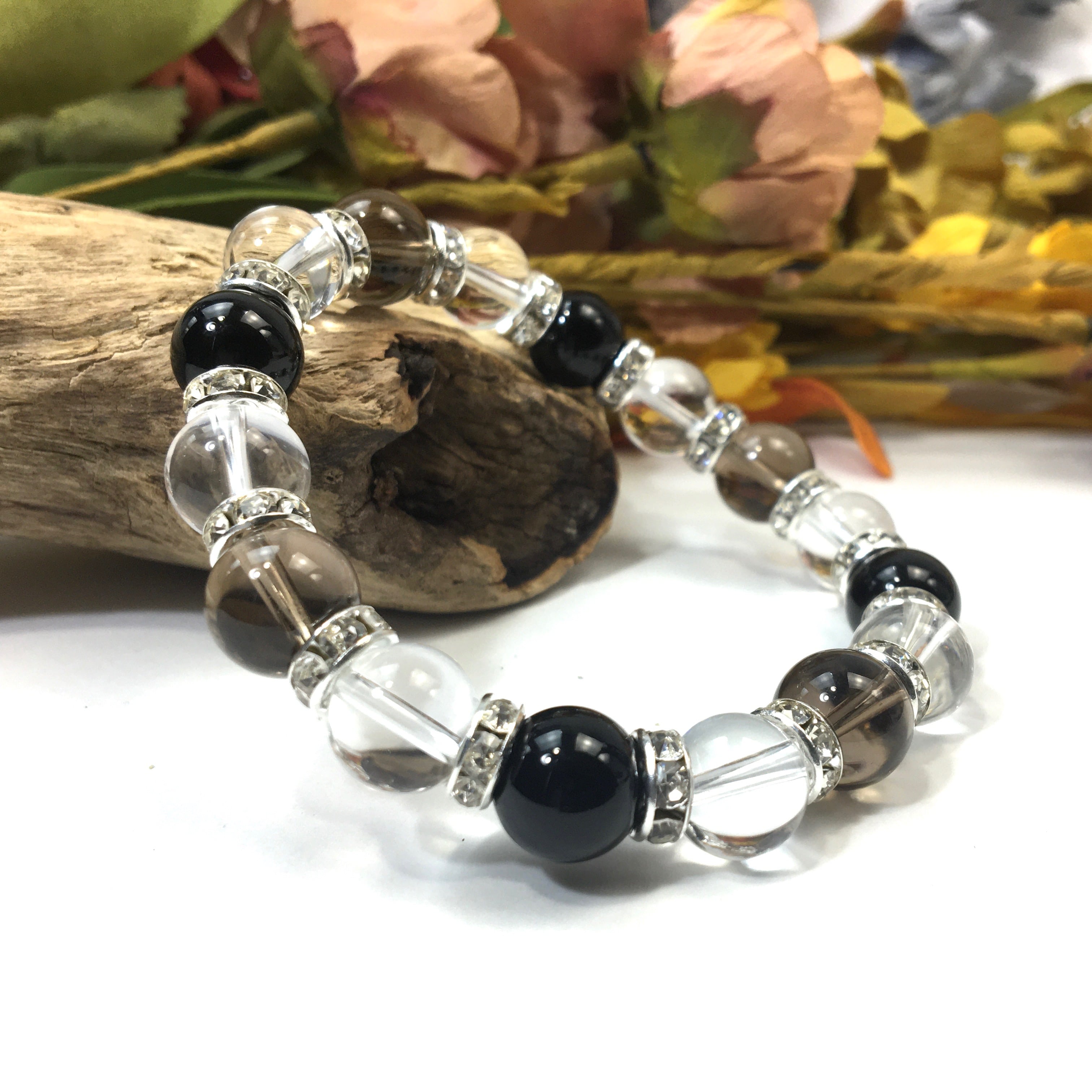 こちらは、スモーキークォーツと水晶とオニキスを組み合わせたブレスレットです。間にはロンデルを挟み高級感あるデザインに仕上がっています。石大きさは腕にも馴染みやすいように10mm玉で内周約16cmです。数に限りがございますので気になる方はお早めにどうぞ。