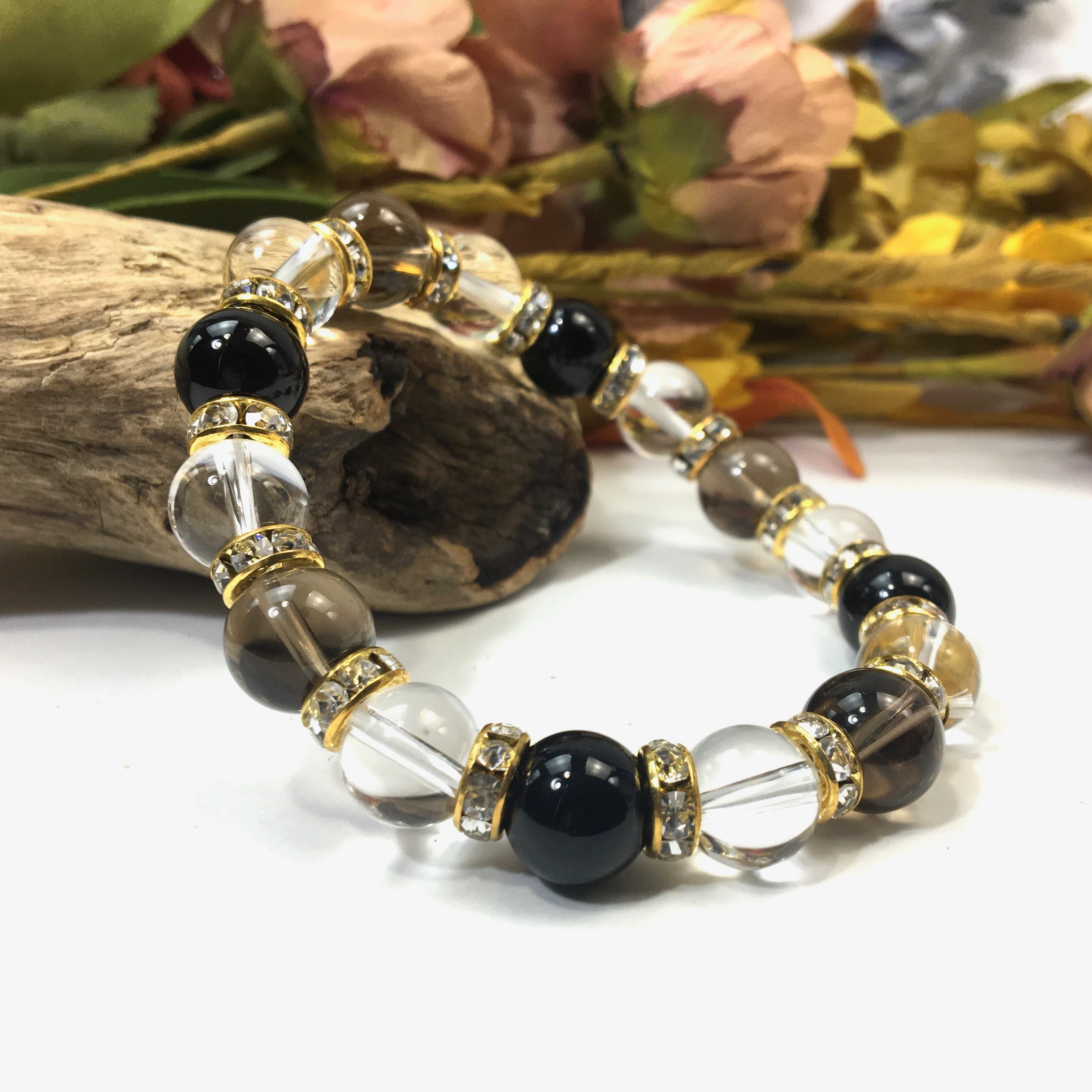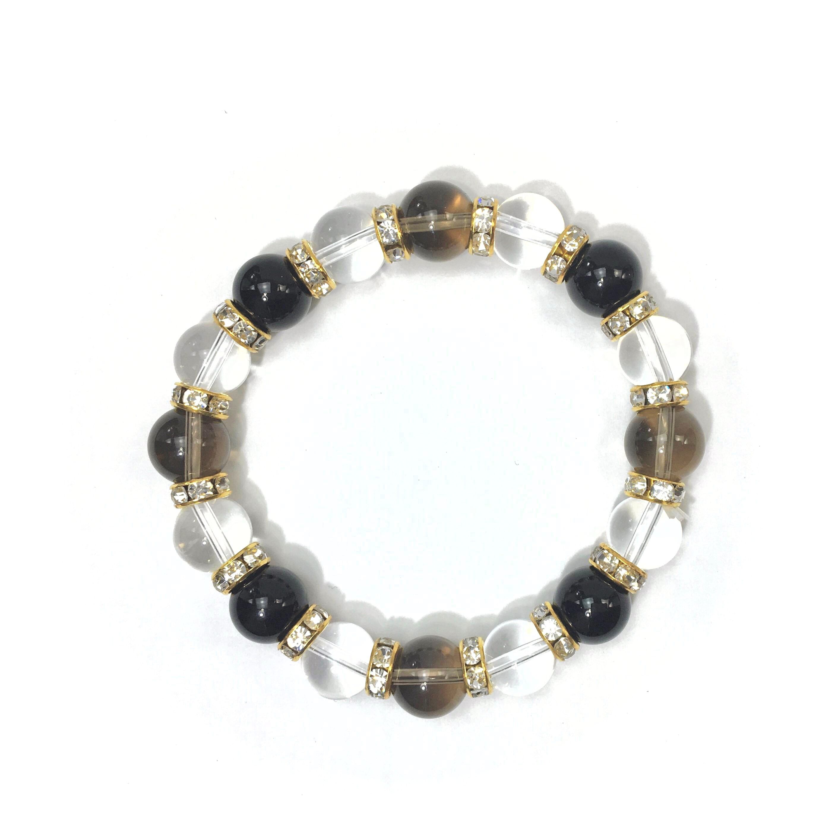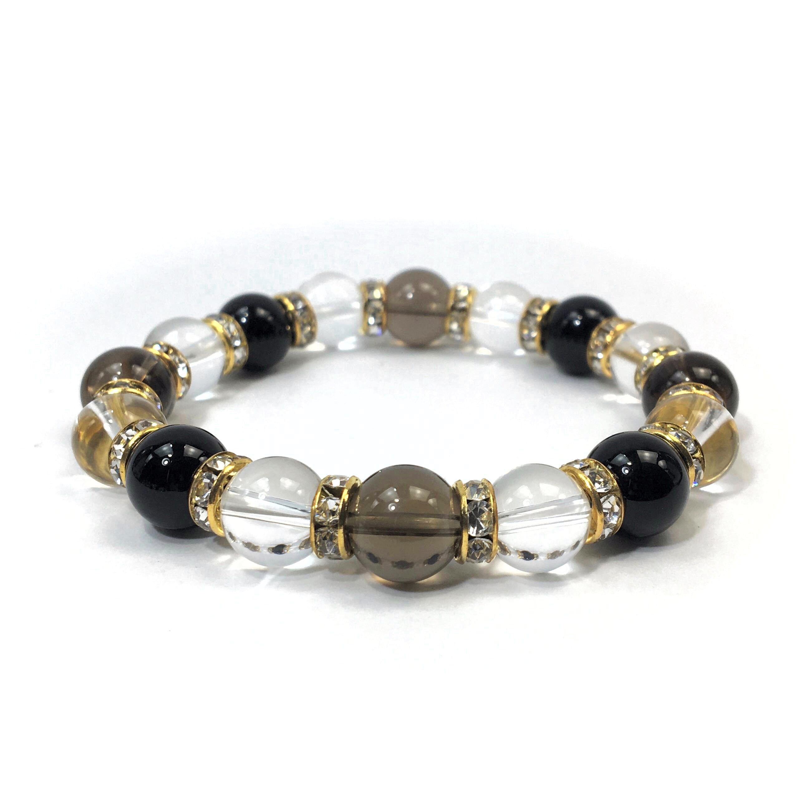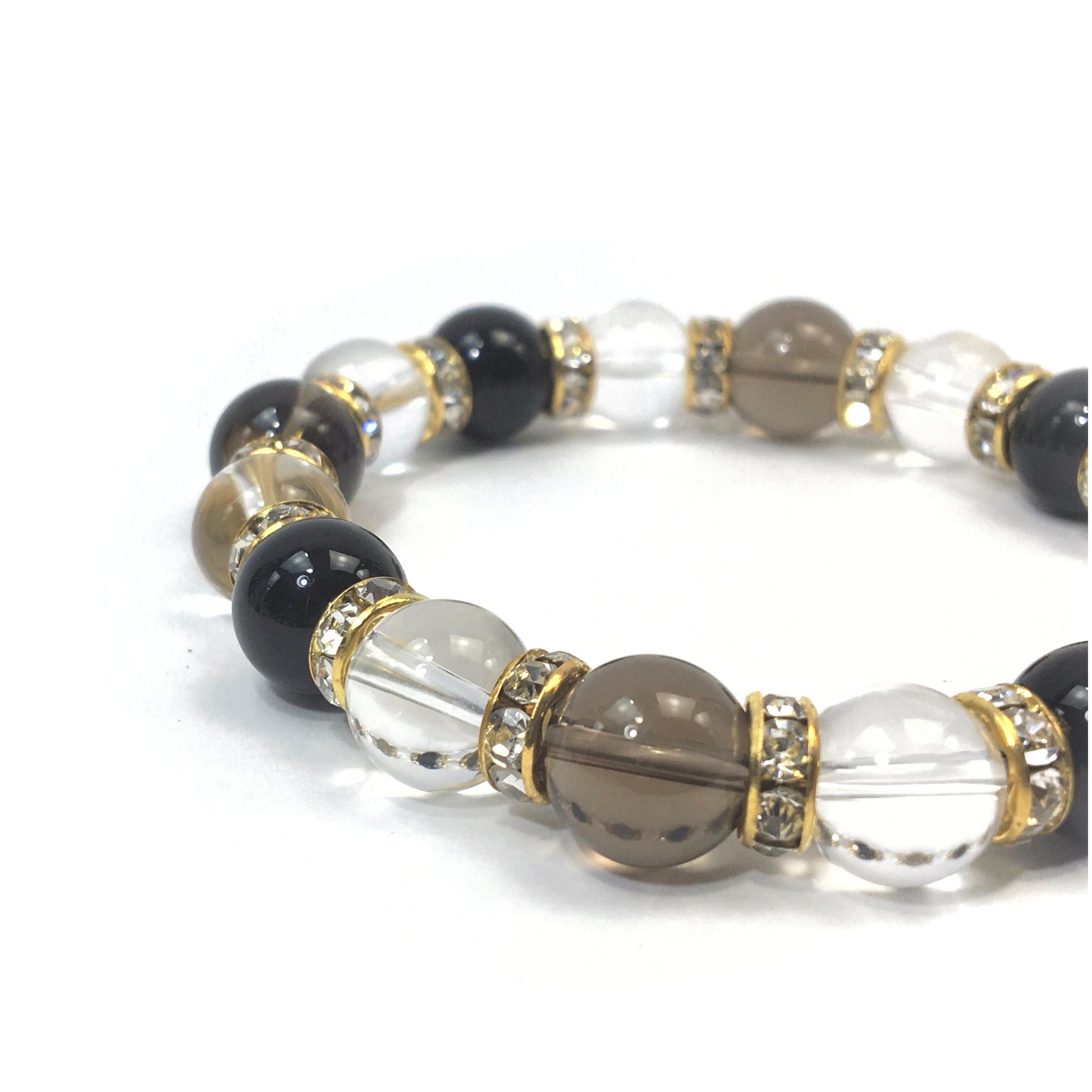 スモーキークォーツ×水晶×オニキス パワーストーン ブレスレット10mm(ゴールド)メンズ・レディース 男性・女性 数珠ブレス 開運 ☆