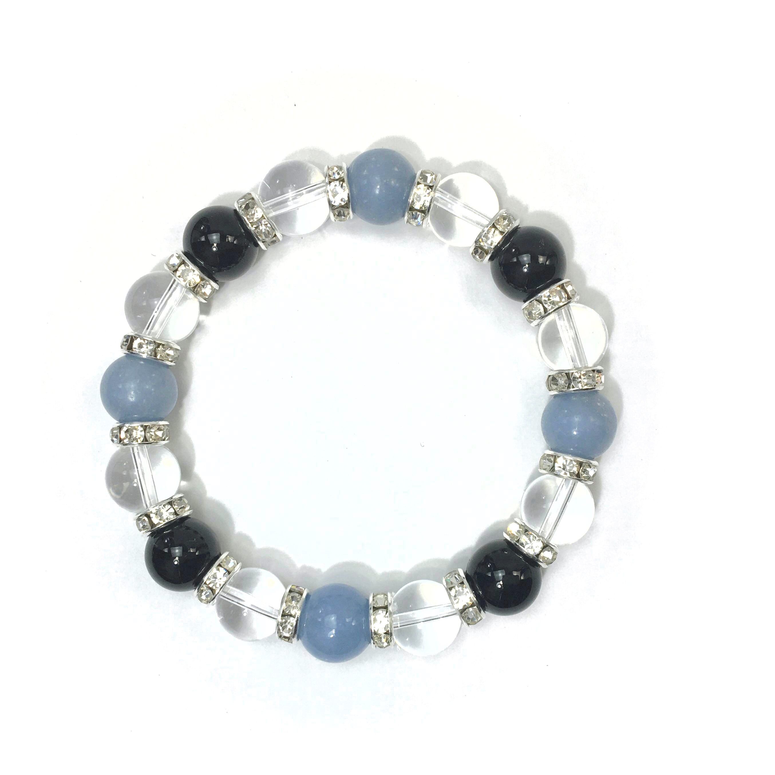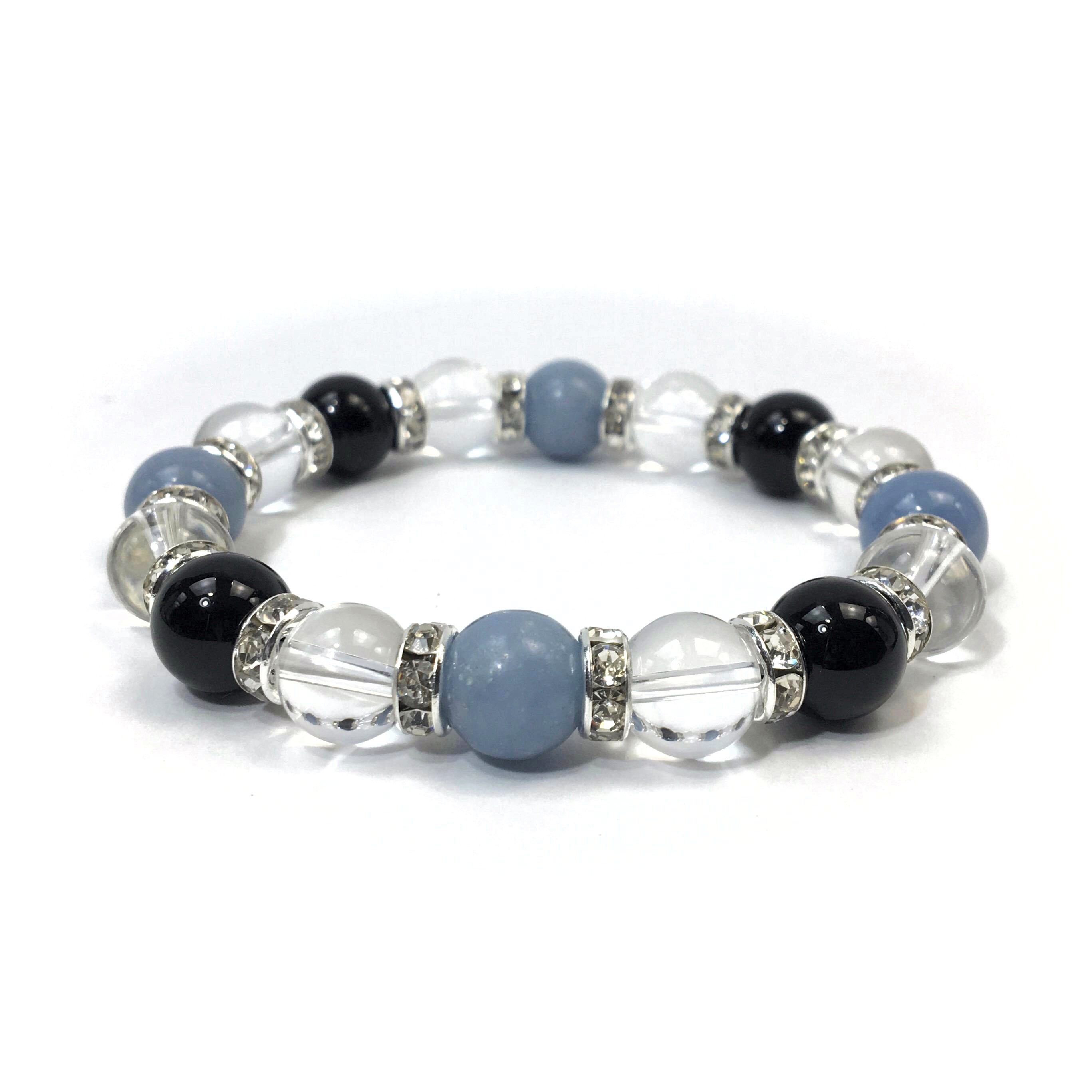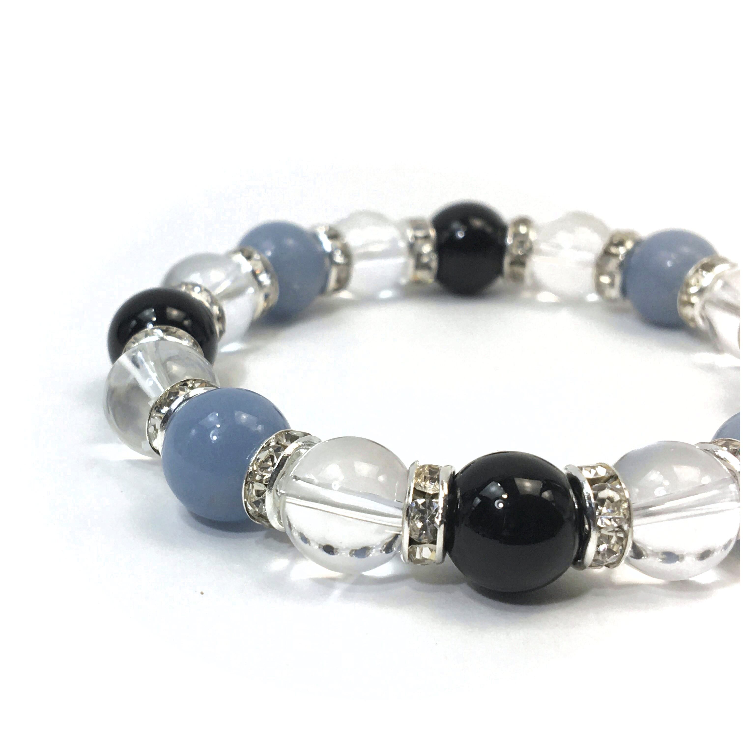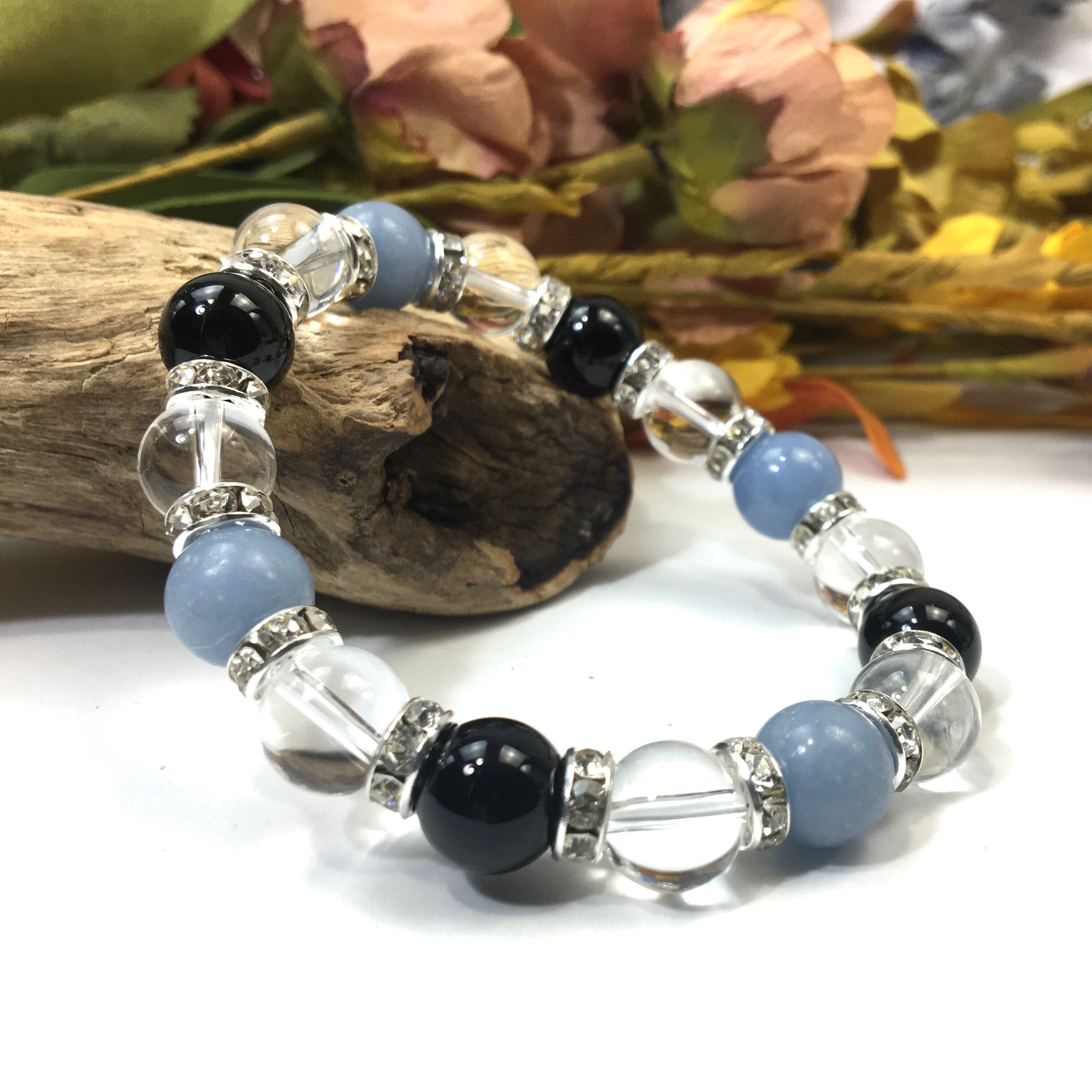 こちらは、エンジェライトと水晶とオニキスを組み合わせたブレスレットです。間にはロンデルを挟み高級感あるデザインに仕上がっています。石大きさは腕にも馴染みやすいように10mm玉で内周約16cmです。数に限りがございますので気になる方はお早めにどうぞ。