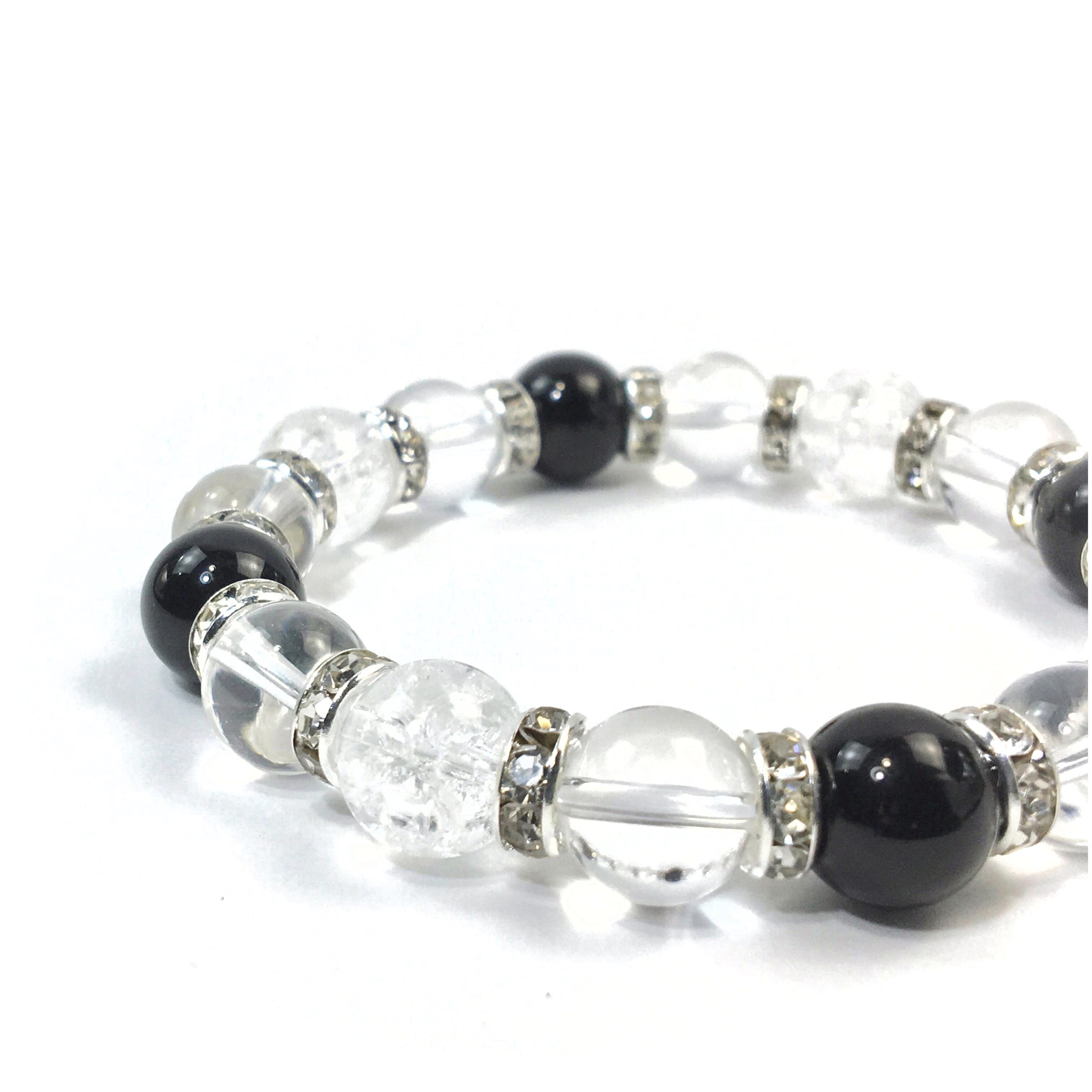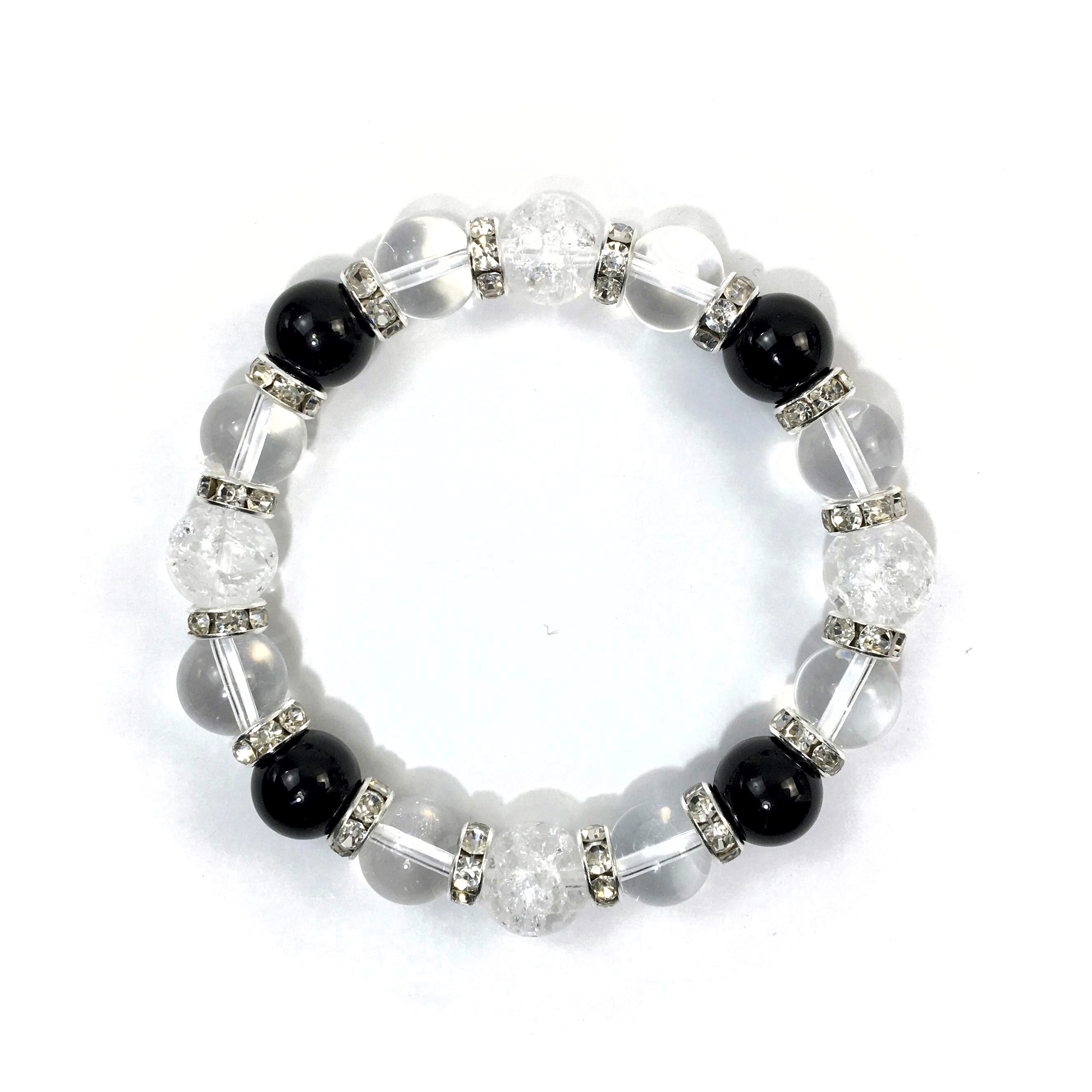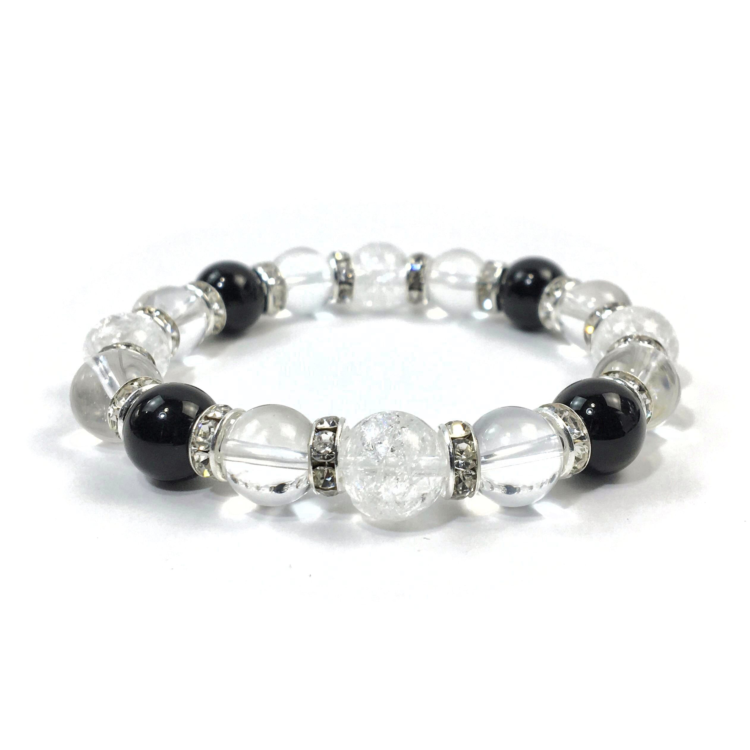 こちらは、クラック水晶と水晶とオニキスを組み合わせたブレスレットです。間にはロンデルを挟み高級感あるデザインに仕上がっています。石大きさは腕にも馴染みやすいように10mm玉で内周約16cmです。数に限りがございますので気になる方はお早めにどうぞ。