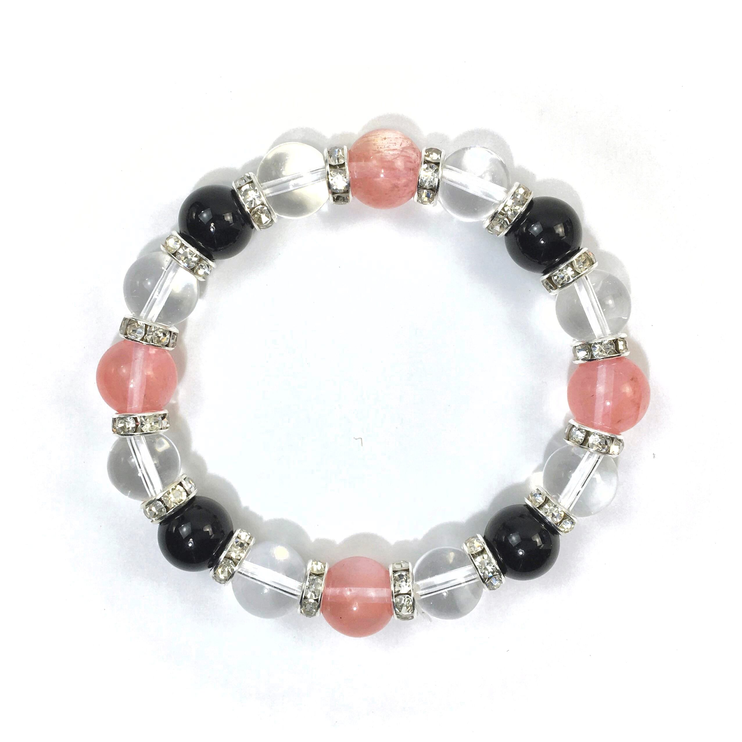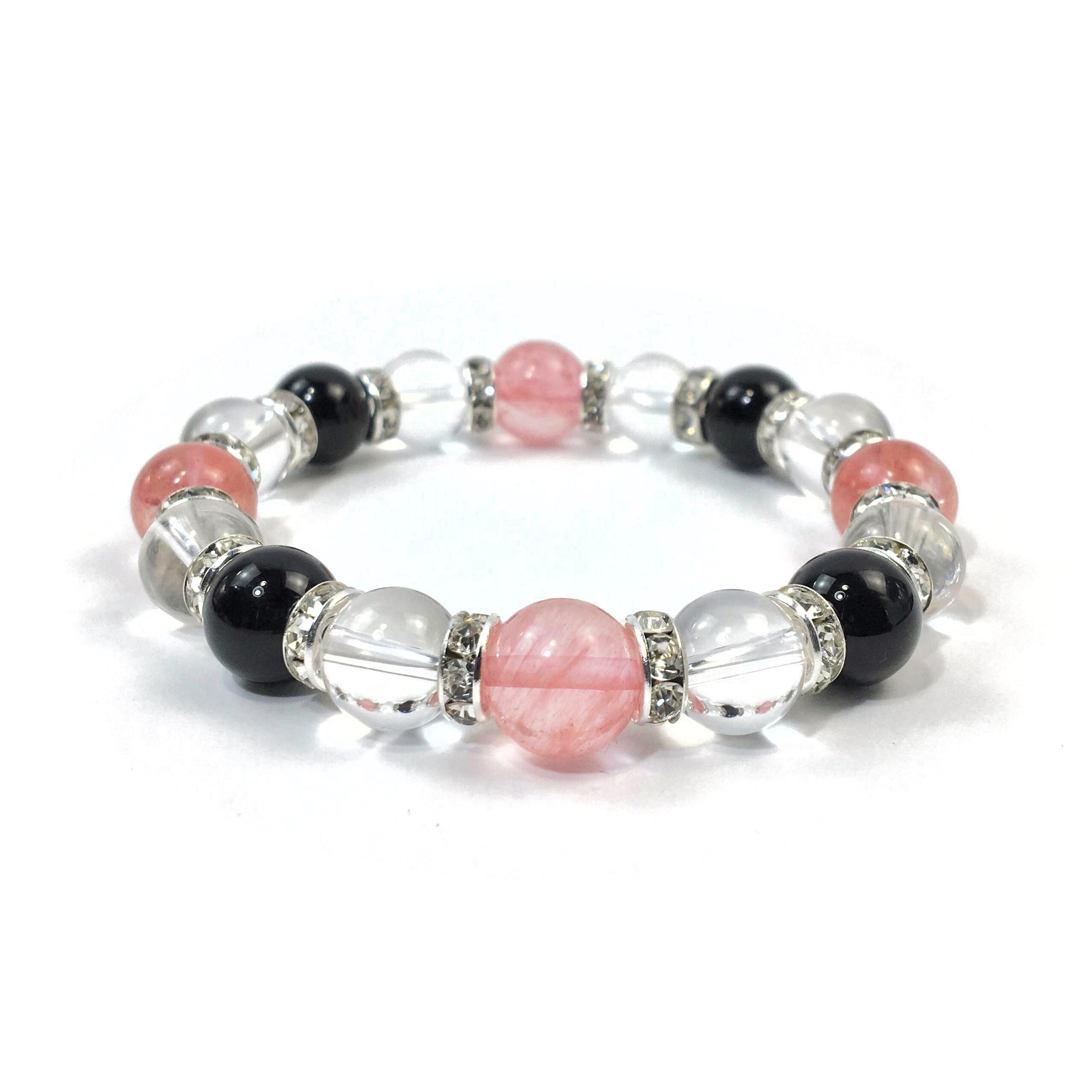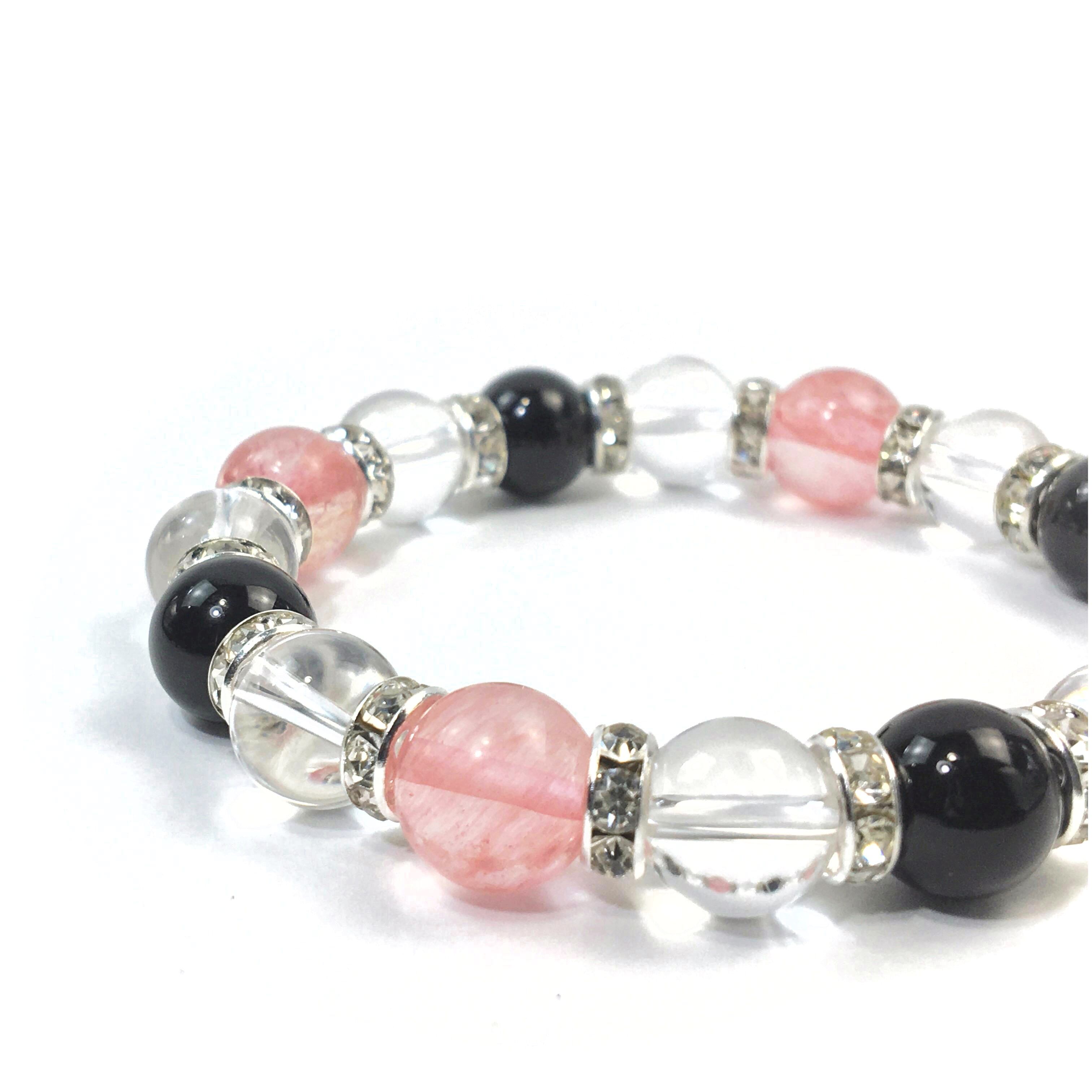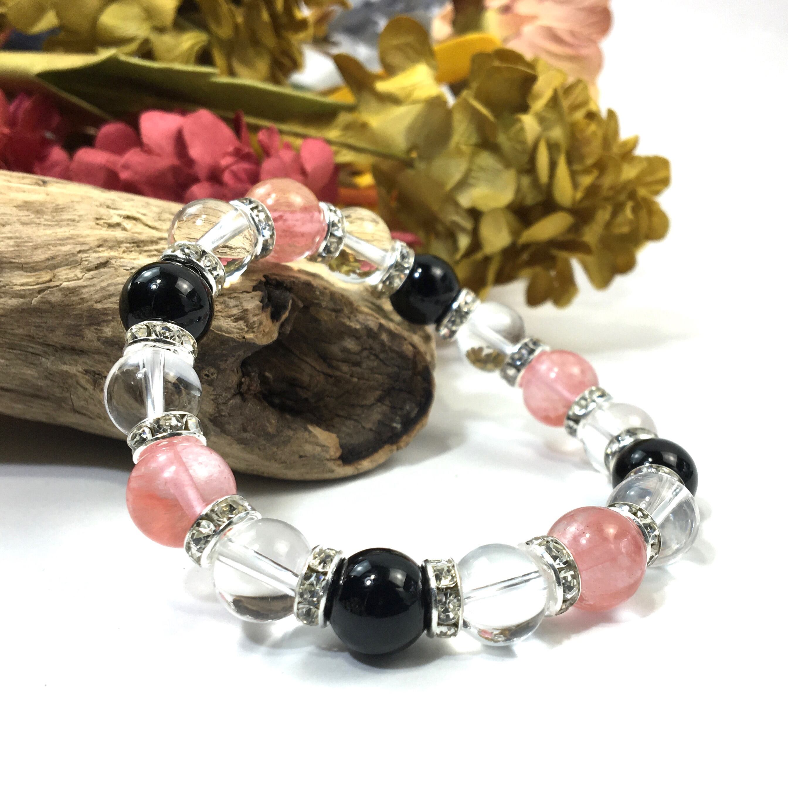 こちらは、チェリークォーツと水晶とオニキスを組み合わせたブレスレットです。間にはロンデルを挟み高級感あるデザインに仕上がっています。石大きさは腕にも馴染みやすいように10mm玉で内周約16cmです。数に限りがございますので気になる方はお早めにどうぞ。