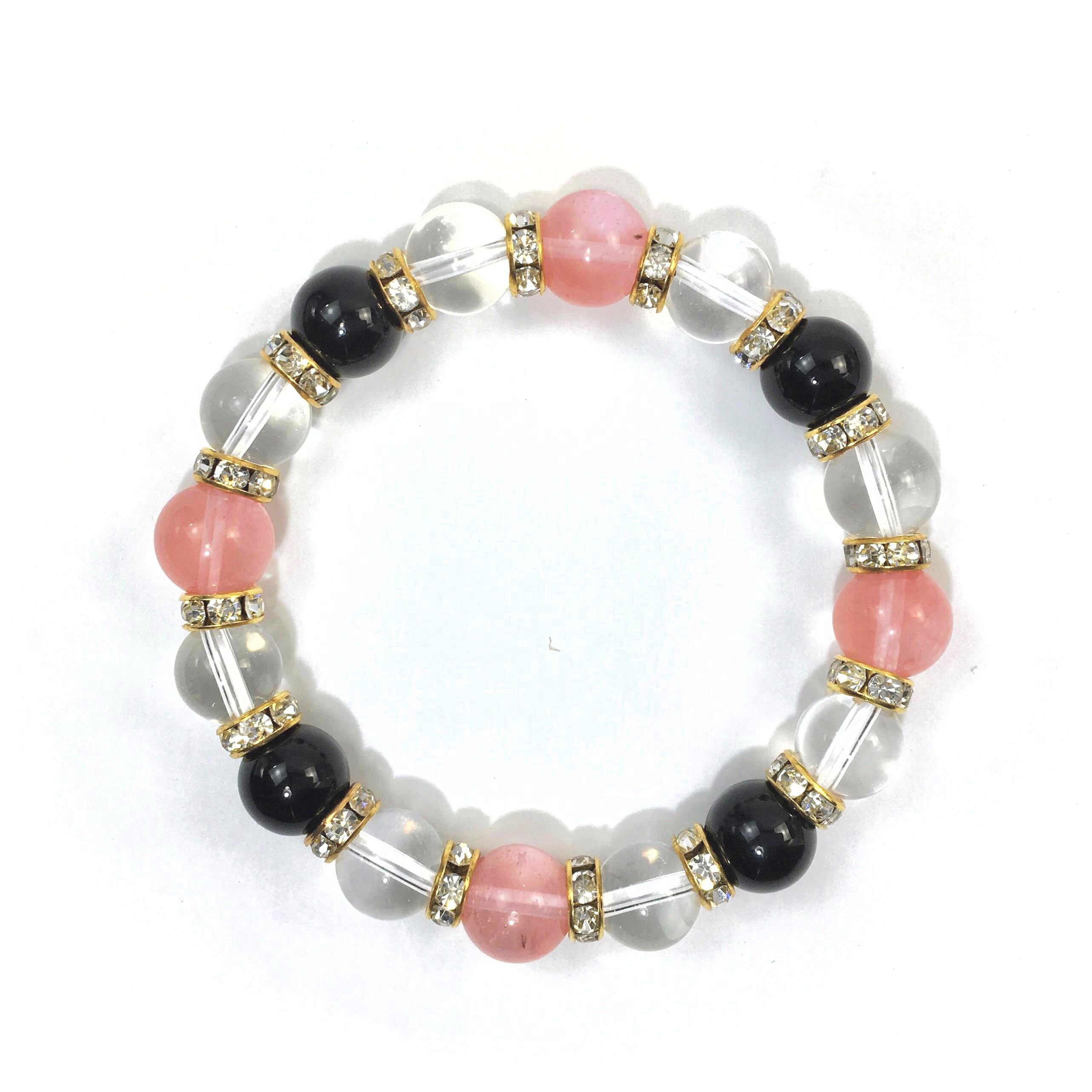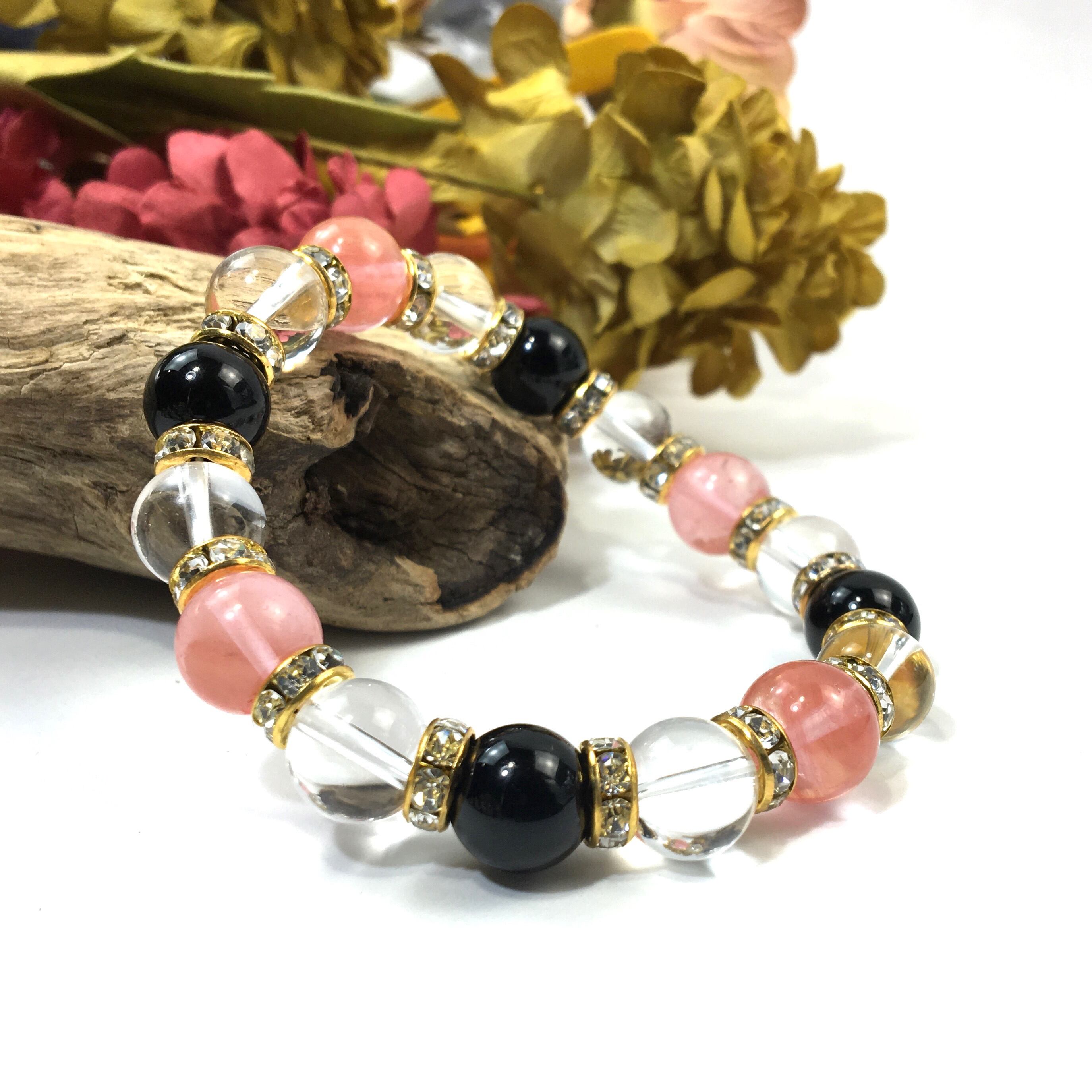 こちらは、チェリークォーツと水晶とオニキスを組み合わせたブレスレットです。間にはロンデルを挟み高級感あるデザインに仕上がっています。石大きさは腕にも馴染みやすいように10mm玉で内周約16cmです。数に限りがございますので気になる方はお早めにどうぞ。